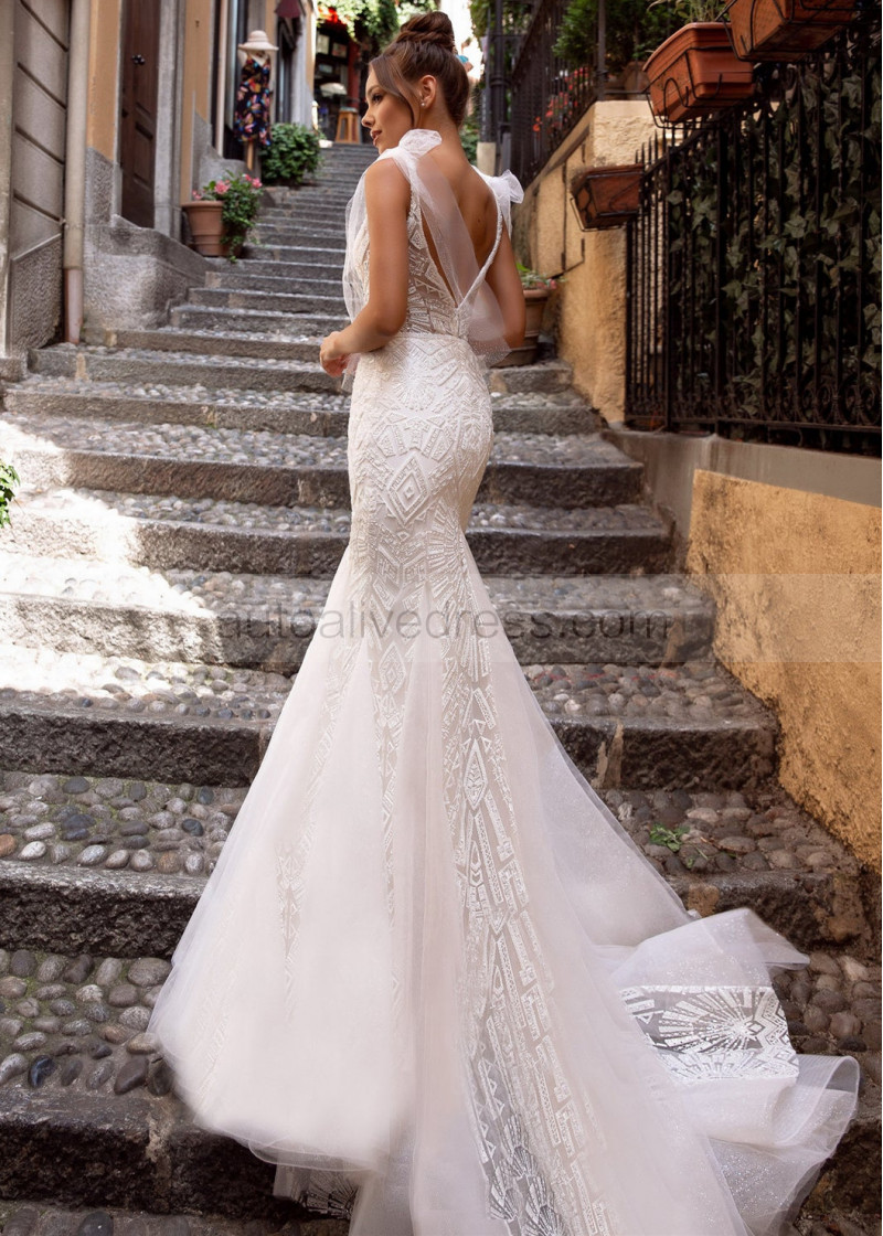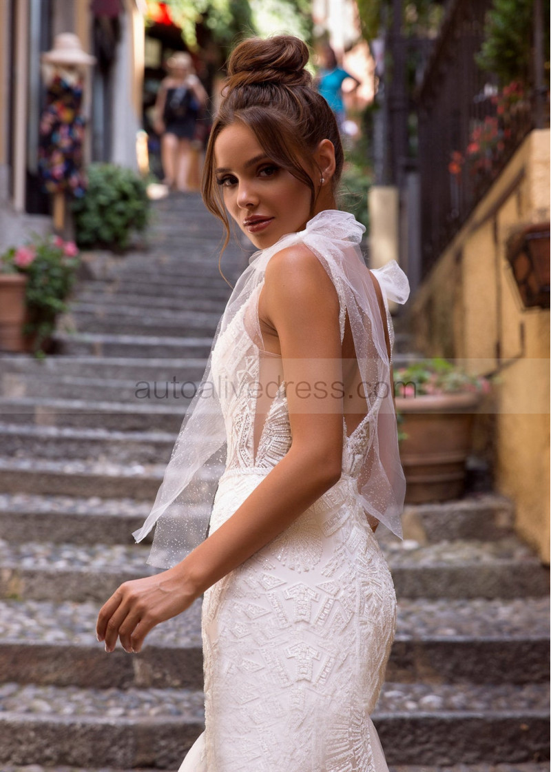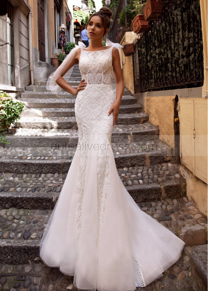 Boat Neck Ivory Lace Tulle Wedding Dress