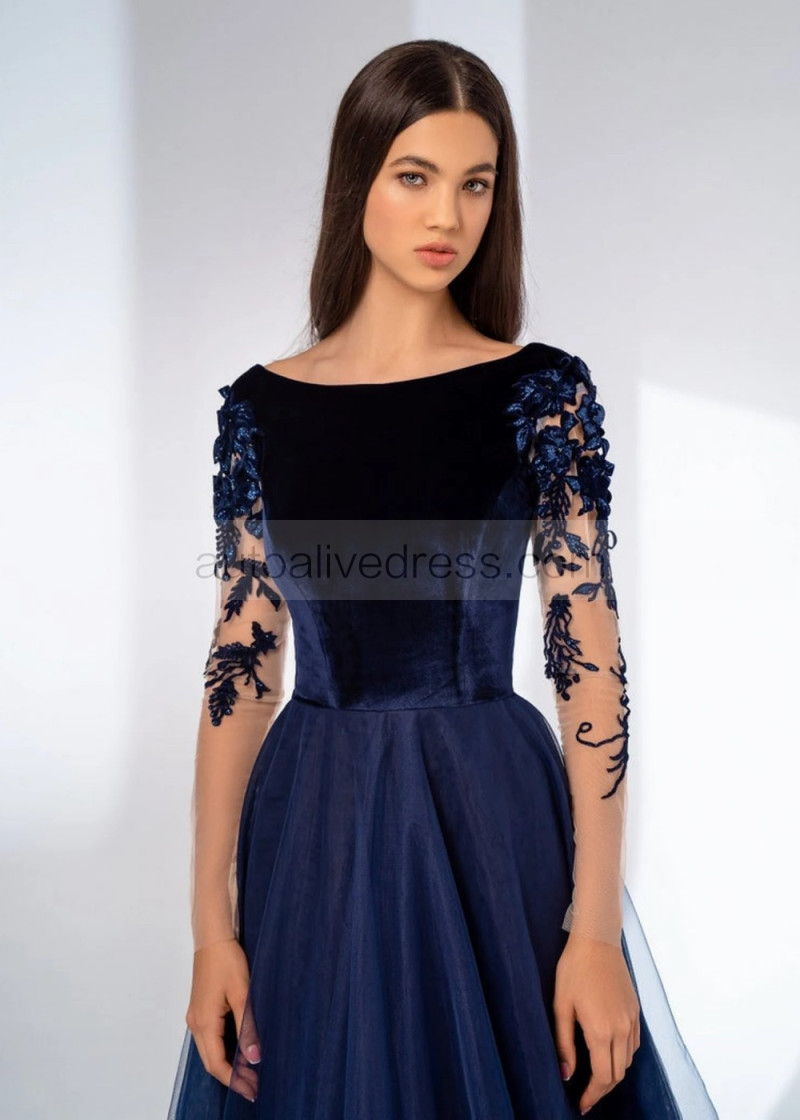 Boat Neck Navy Blue Velvet Tulle Unique Evening Dress