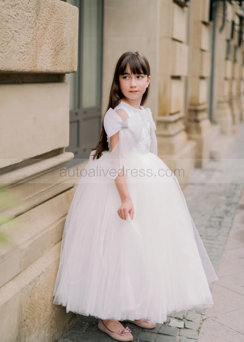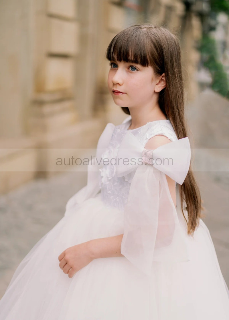 Bow Sleeves White Lace Tulle Flower Girl Dress