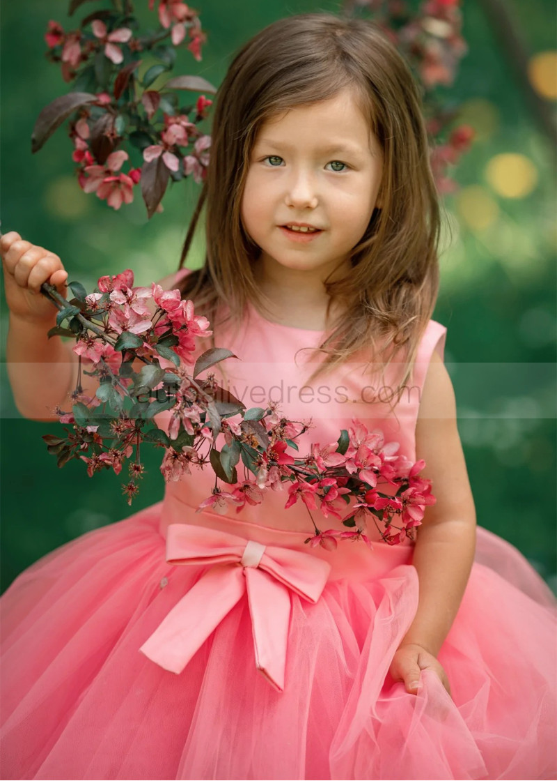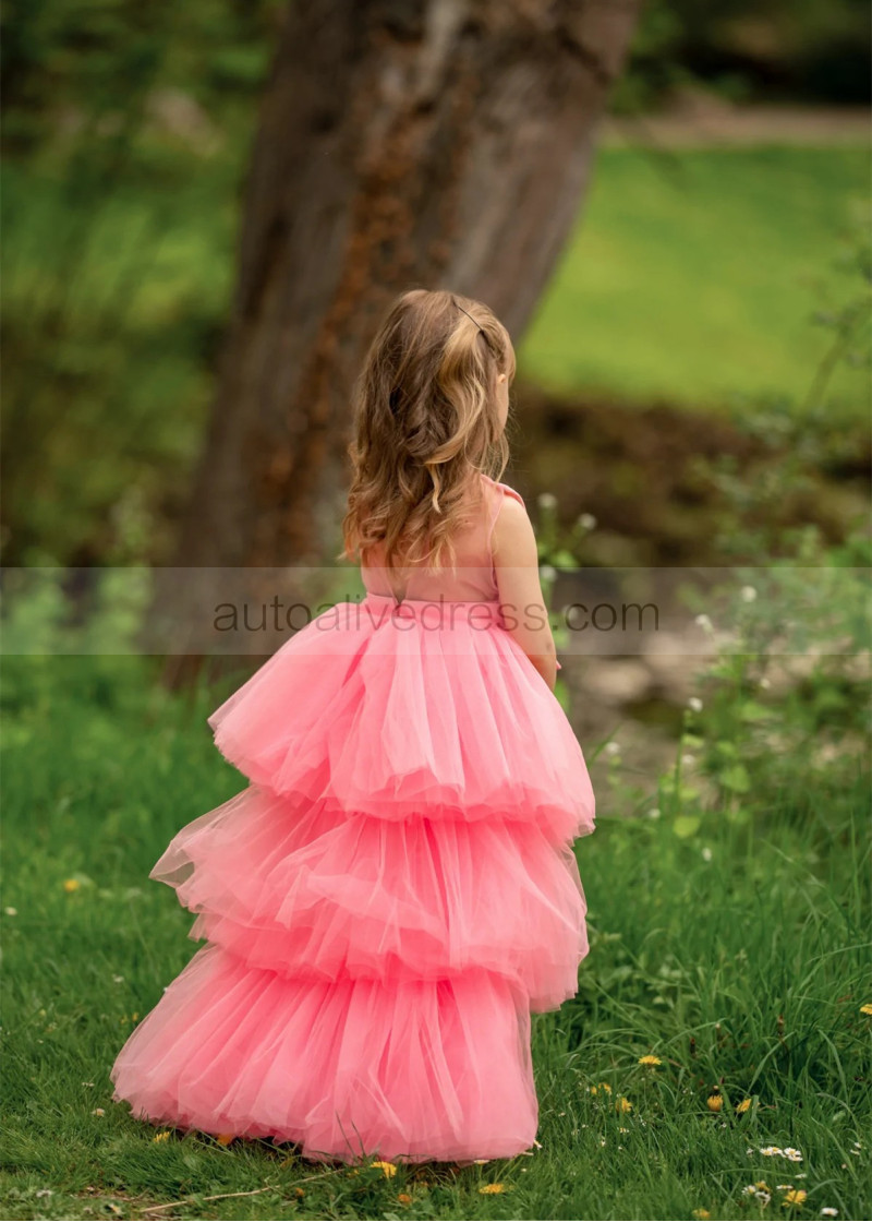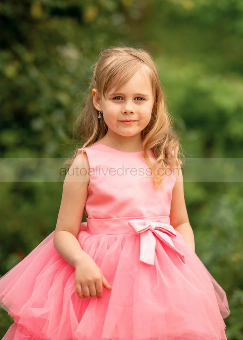 Bright Pink Satin Tulle High Low Flower Girl Dress