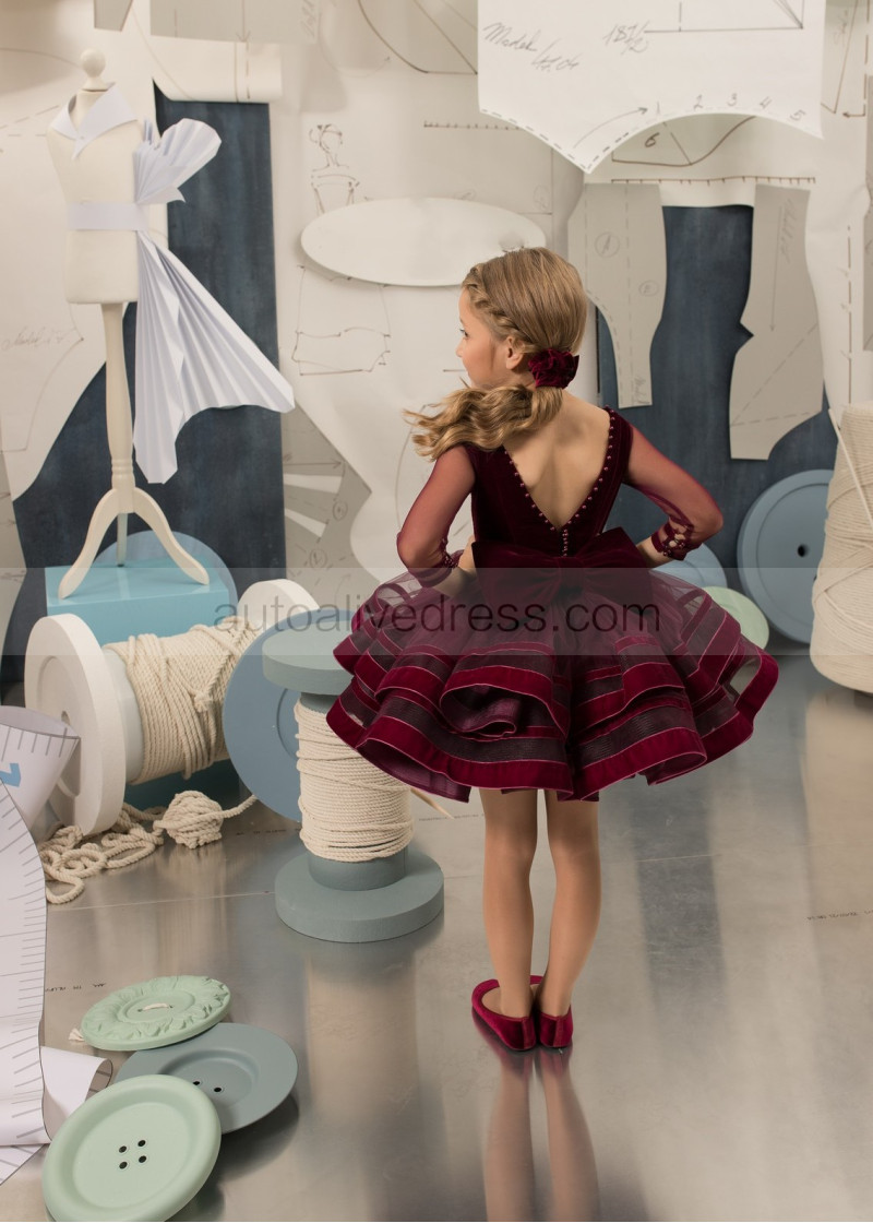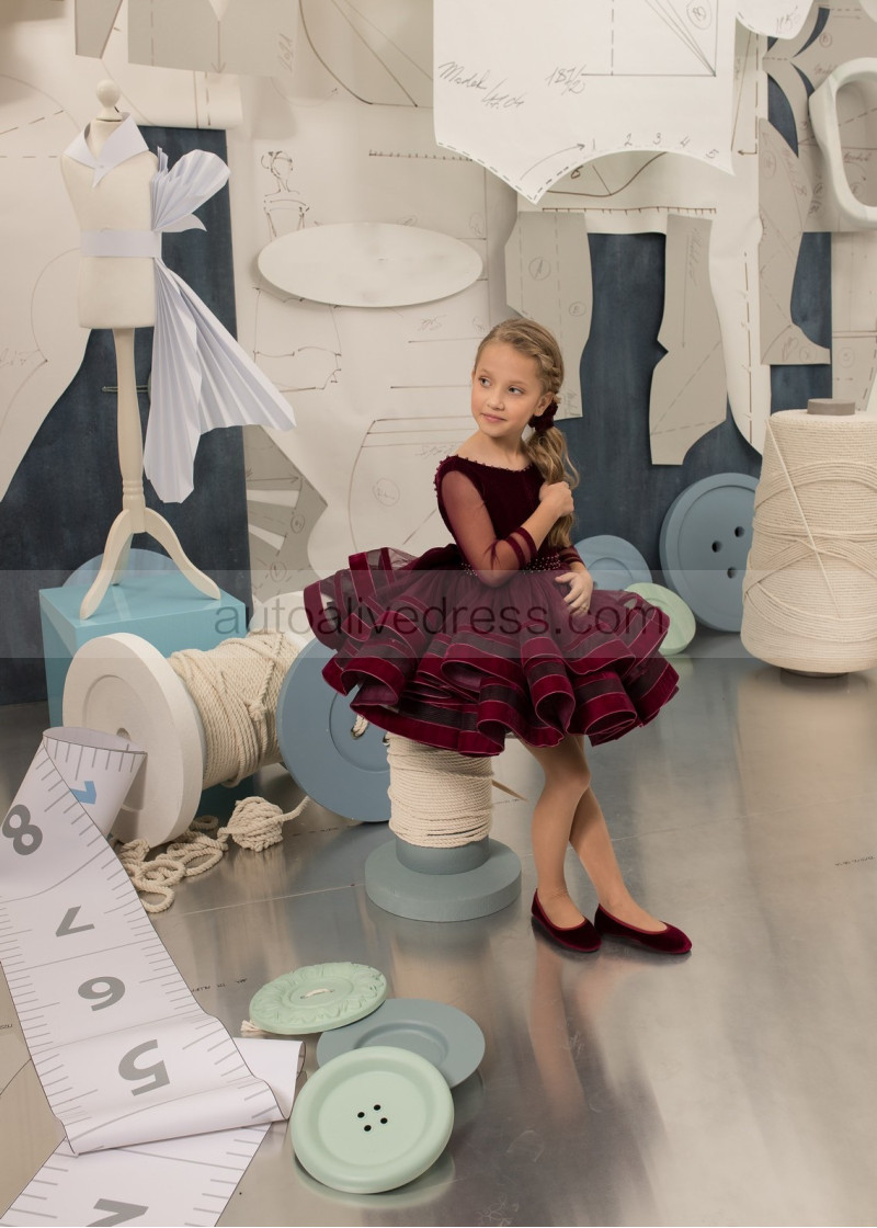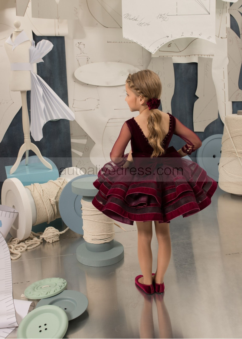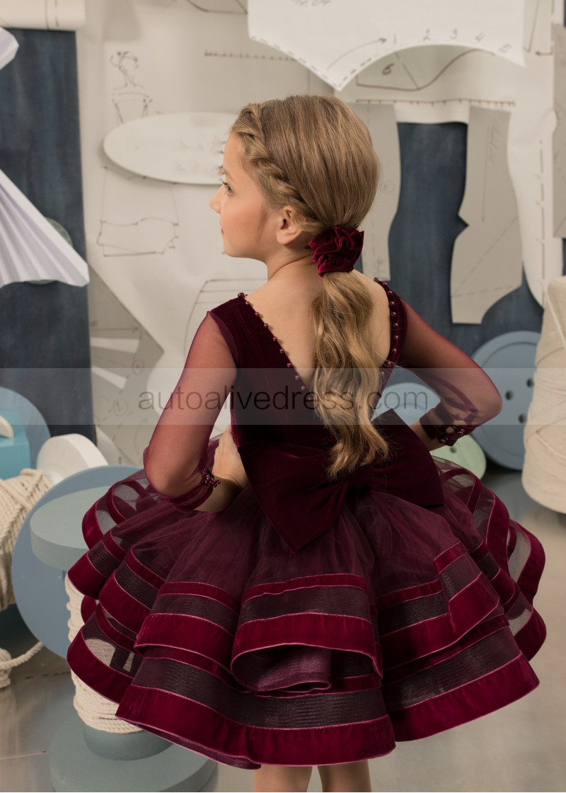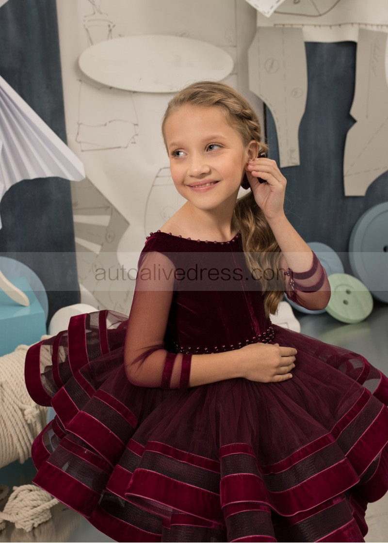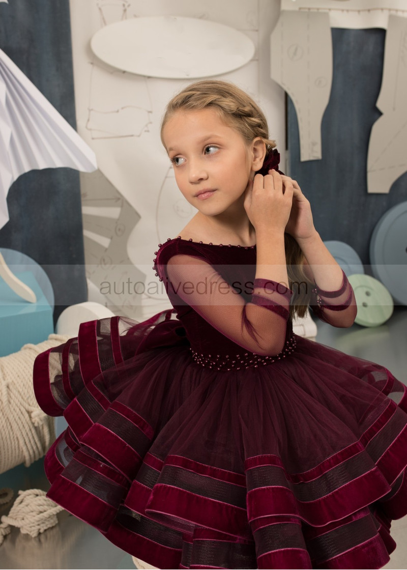 Burgundy Velvet Tulle Pearls Embellished Flower Girl Dress
