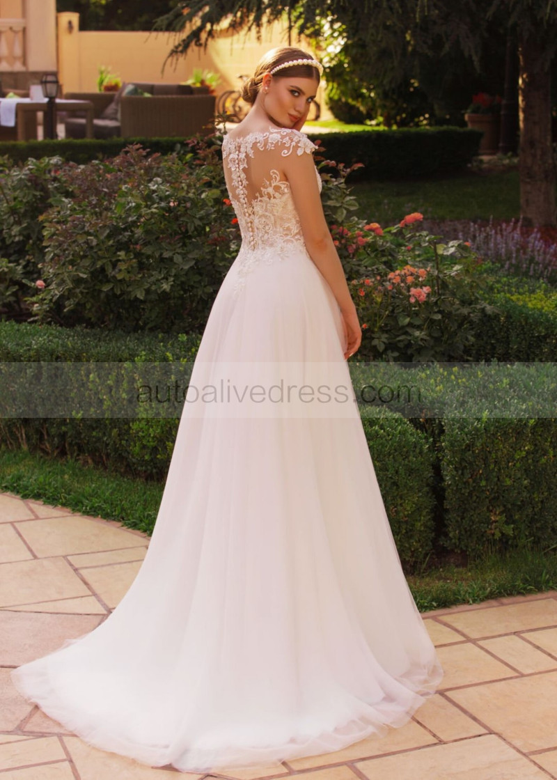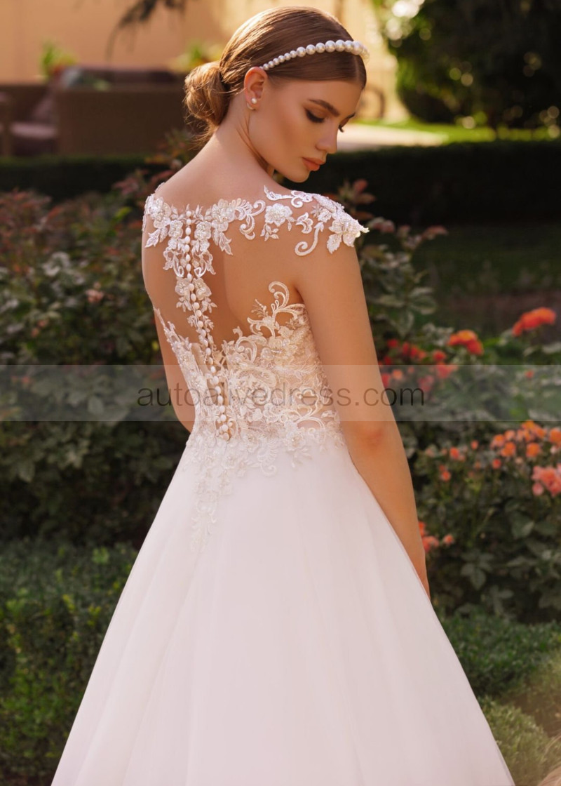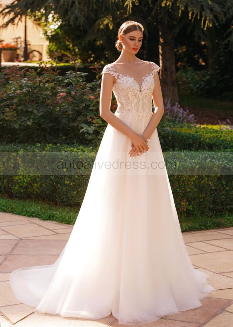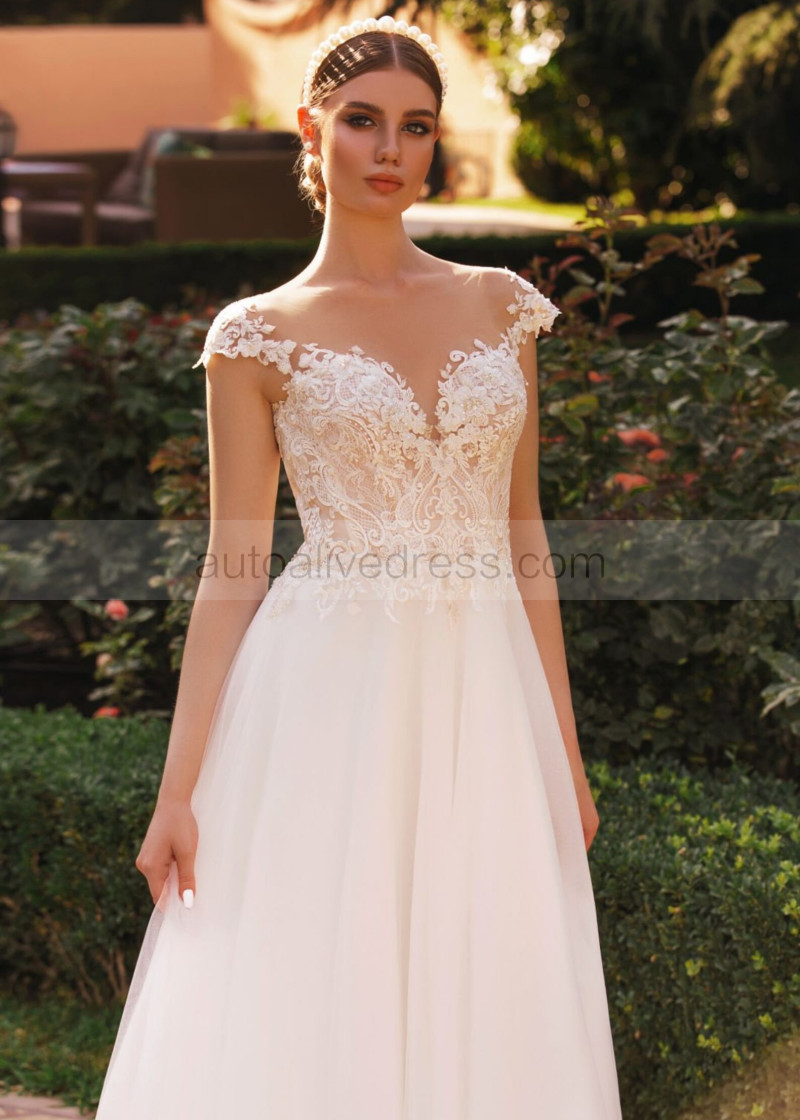 Cap Sleeves Beaded Ivory Lace Tulle Boho Wedding Dress