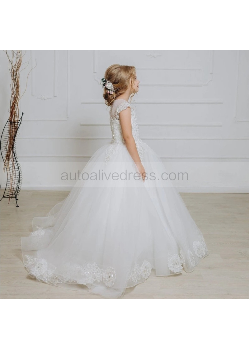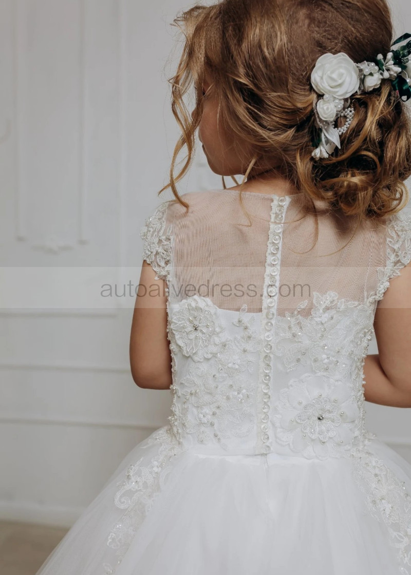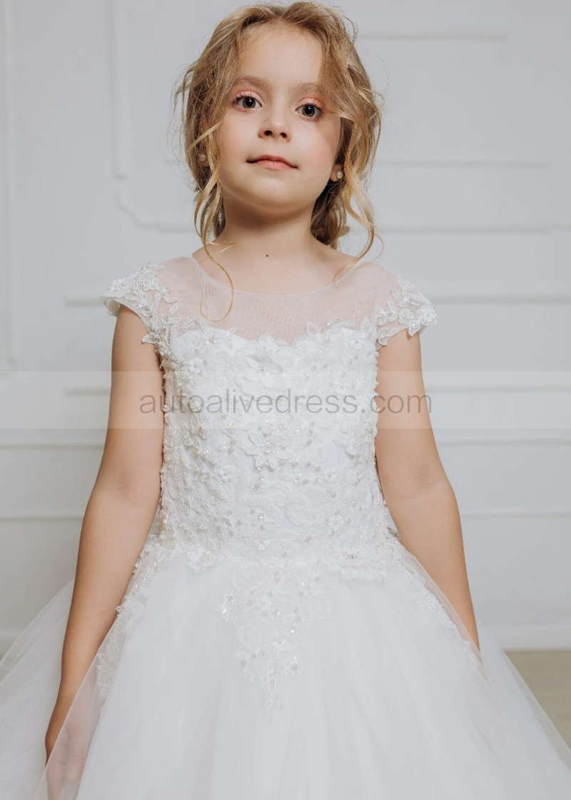 Cap Sleeves Beaded Ivory Lace Tulle Flower Girl Dress
