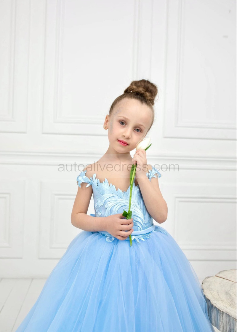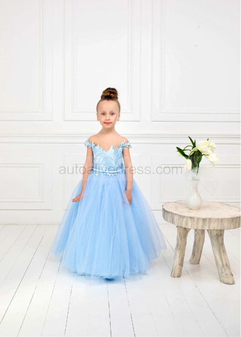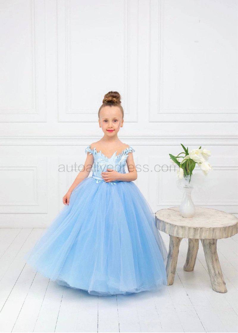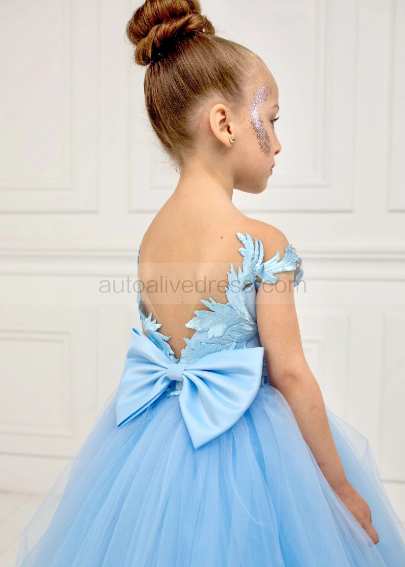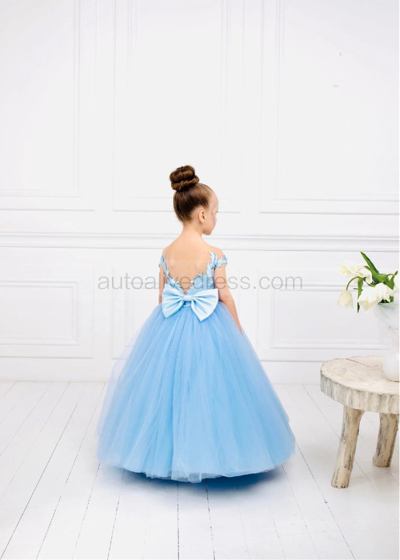 Cap Sleeves Blue Lace Tulle Floor Length Flower Girl Dress