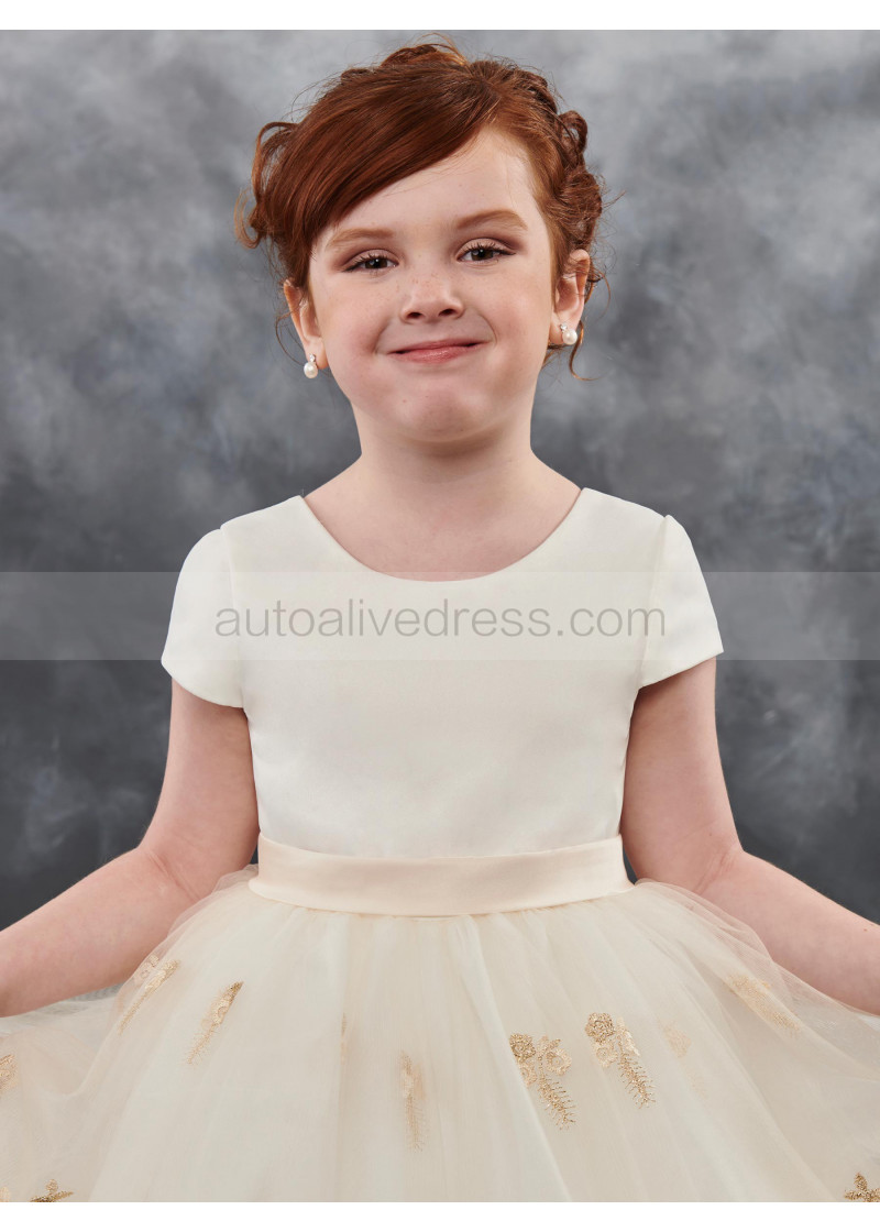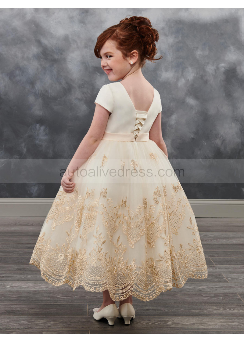 Cap Sleeves Champagne Lace Tulle Tea Length Corset Back Flower Girl Dress