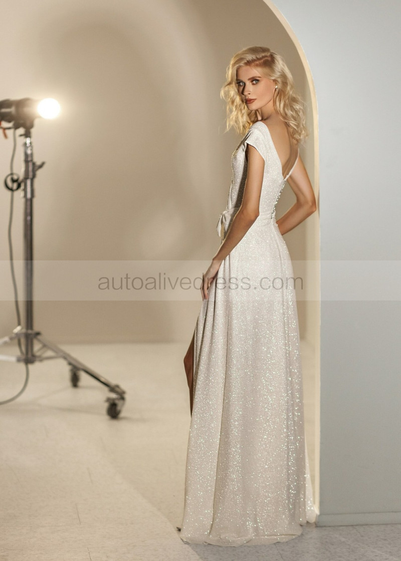Cap Sleeves Ivory Glitter Slit Wedding Dress