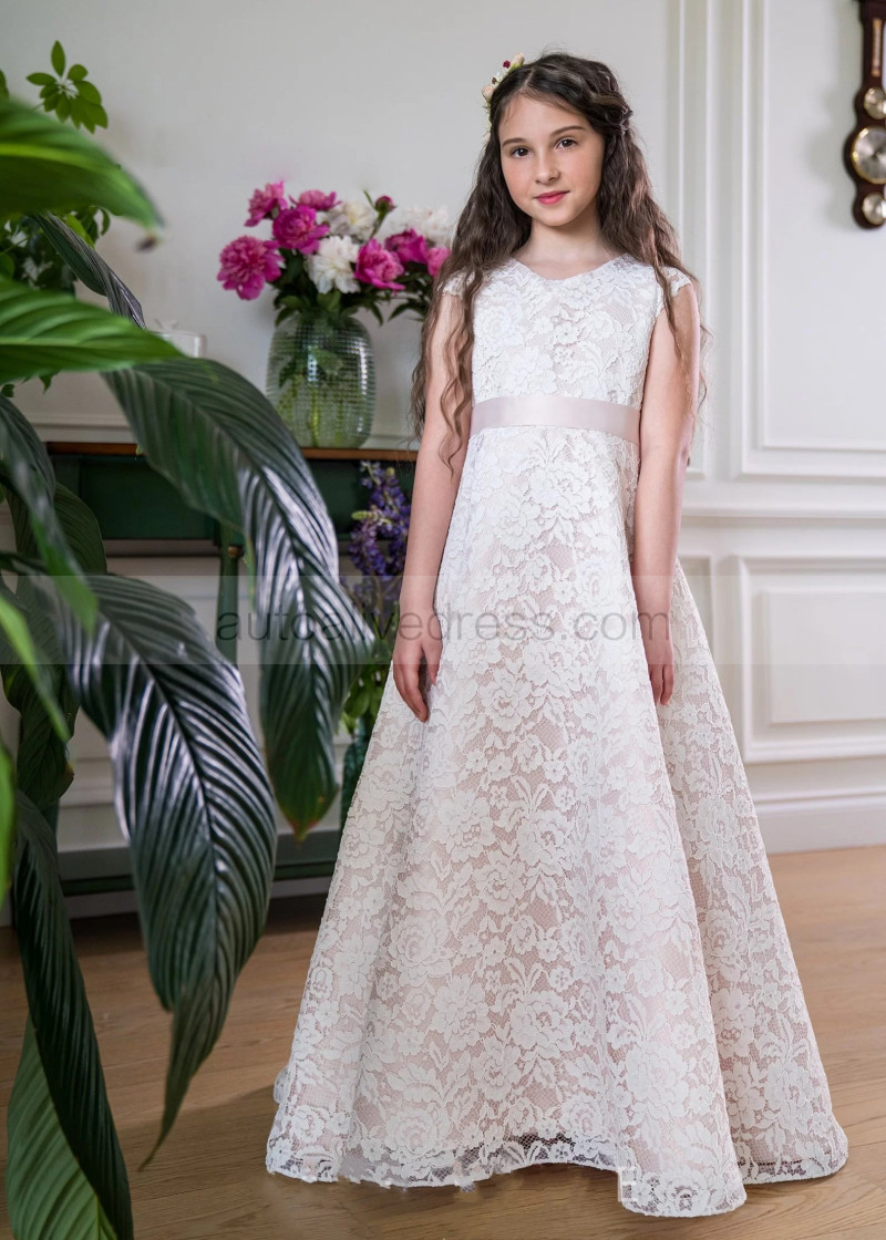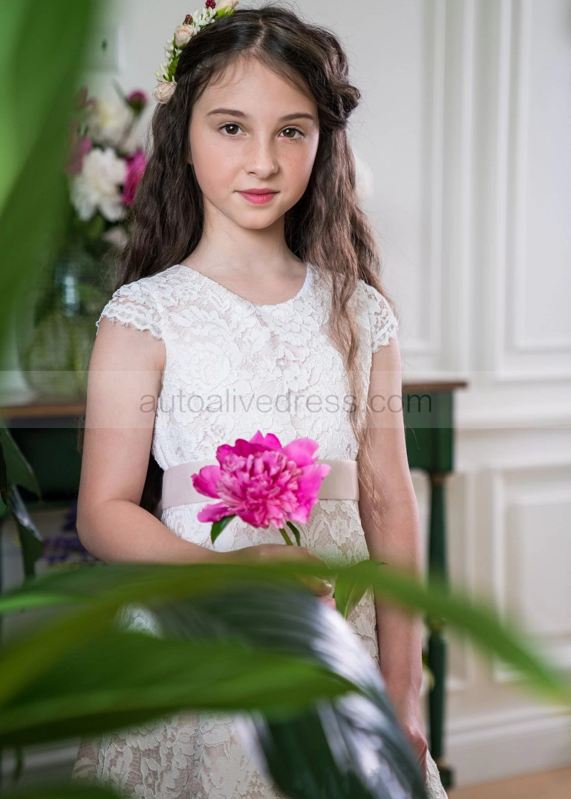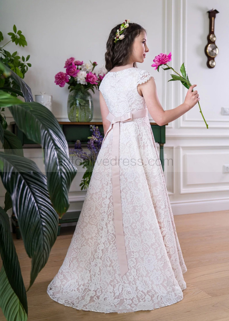 Cap Sleeves Ivory Lace Flower Girl Dress With Rose Lining