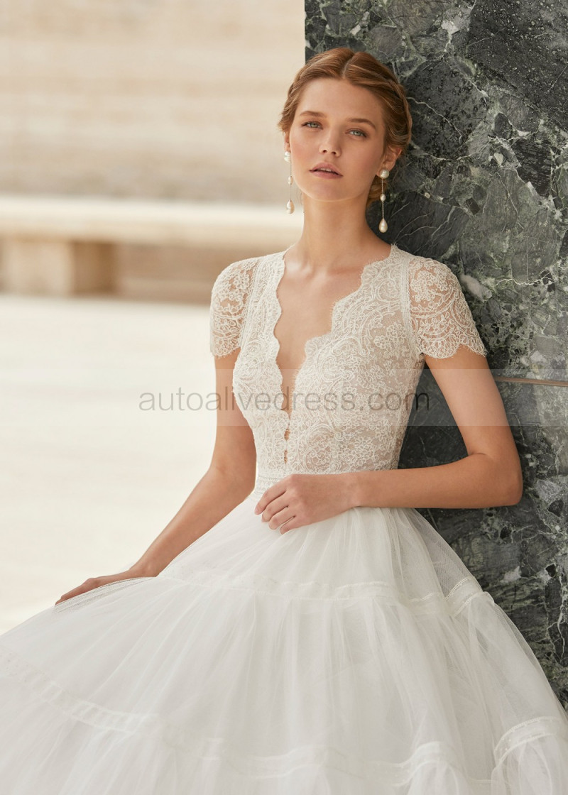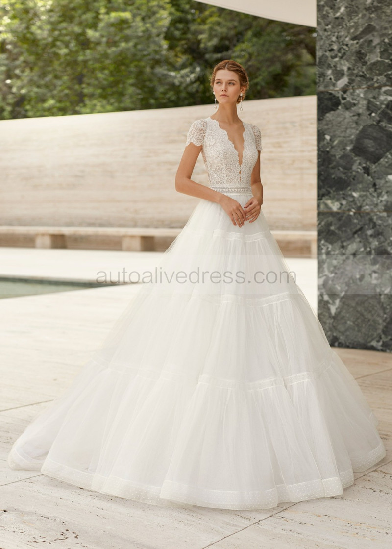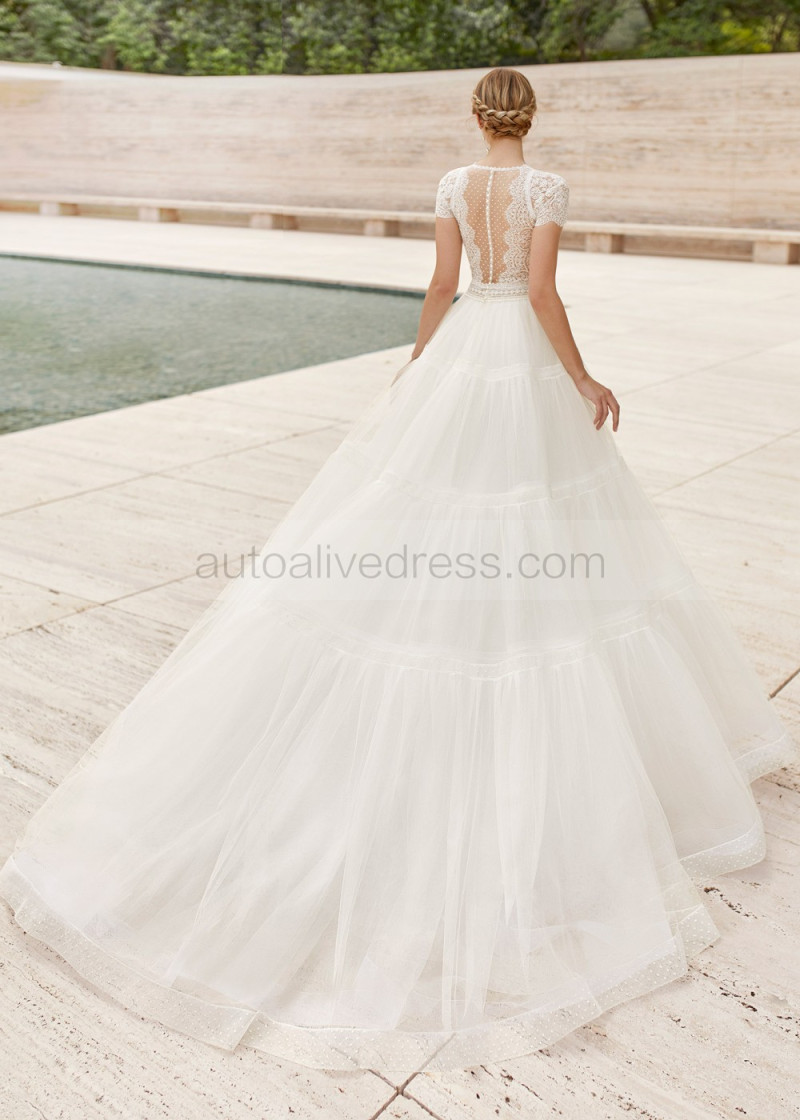 Cap Sleeves Ivory Lace Polka Dots Tulle Stylish Wedding Dress