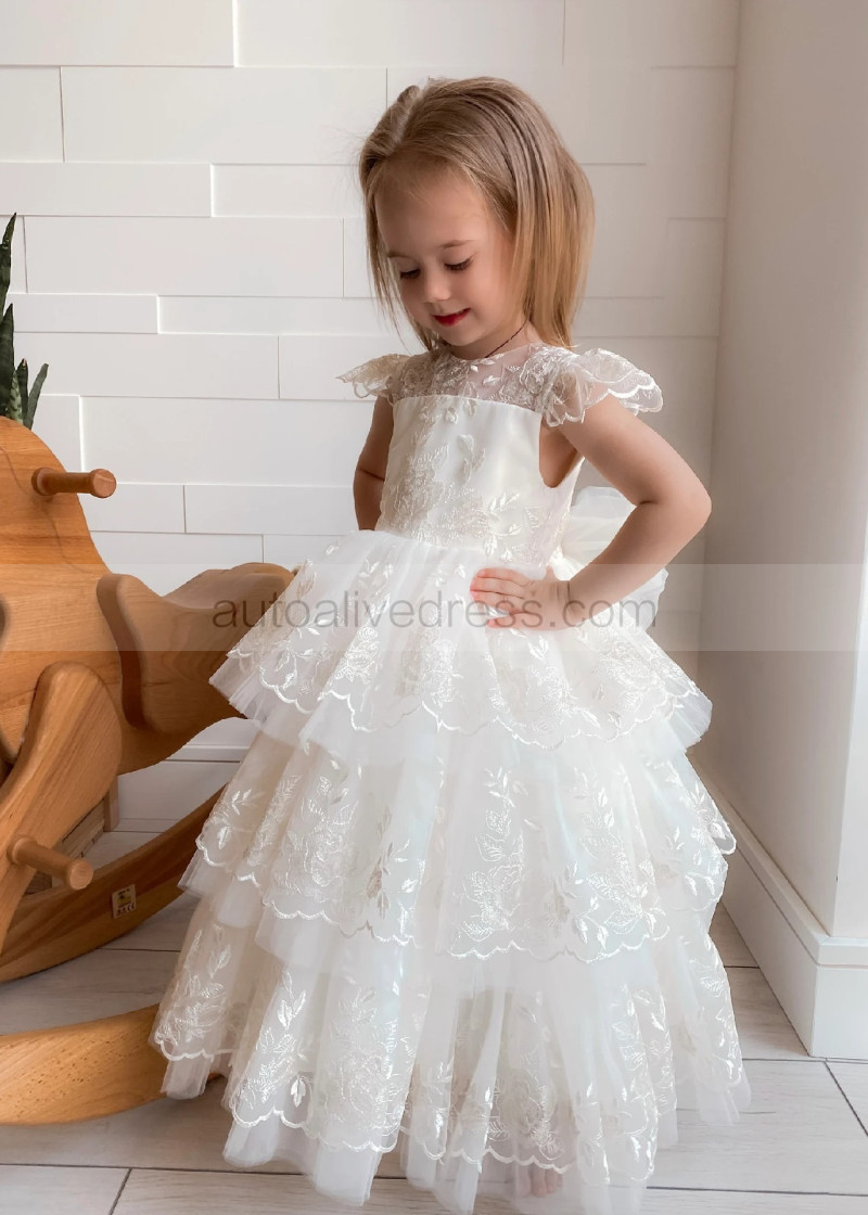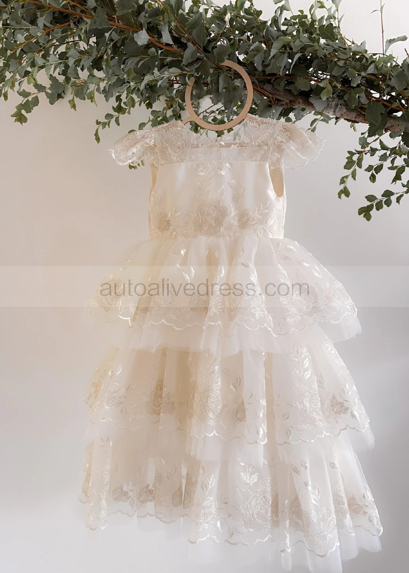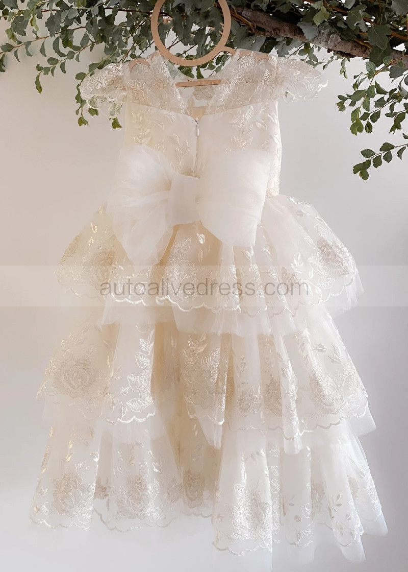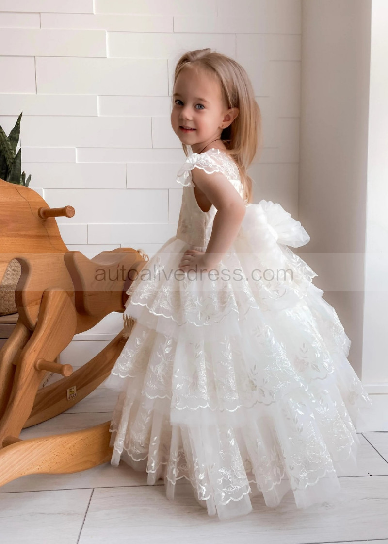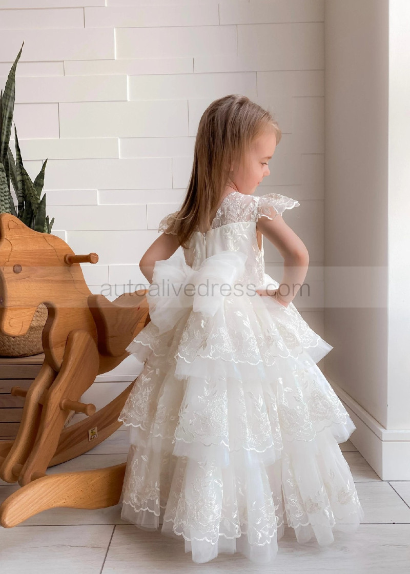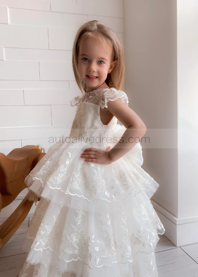 Cap Sleeves Ivory Lace Tulle Cupcake Flower Girl Dress