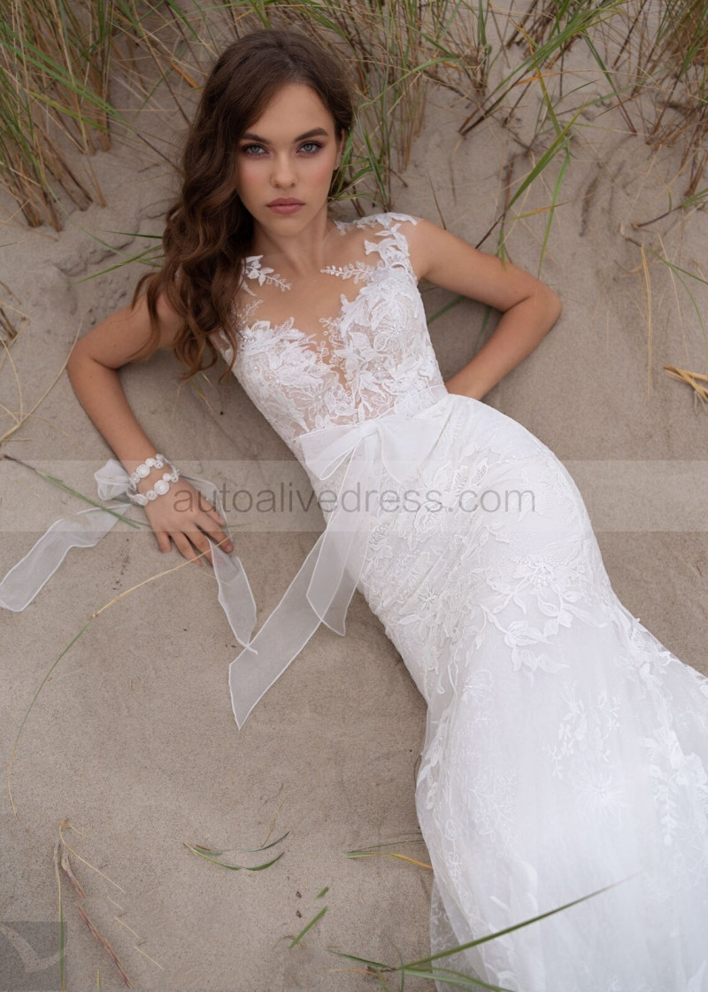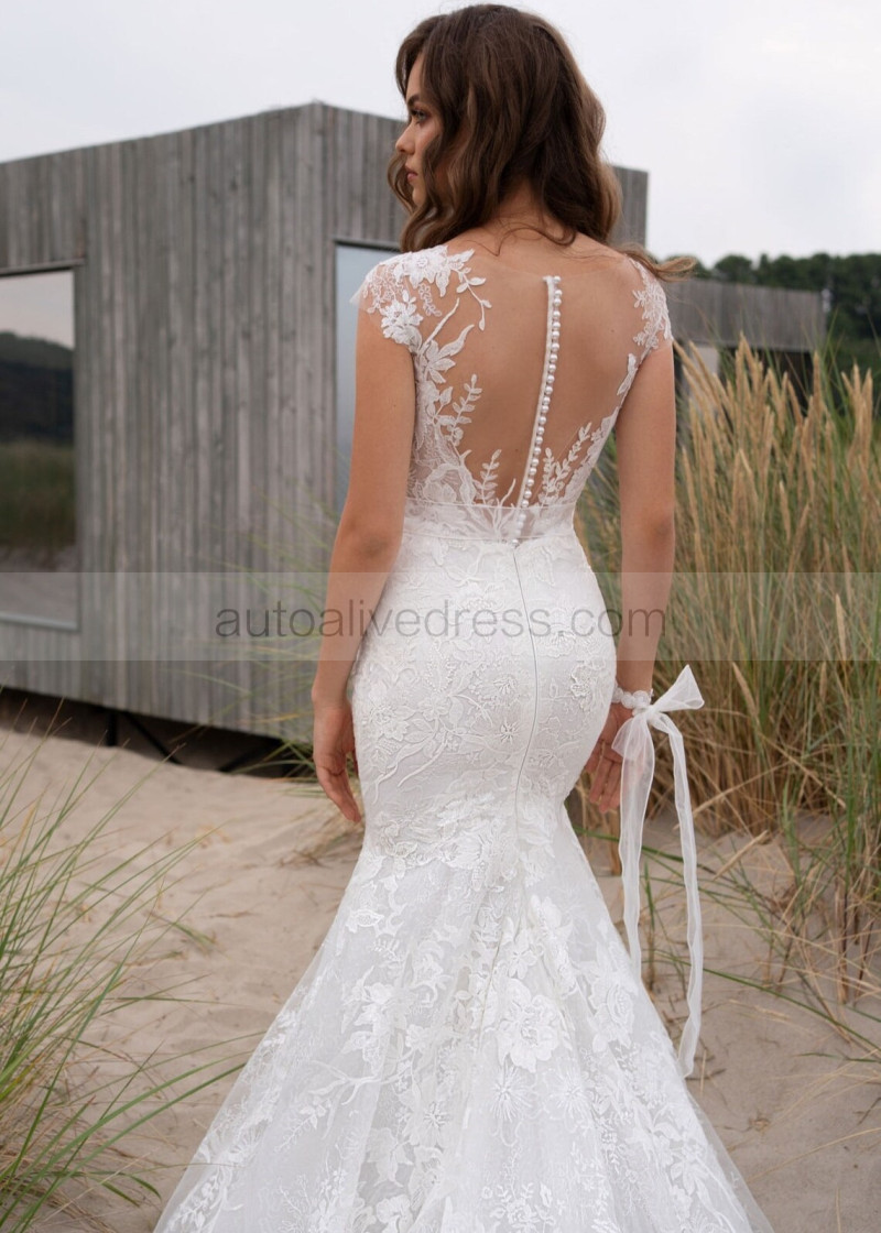 Cap Sleeves Ivory Lace Tulle Pearl Buttons Back Wedding Dress