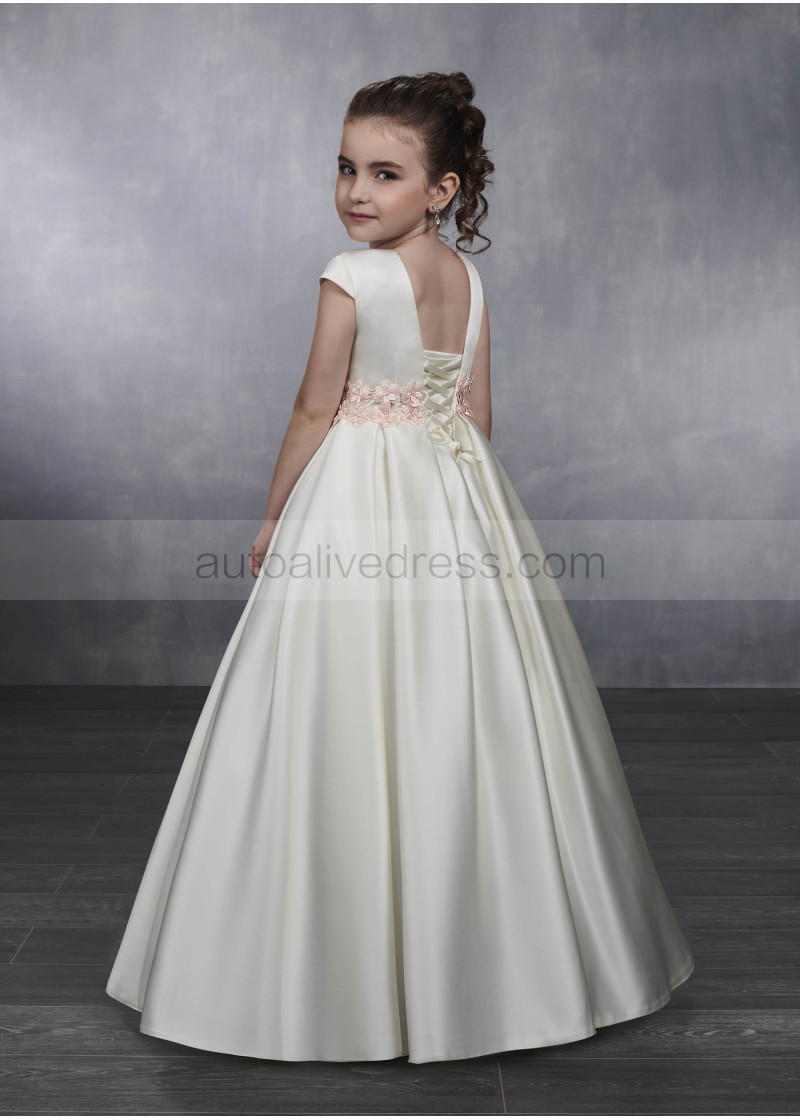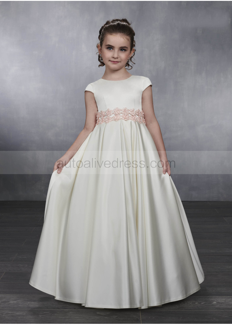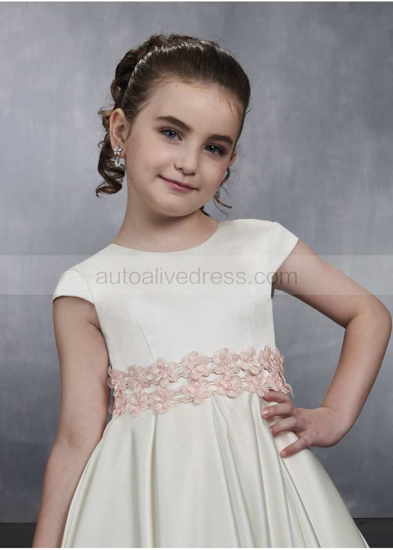 Cap Sleeves Ivory Satin 3D Flower Trims Flower Girl Dress