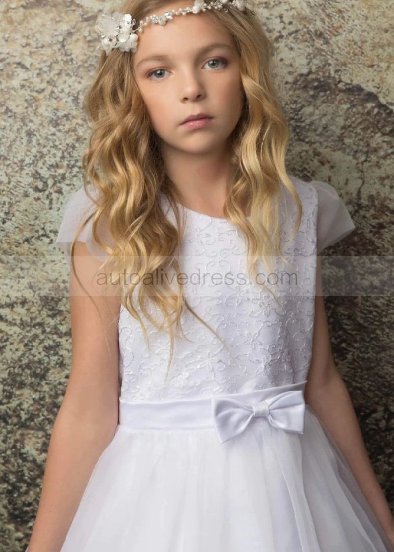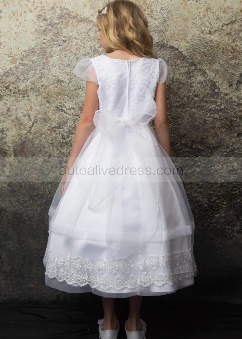 Cap Sleeves White Lace Organza Tea Length Flower Girl Dress