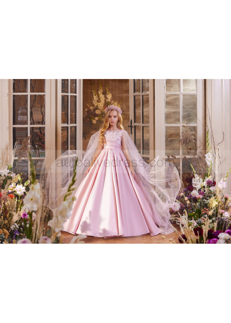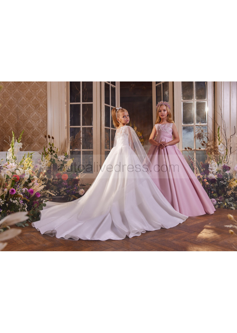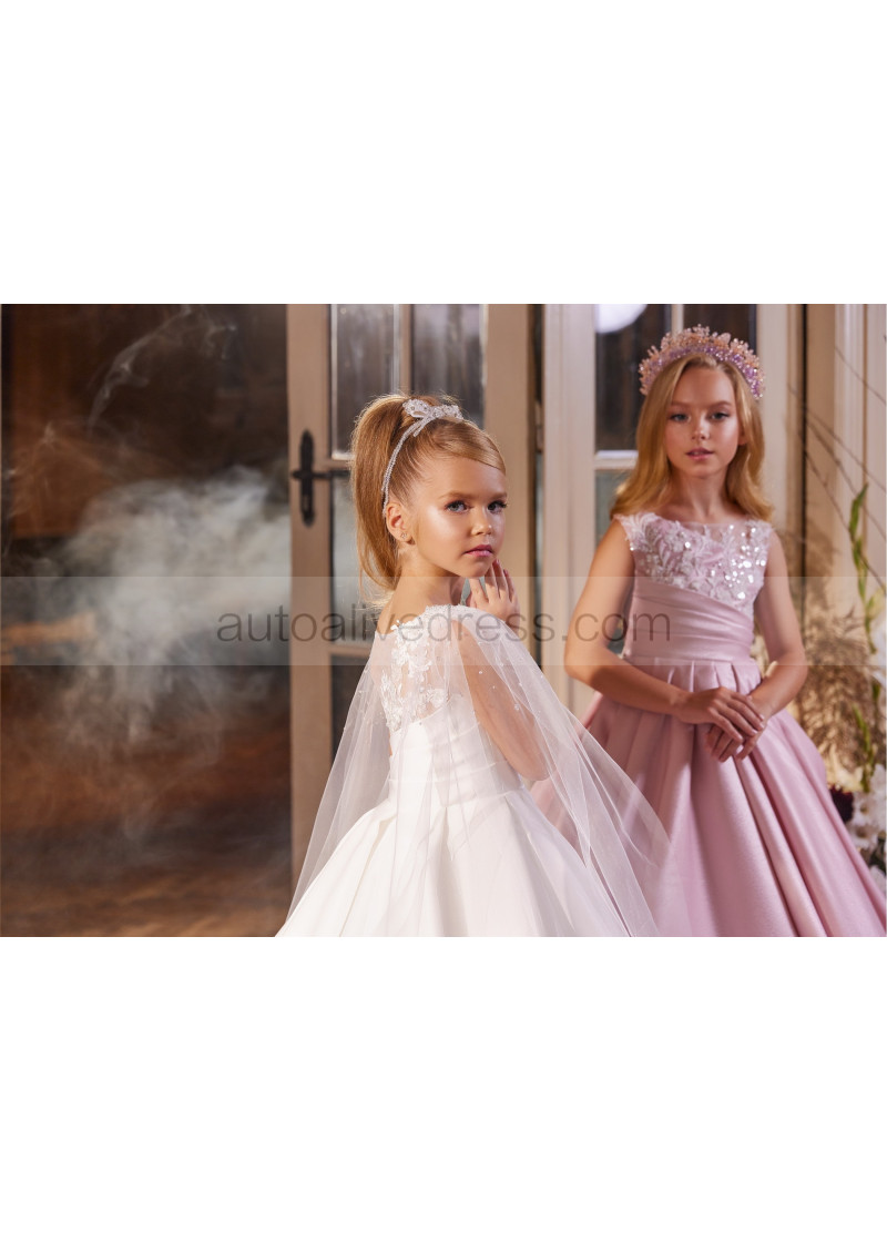 Cape Sleeves Beaded Lace Pleated Satin Enchanting Flower Girl Dress