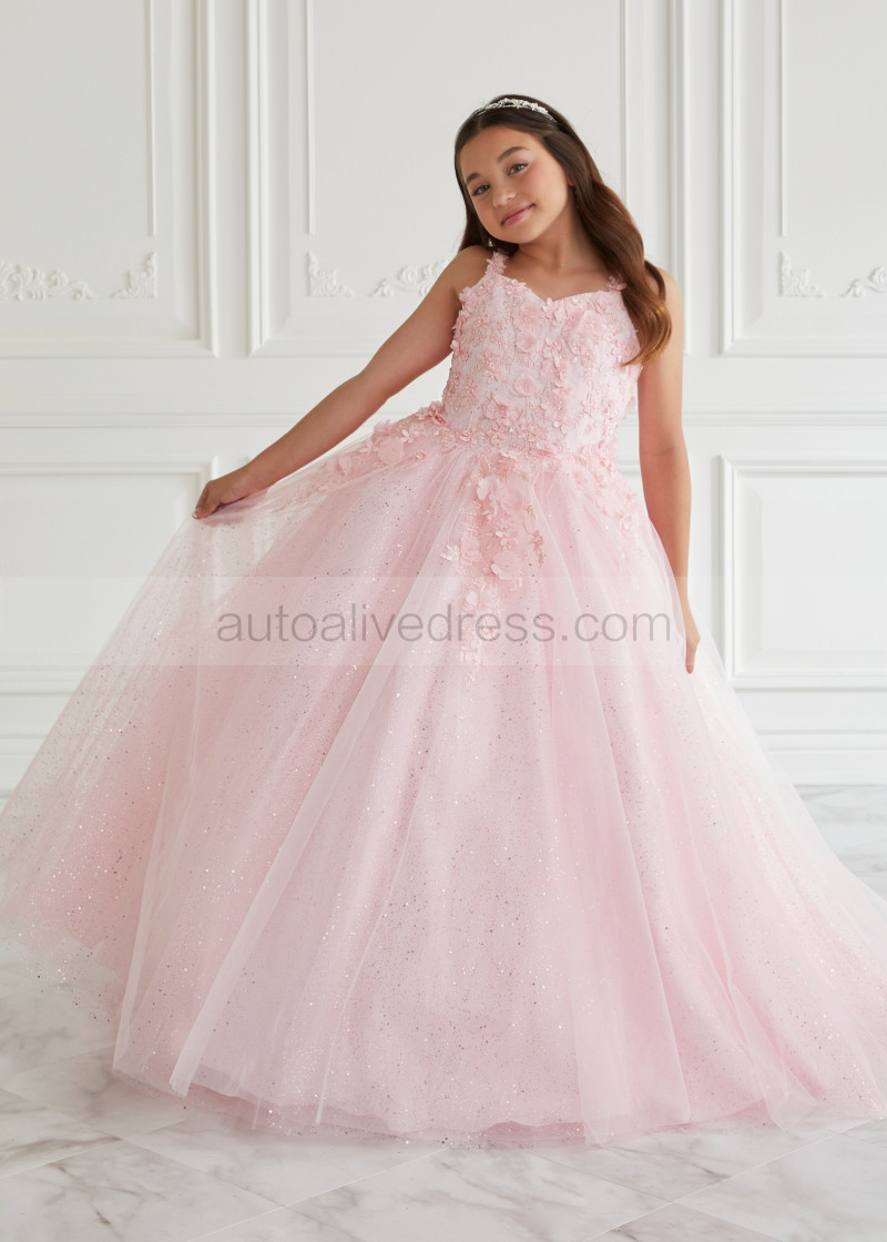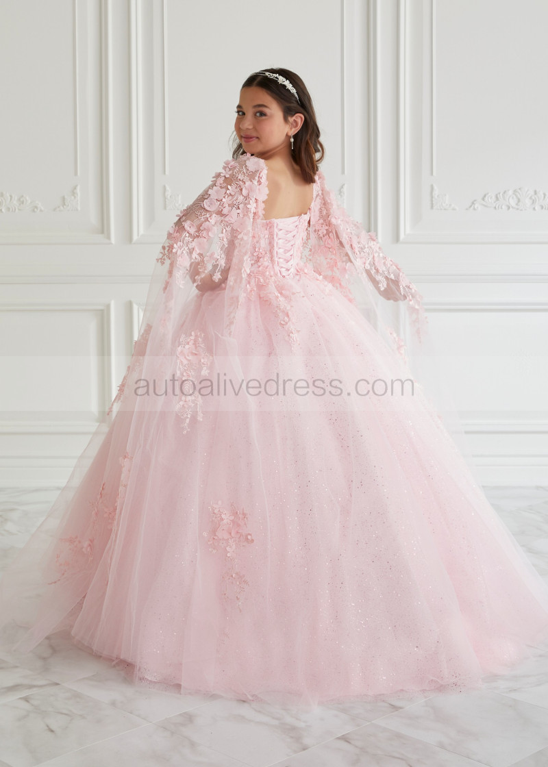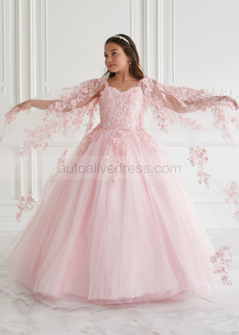 Cape Sleeves Pink 3D Flowers Lace Tulle Sparkly Flower Girl Dress