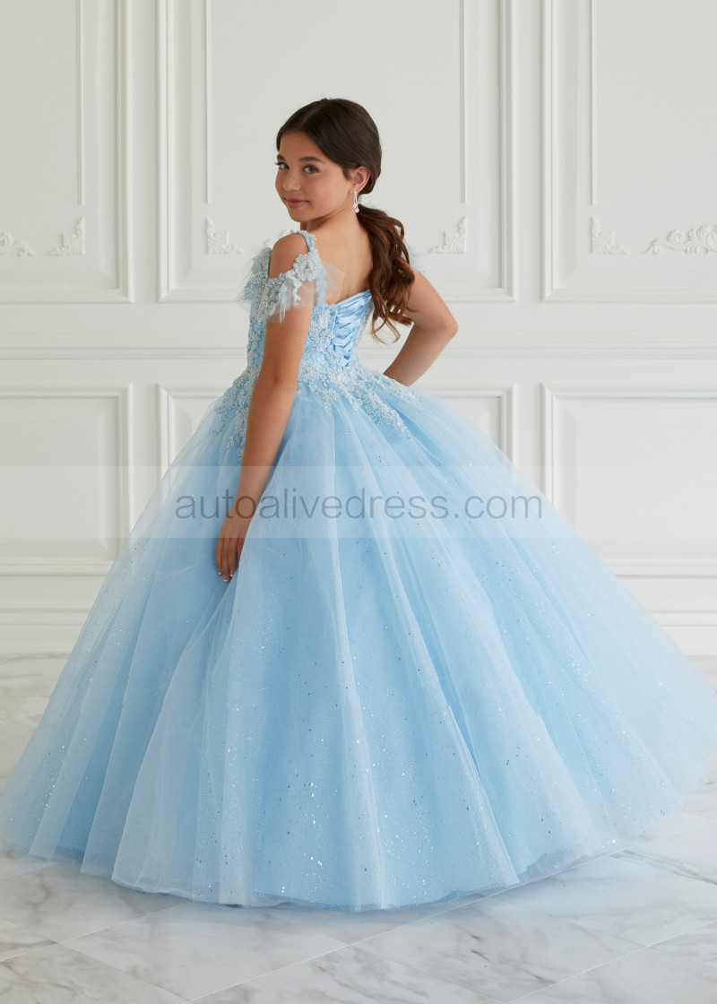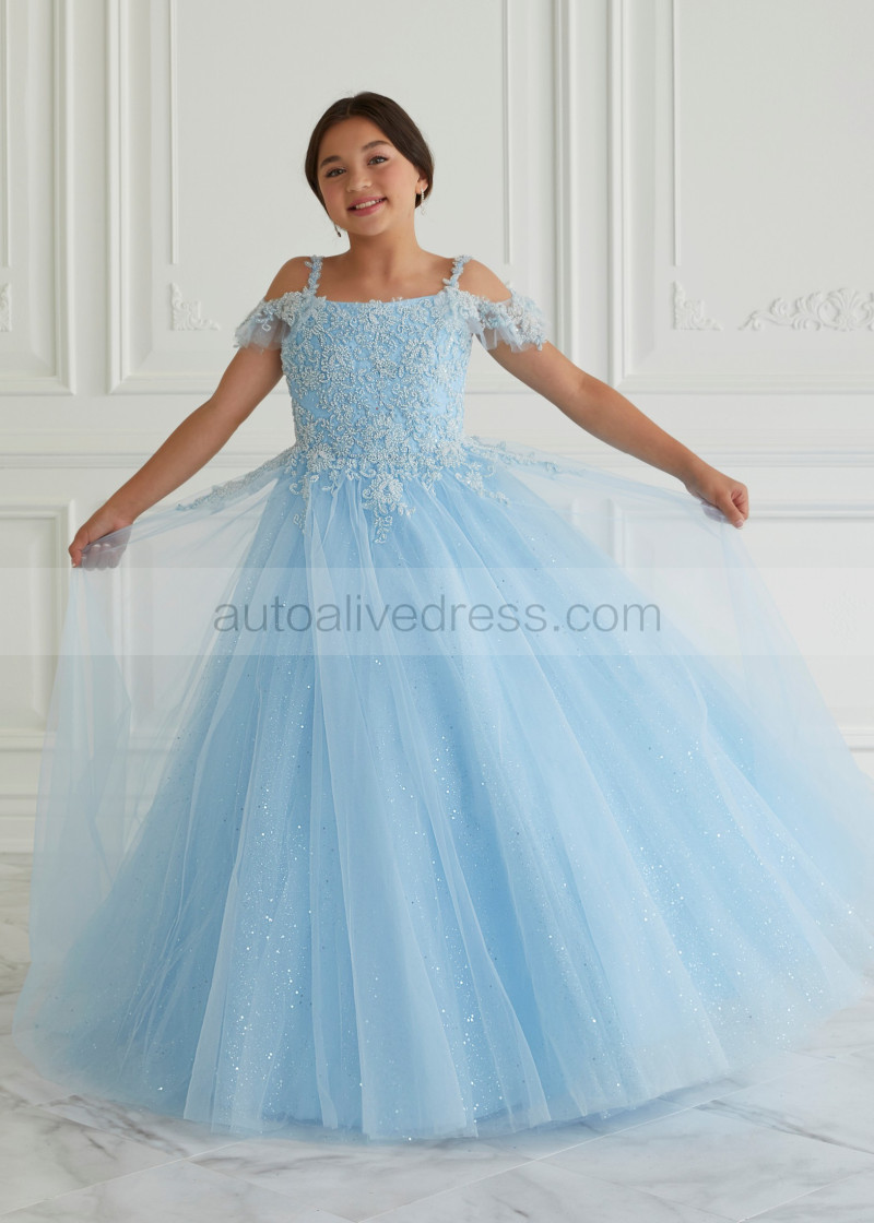 Cold Shoulder Beaded Sky Blue Lace Tulle Sparkling Flower Girl Dress