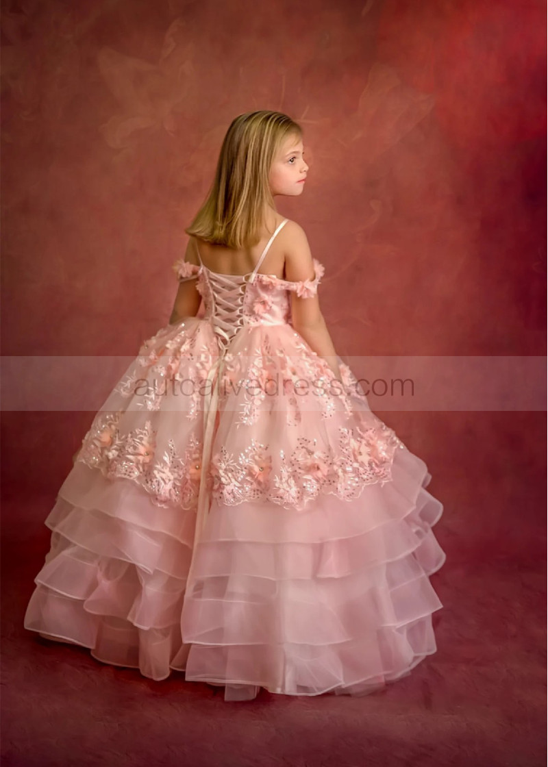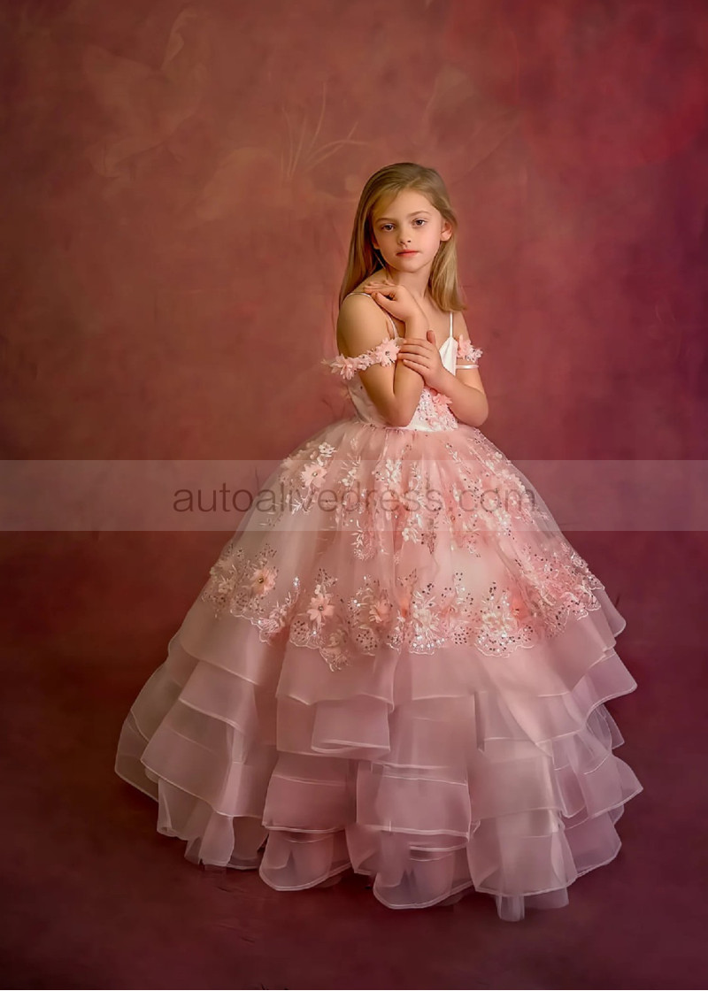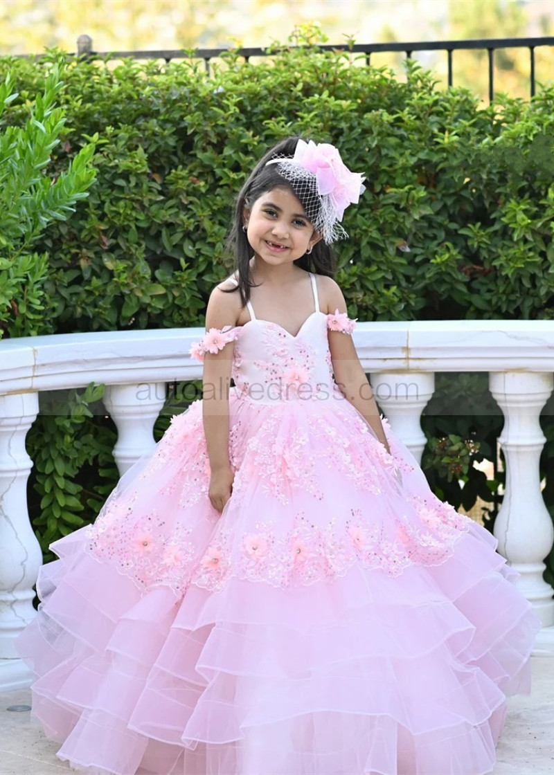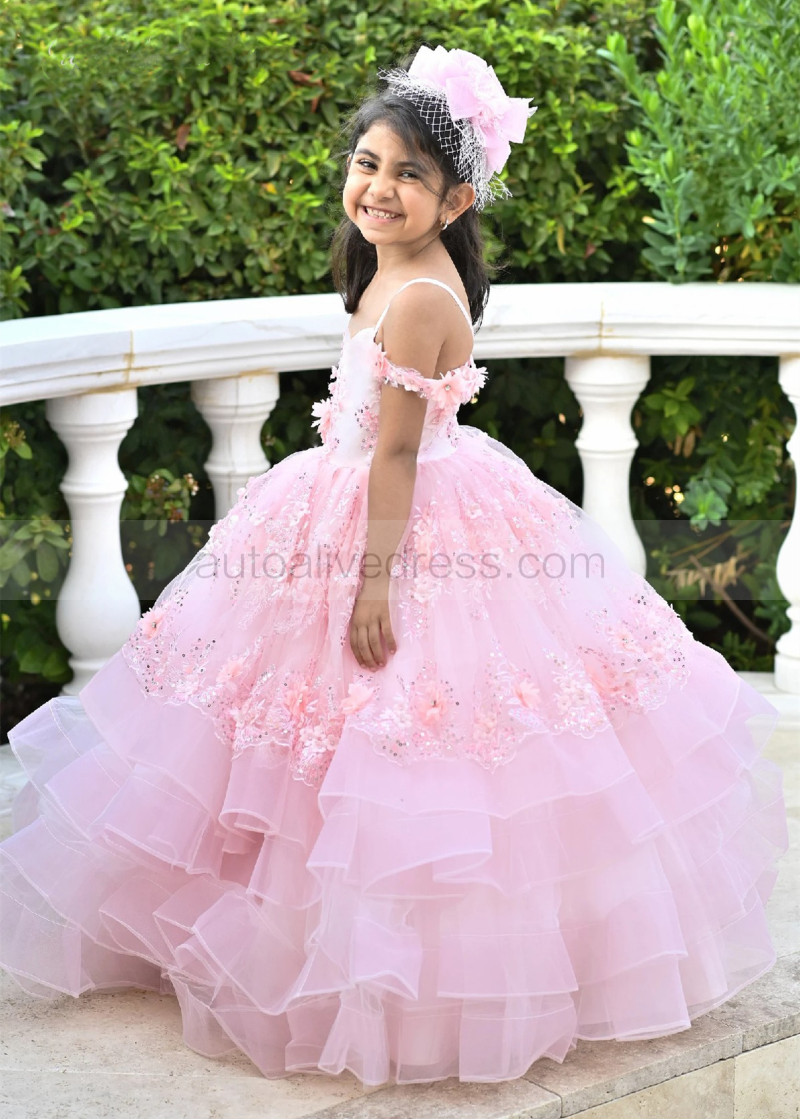 Cold Shoulder Pink Beaded Lace Layered Tulle Flower Girl Dress