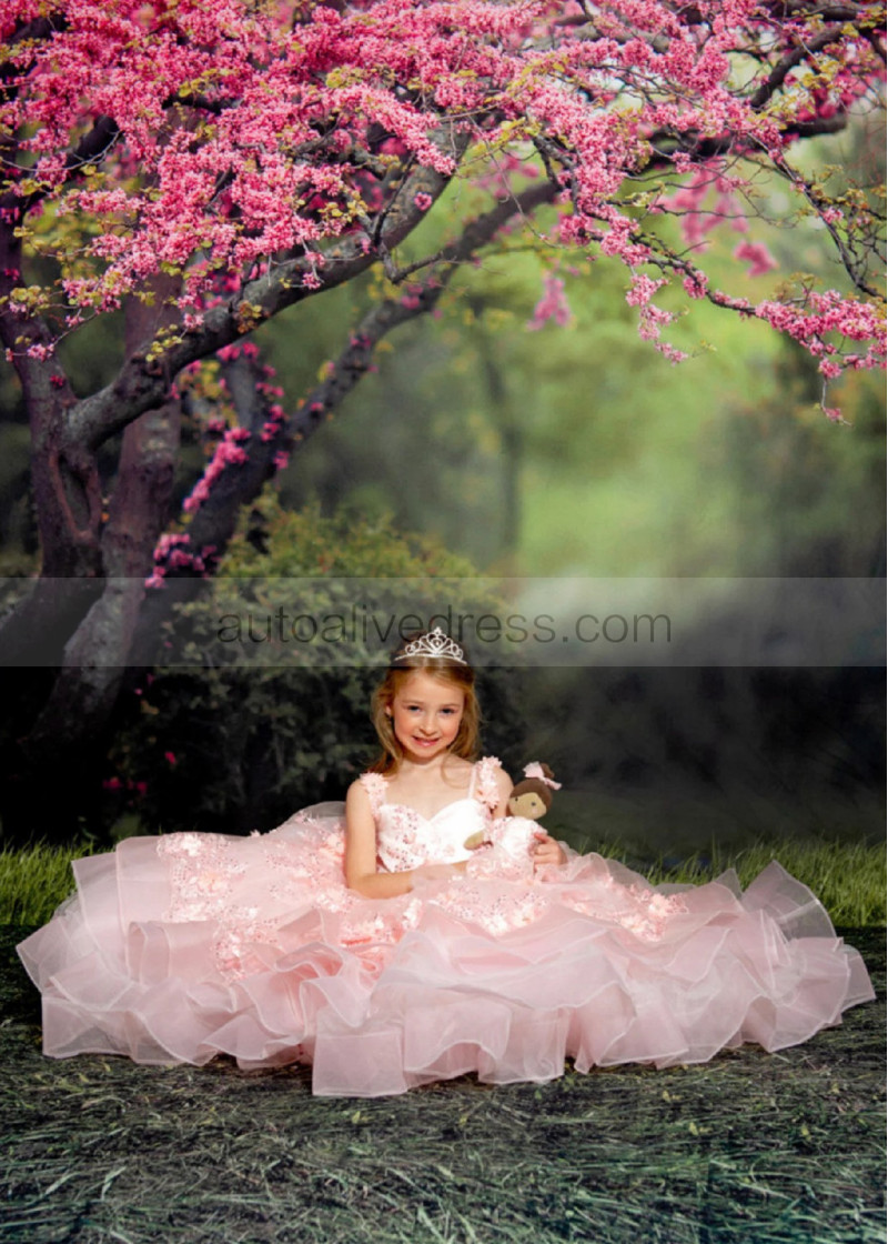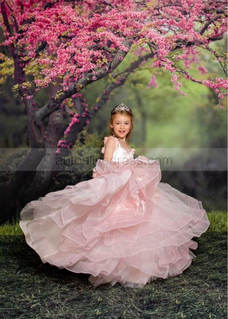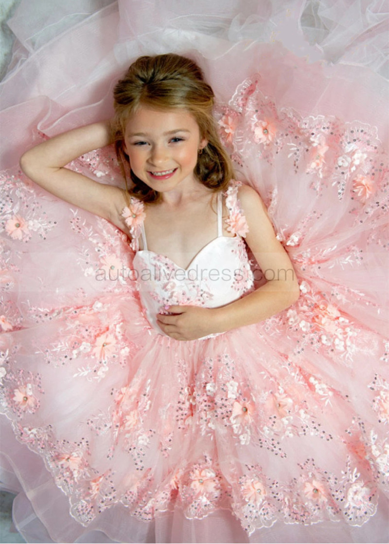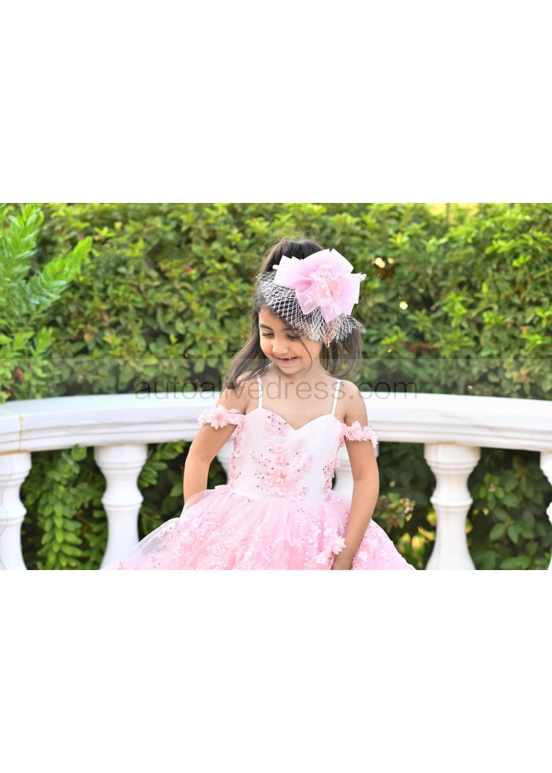 Cold Shoulder Pink Beaded Lace Layered Tulle Flower Girl Dress