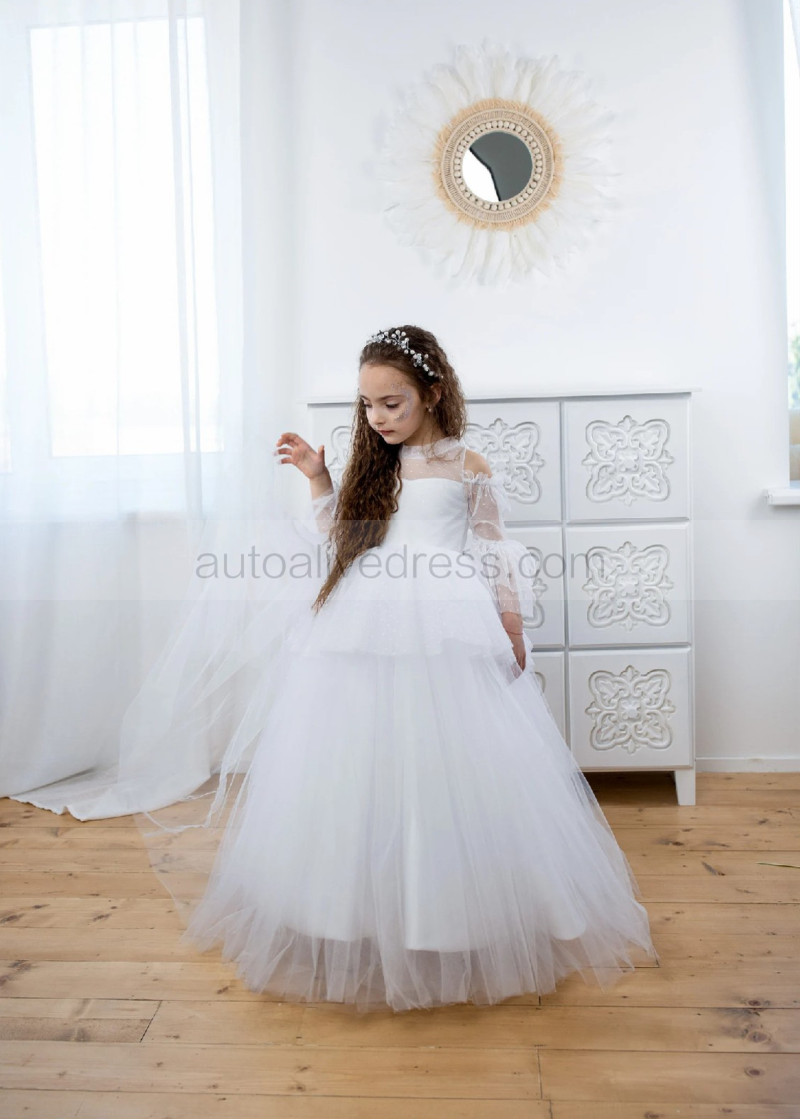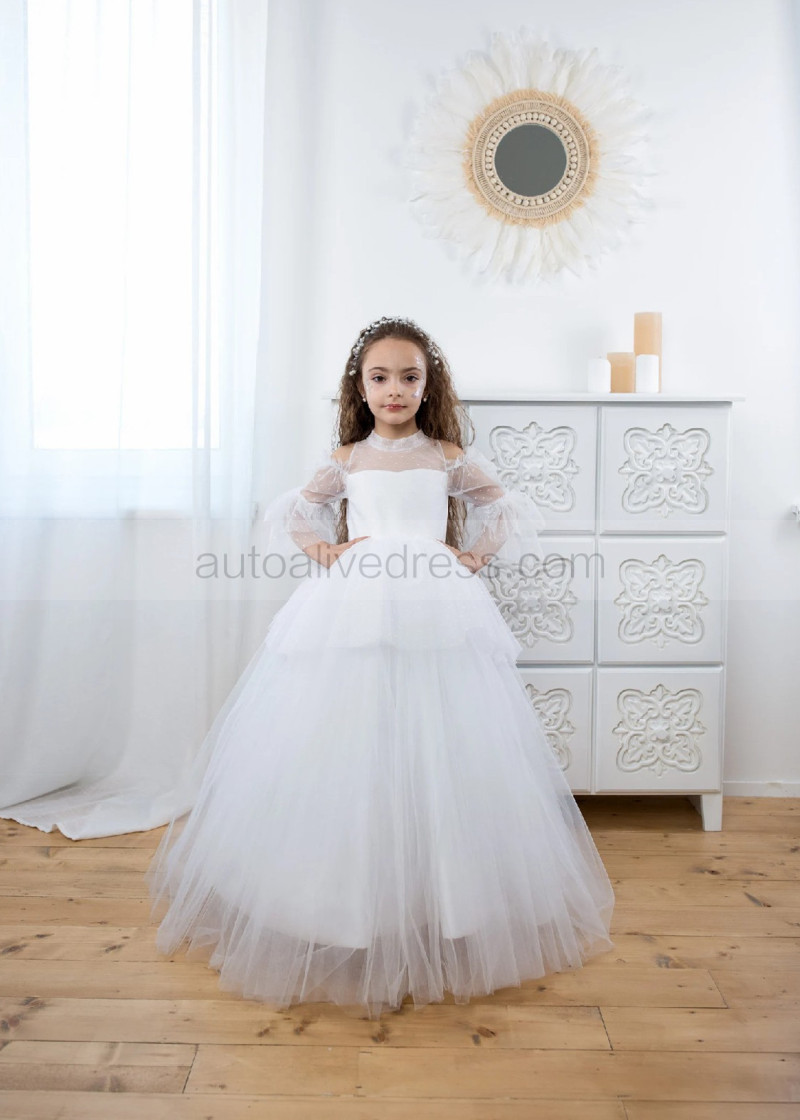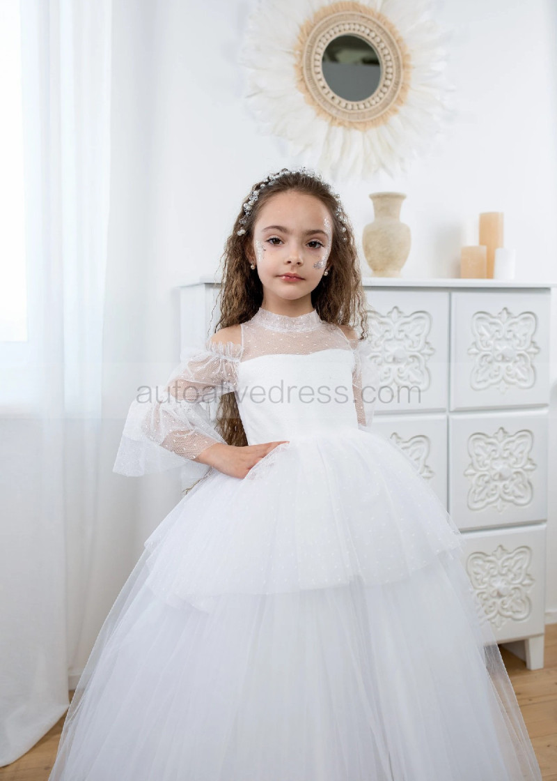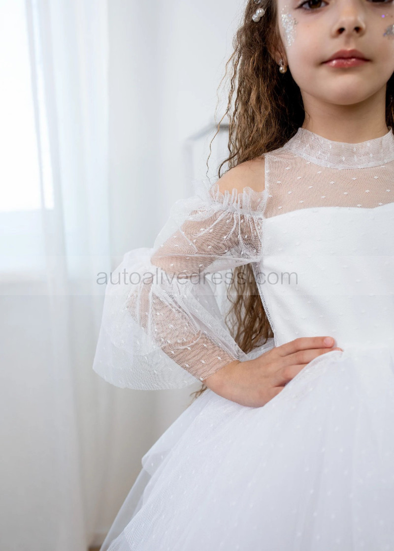 Cold Shoulder White Polka Dotted Lace Tulle Flower Girl Dress