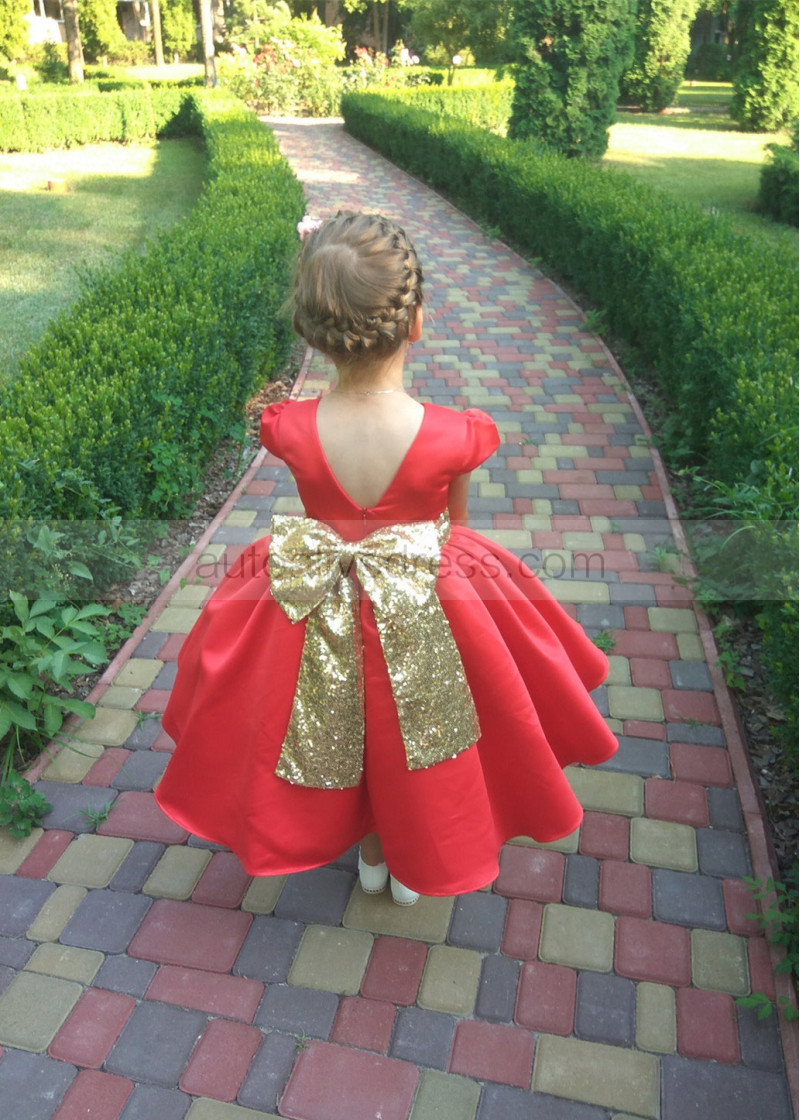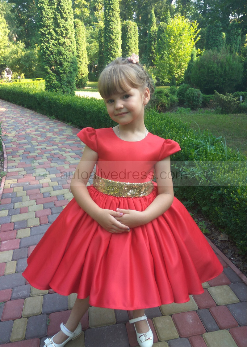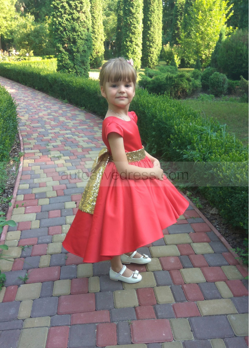 Coral Satin Gold Sequin Belt Flower Girl Dress