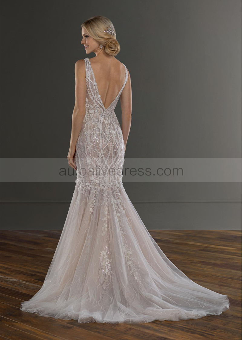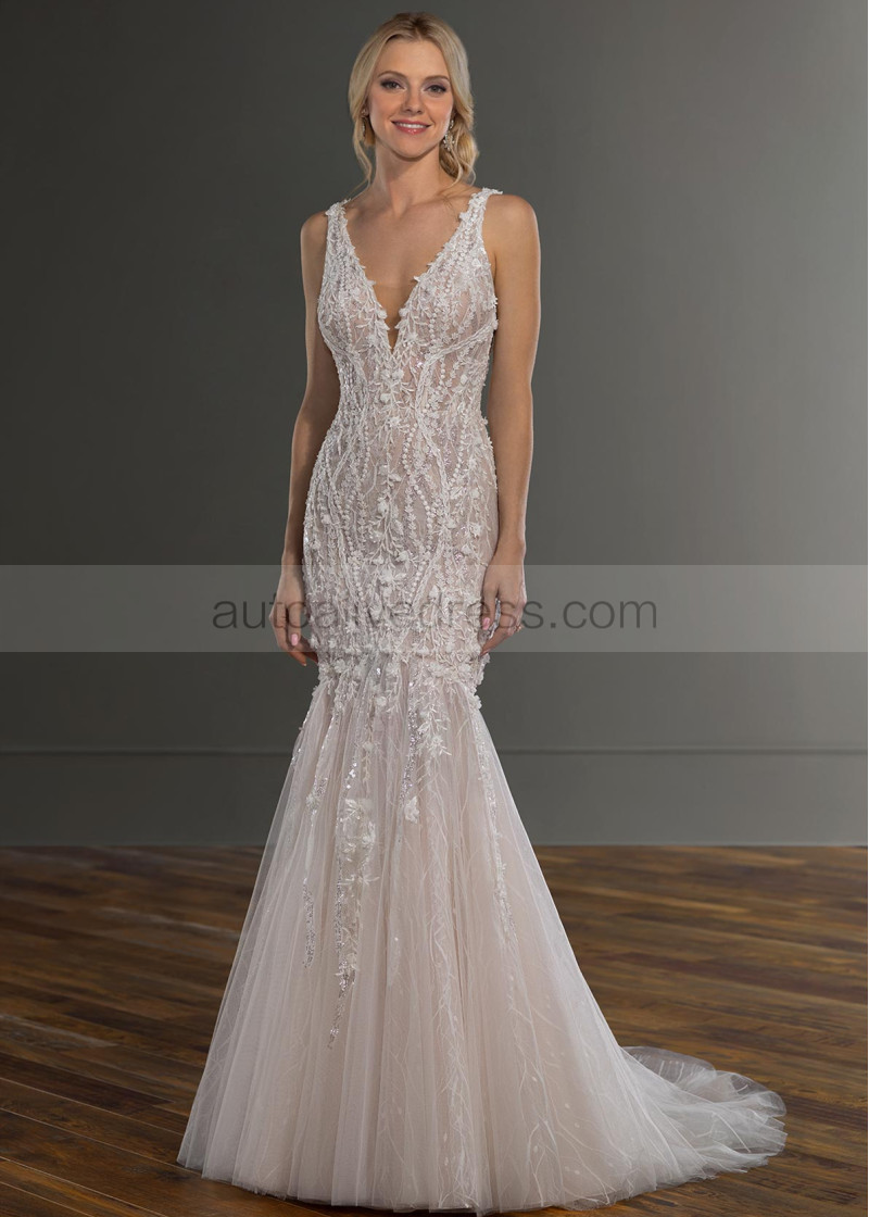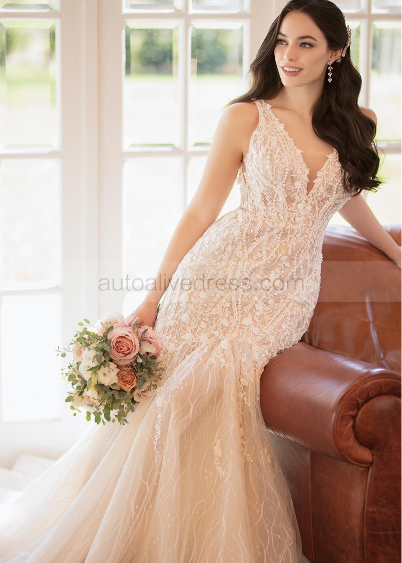Deep V Neck Beaded Ivory Lace Tulle Deep V Back Wedding Dress