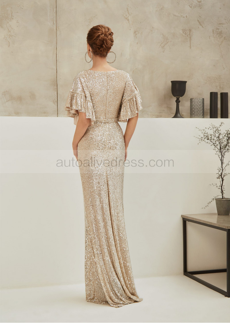 Deep V Neck Silver Sequin Sparkly Evening Dress