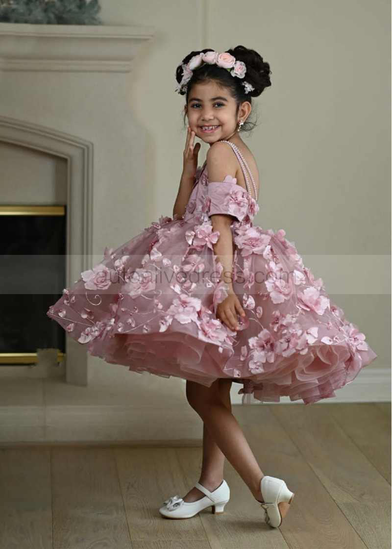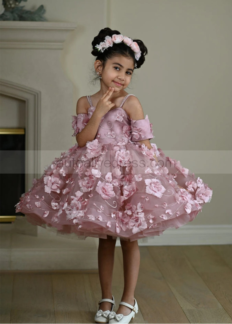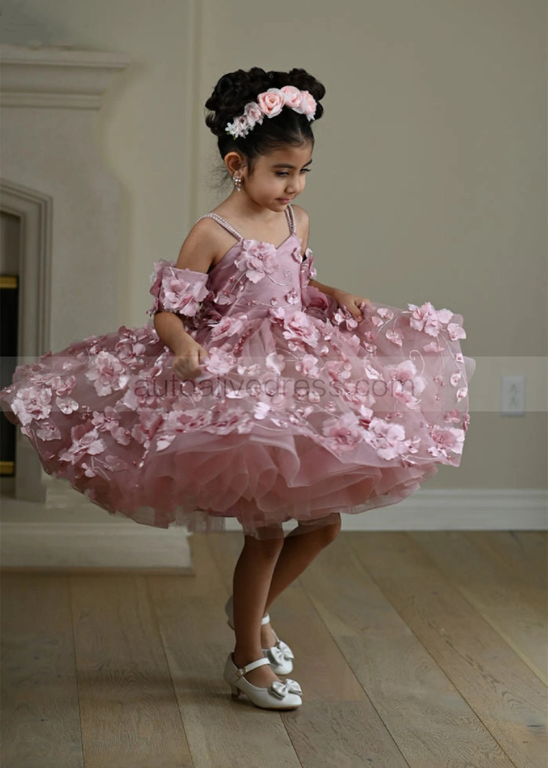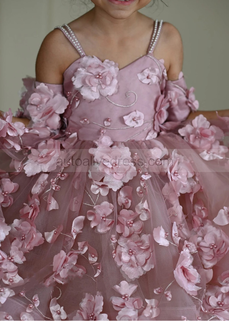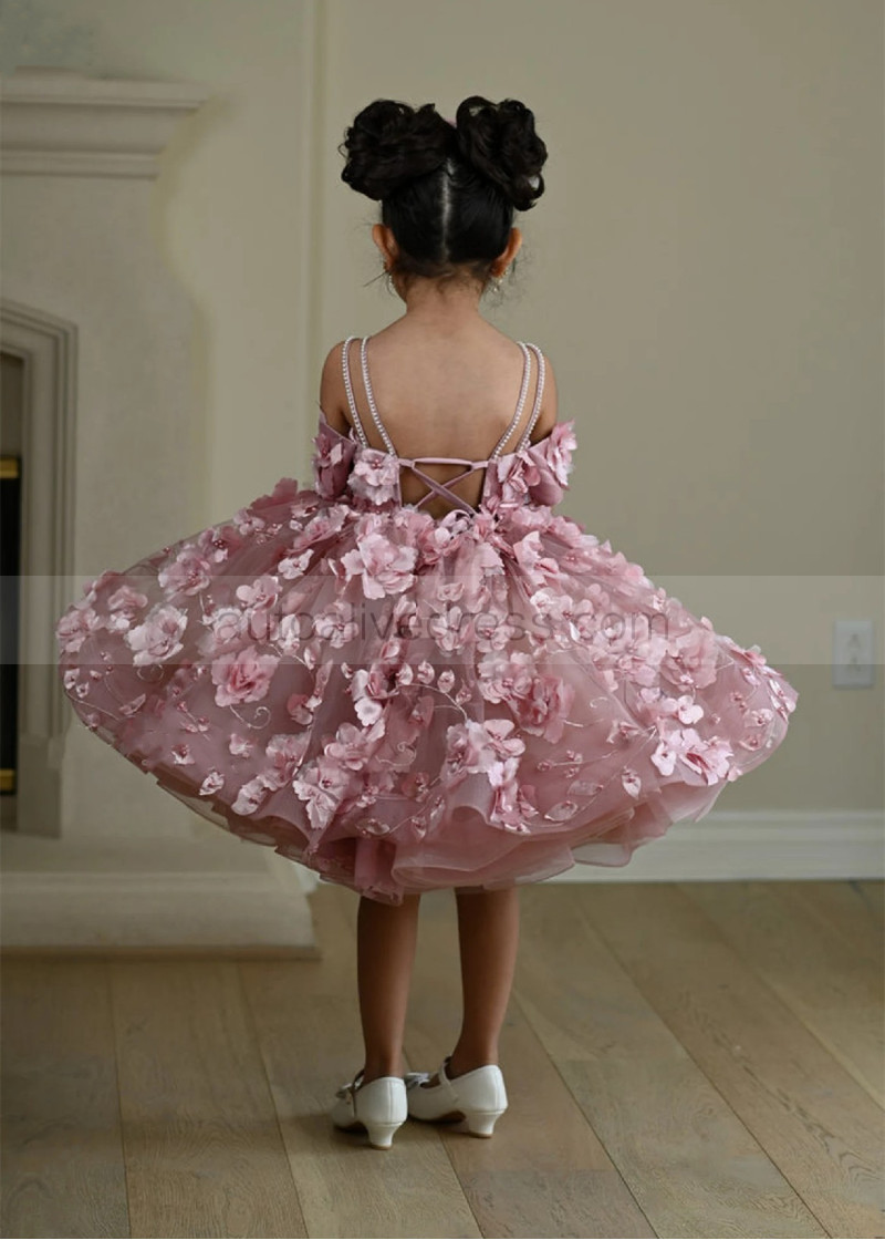 Dusty Pink Beaded Double Straps Lace Tulle Sweet Flower Girl Dress