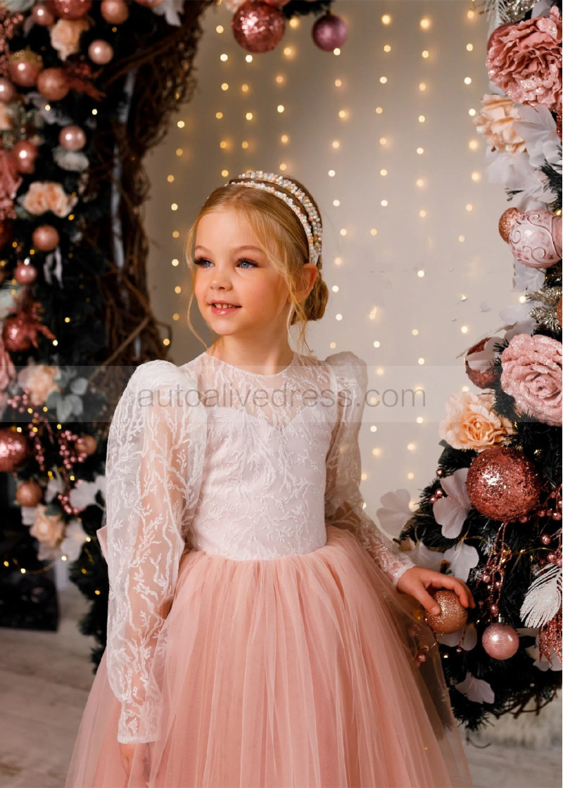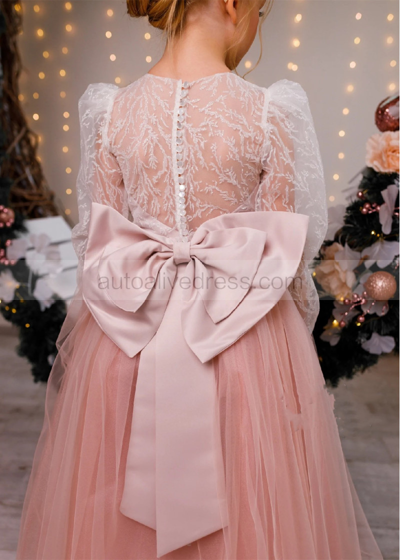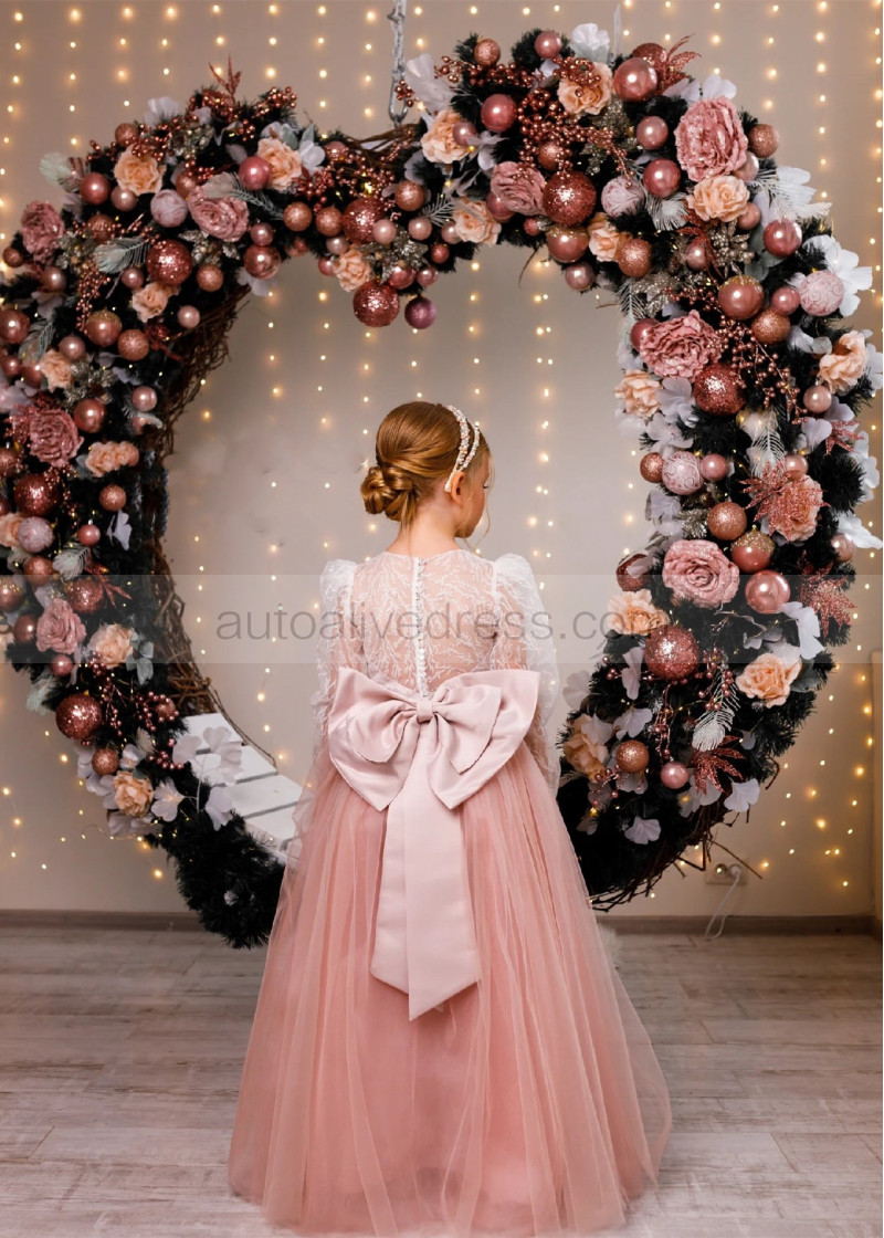 Dusty Rose Glitter Lace Tulle Buttons Back Flower Girl Dress