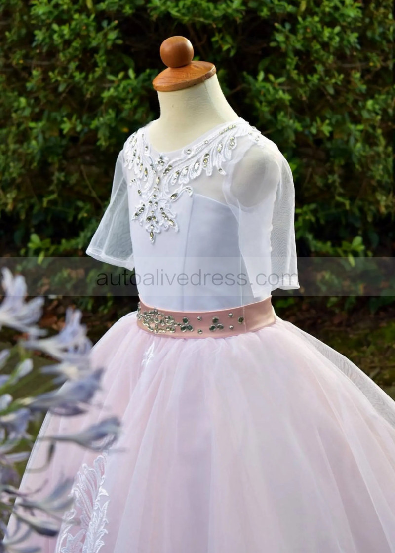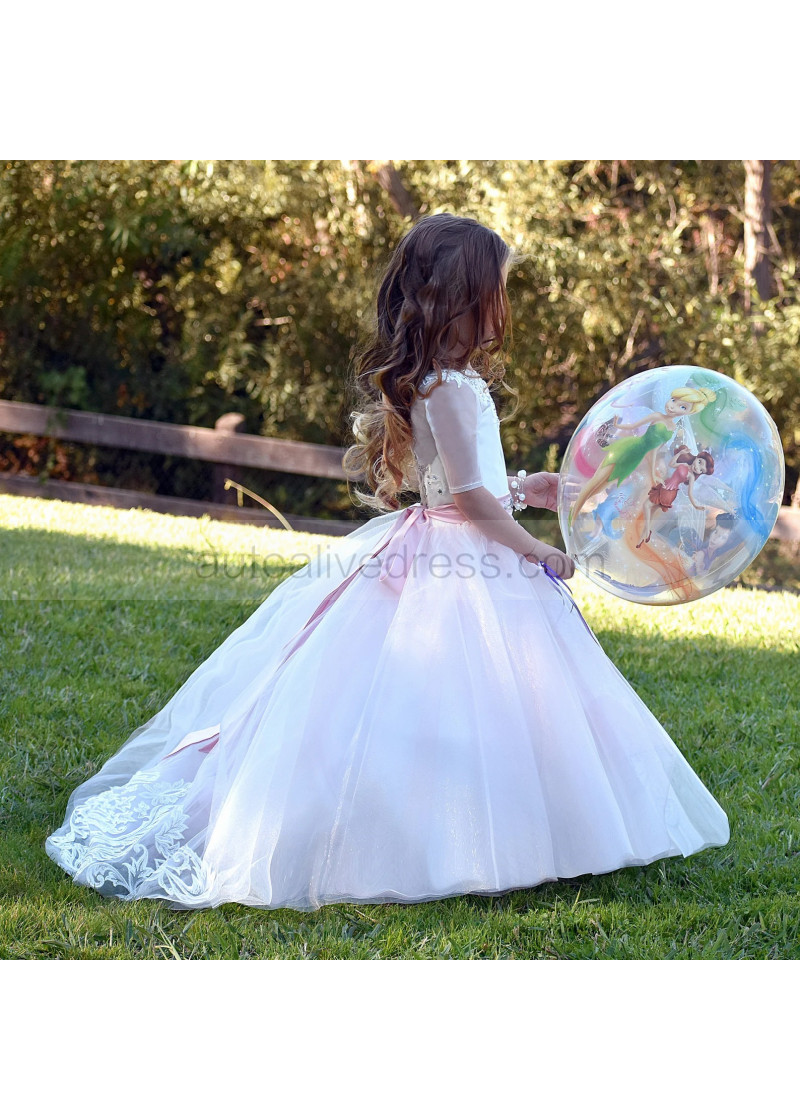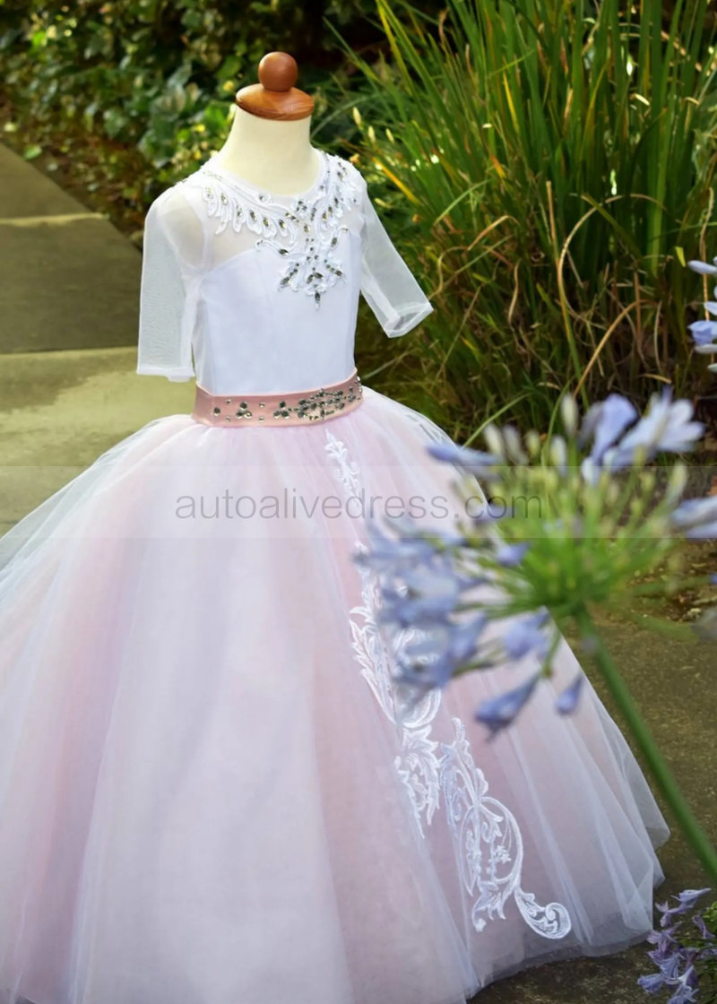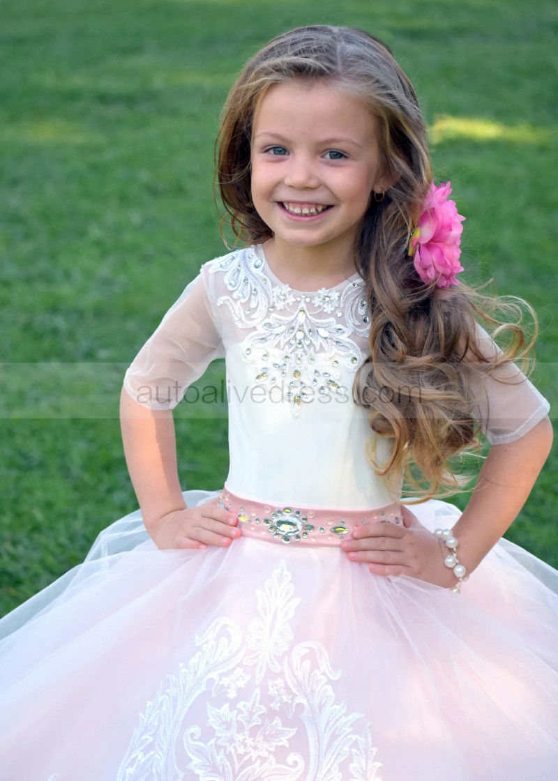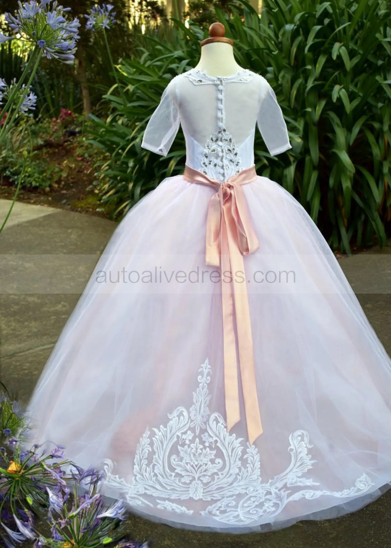 Elbow Sleeves Beaded Lace Tulle Buttons Back Flower Girl Dress