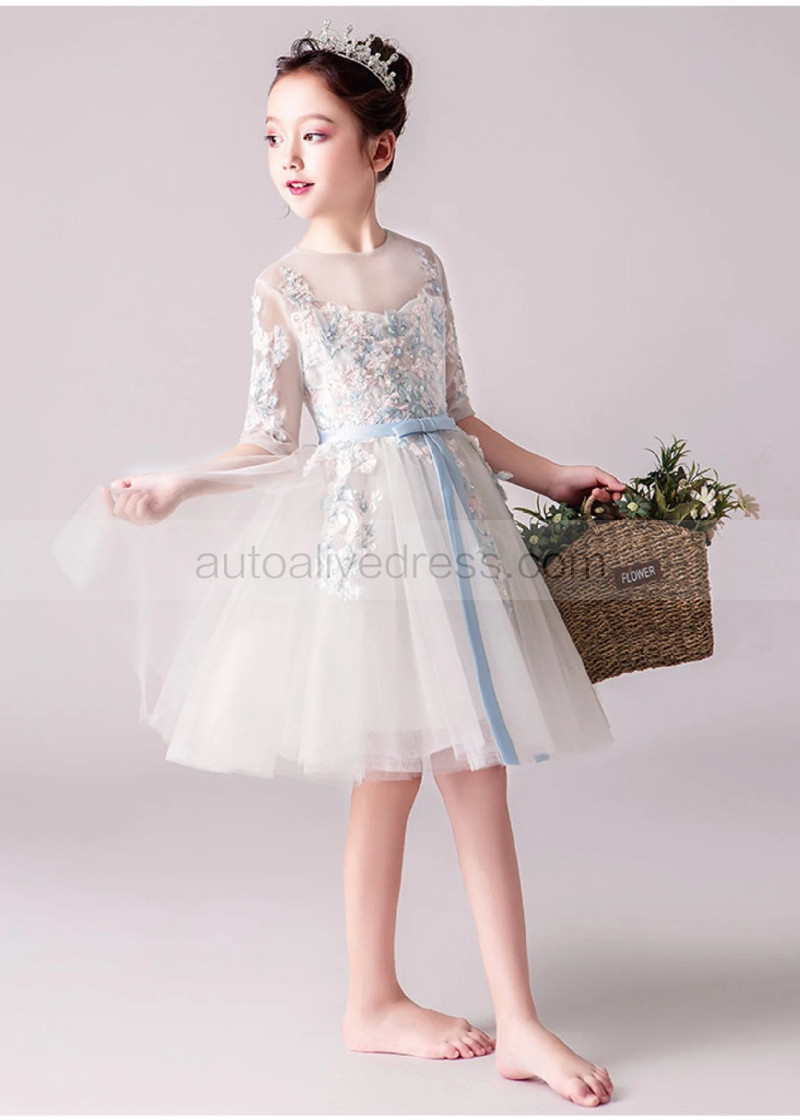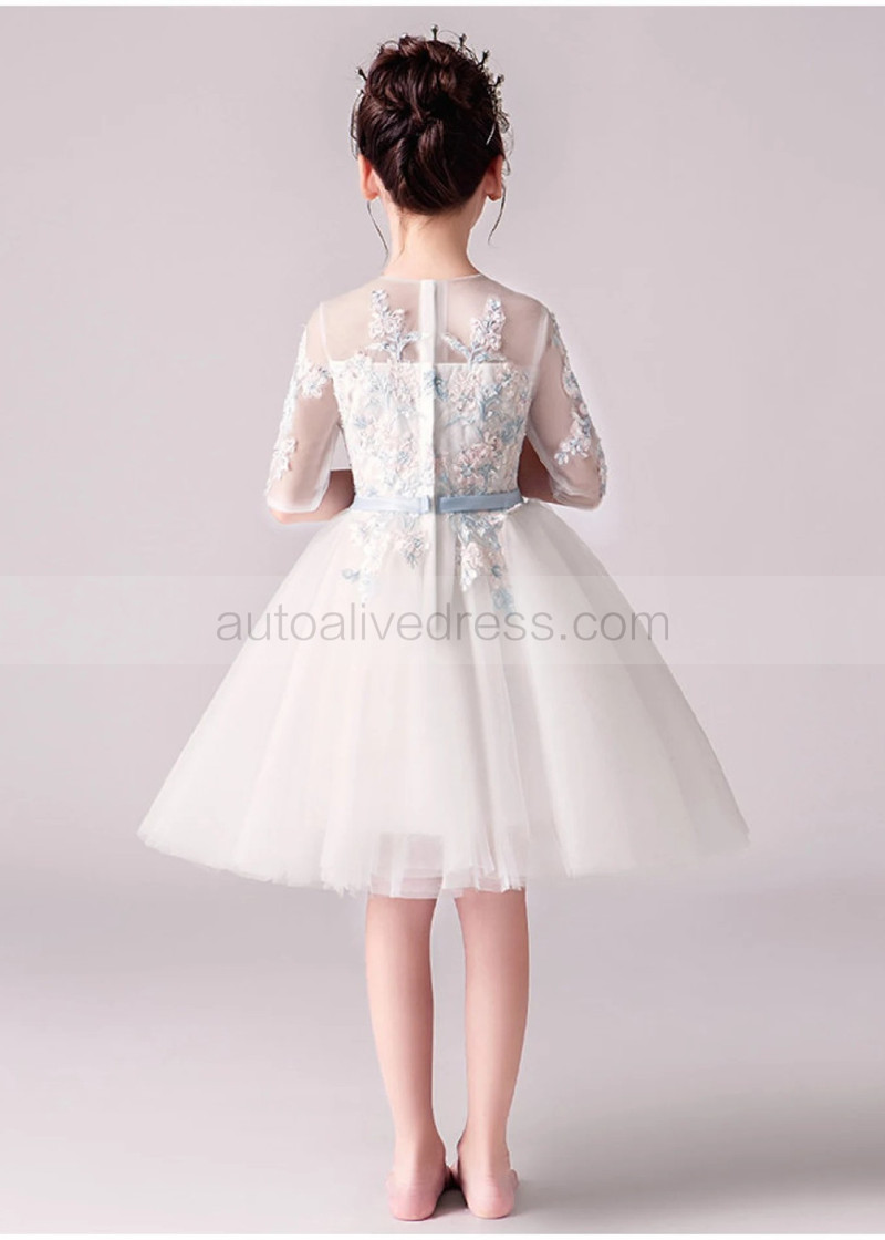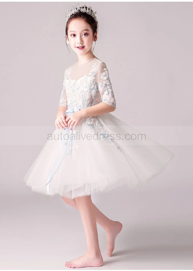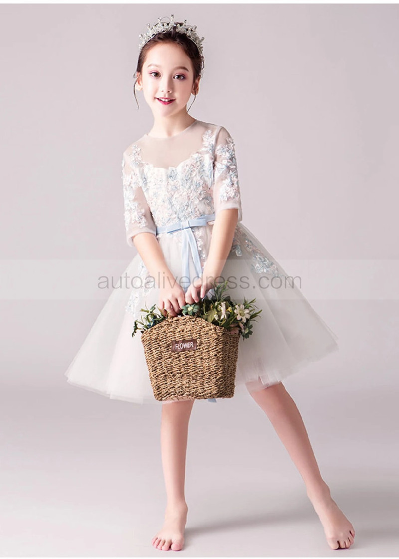 Elbow Sleeves Beaded Lace Tulle Flower Girl Dress