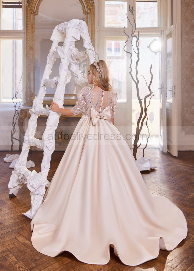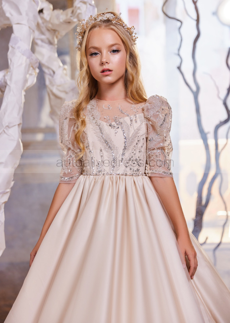 Elbow Sleeves Beaded Light Cappuccino Lace Satin Flower Girl Dress