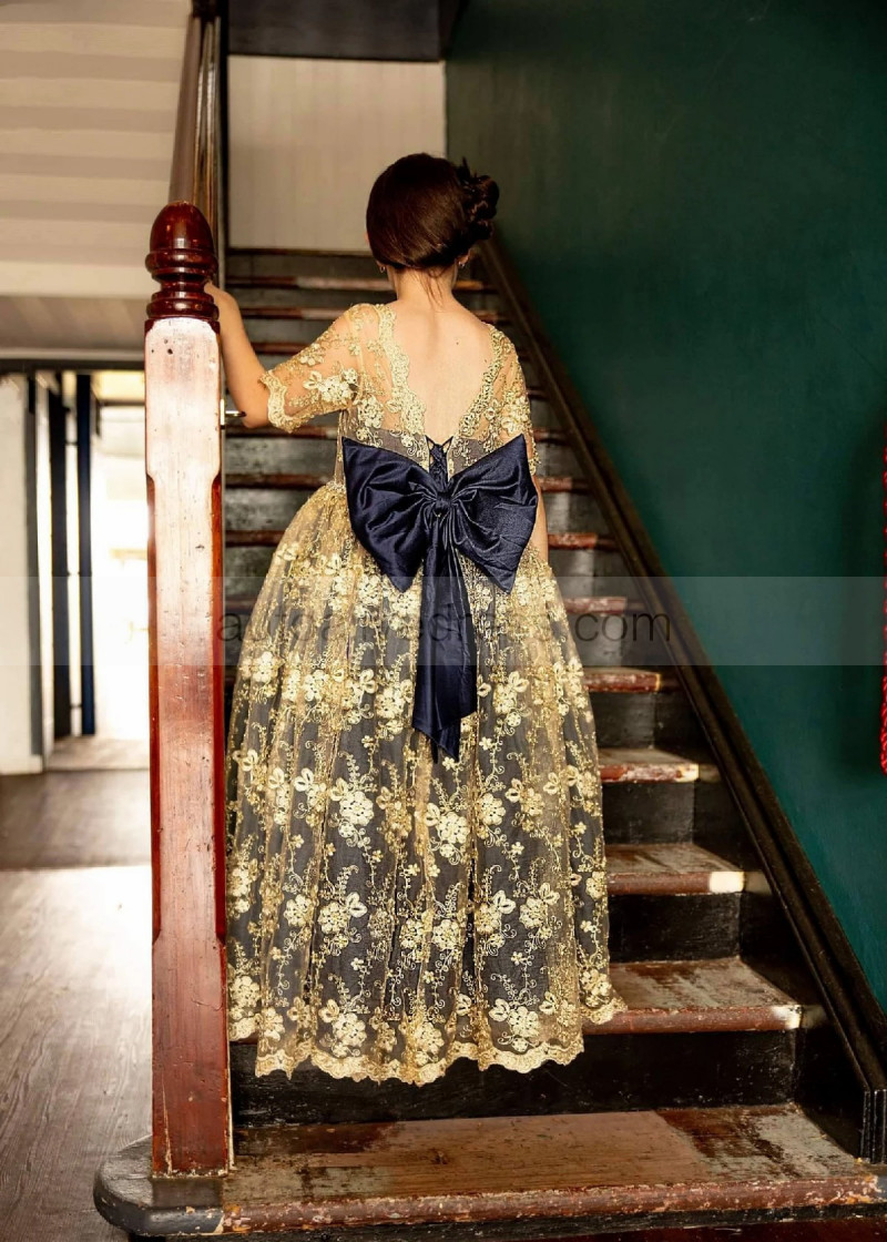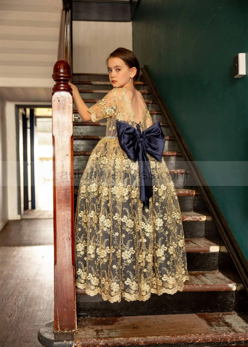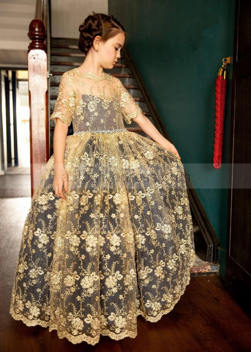 Elbow Sleeves Gold Lace V Corset Back Flower Girl Dress