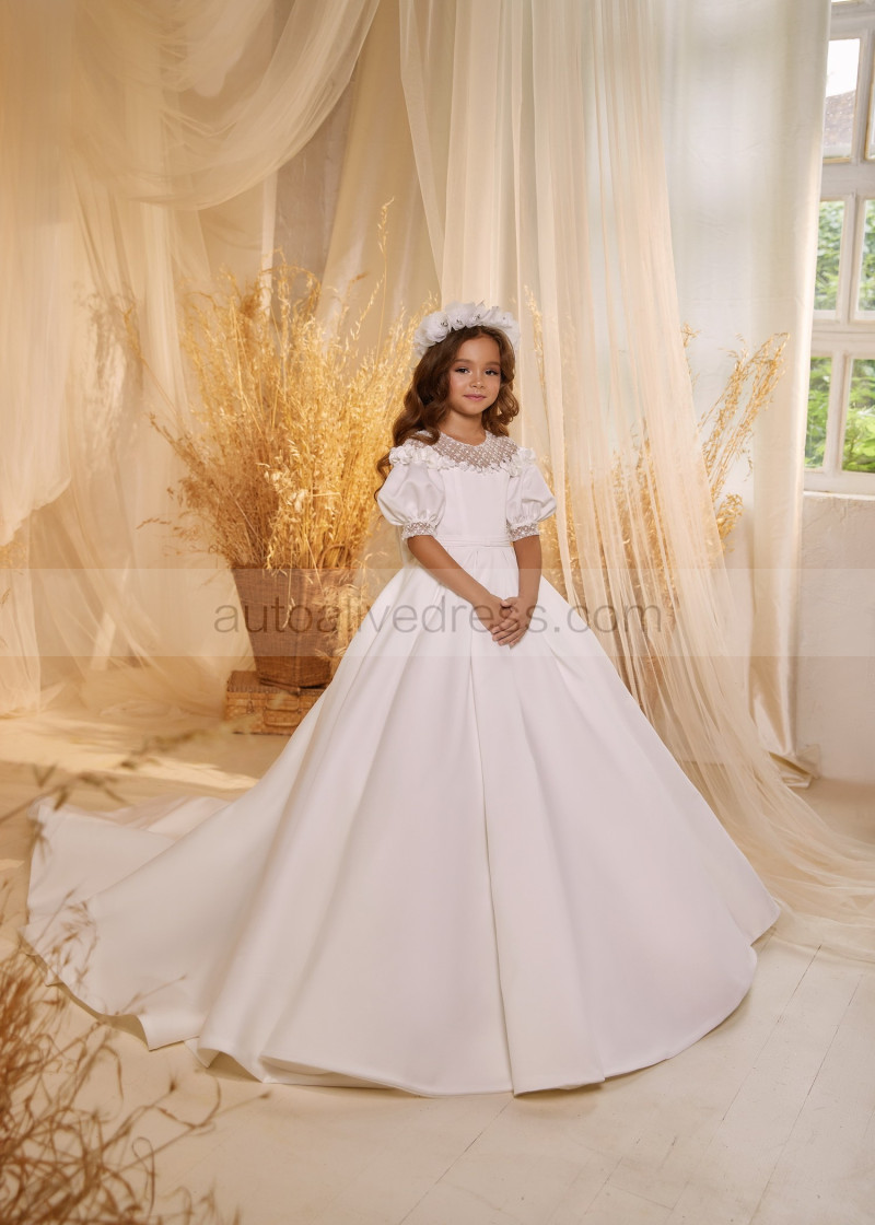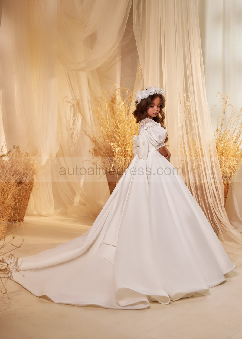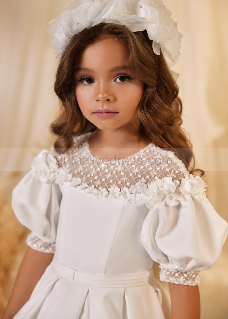 Elbow Sleeves Ivory Lace Satin Floral Flower Girl Dress
