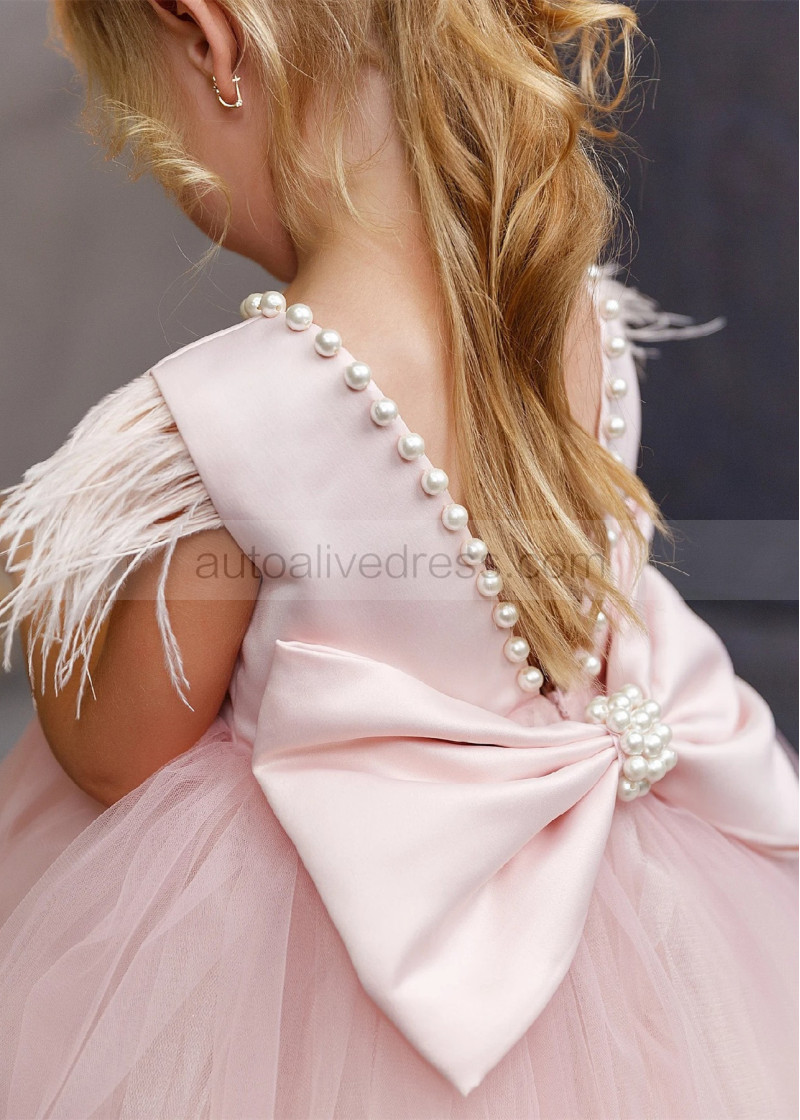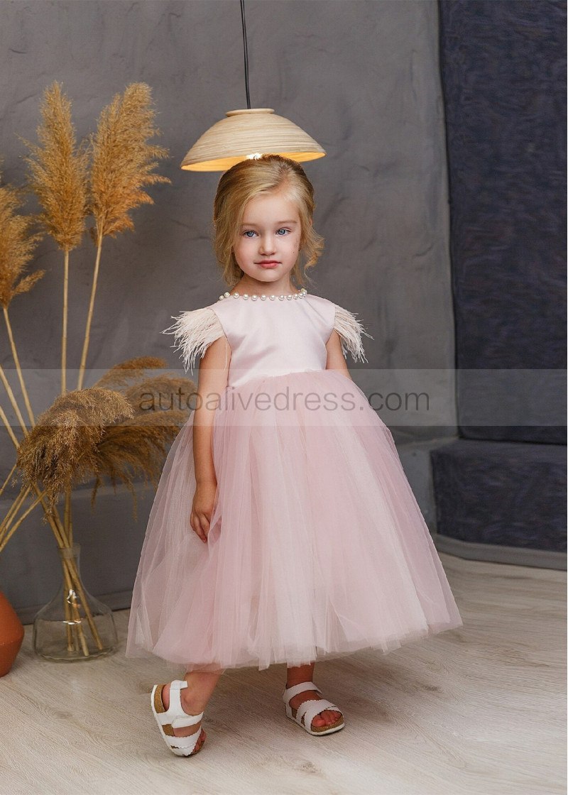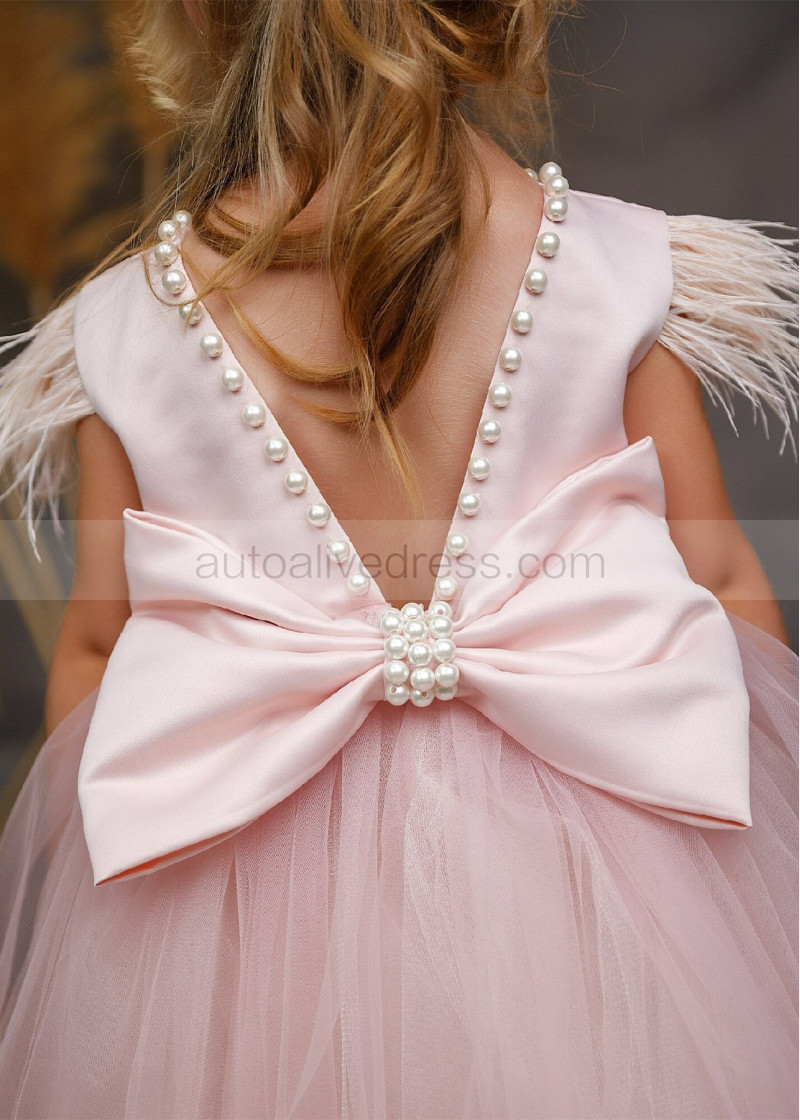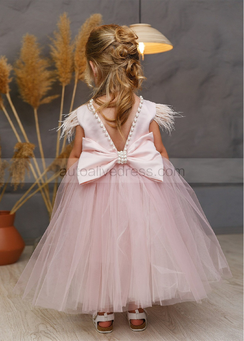 Feather Sleeve Blush Satin Tulle V Back Flower Girl Dress