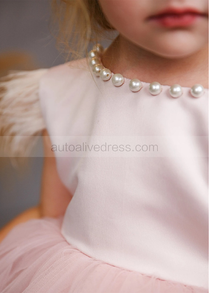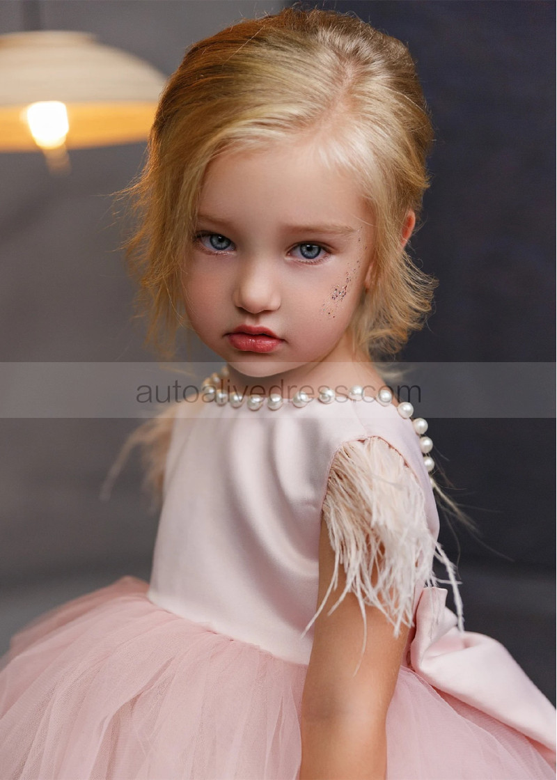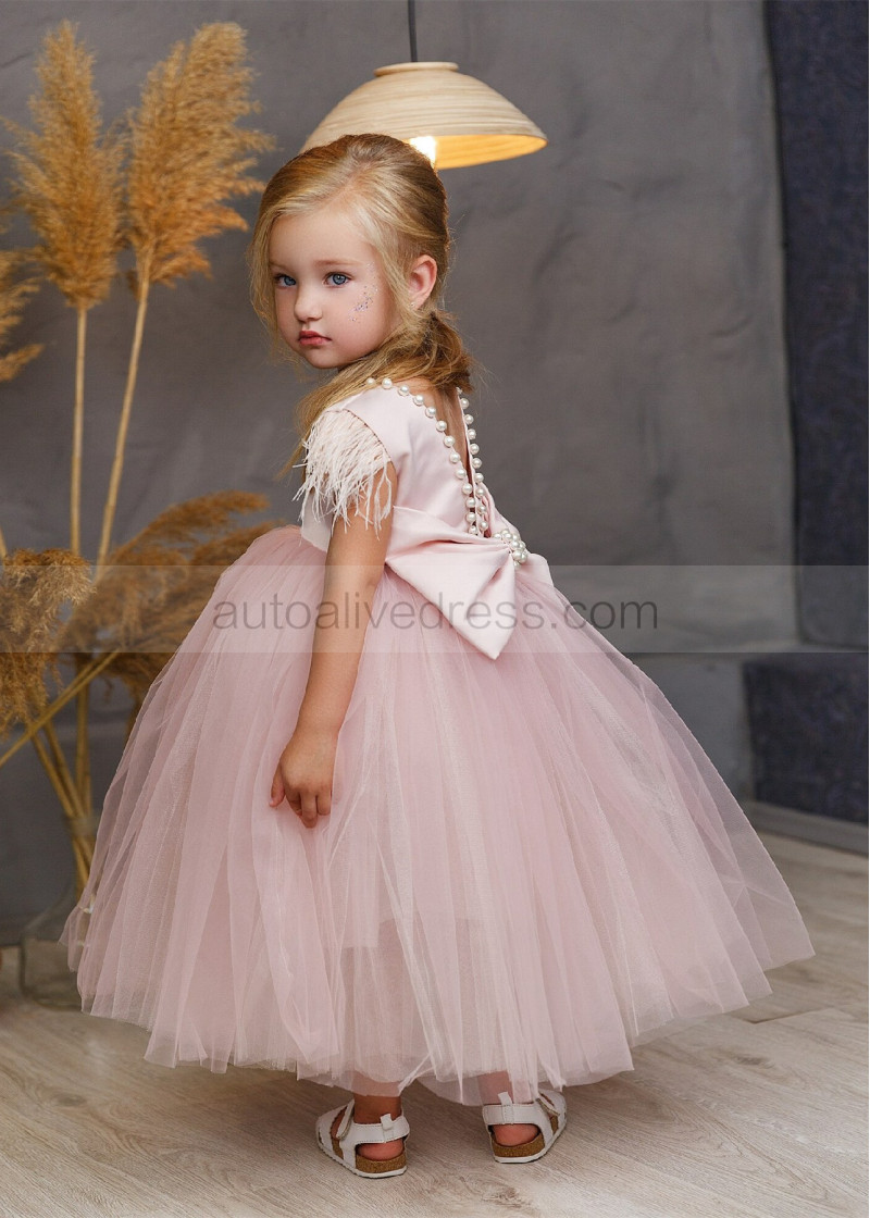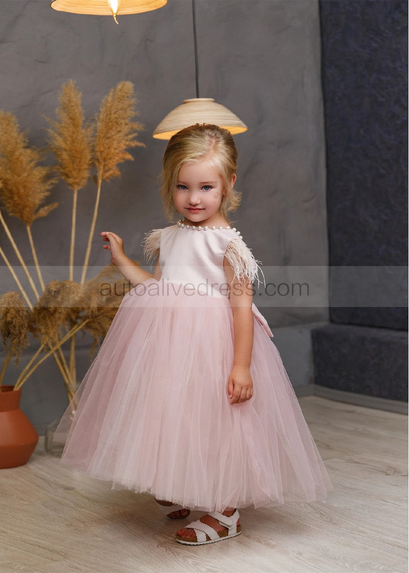 Feather Sleeve Blush Satin Tulle V Back Flower Girl Dress
