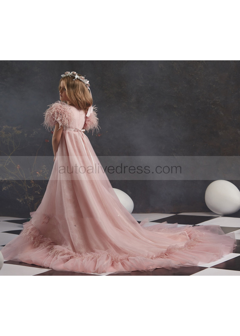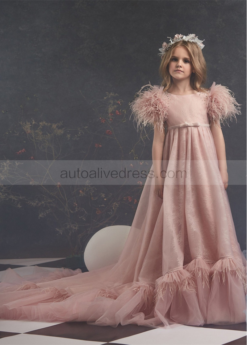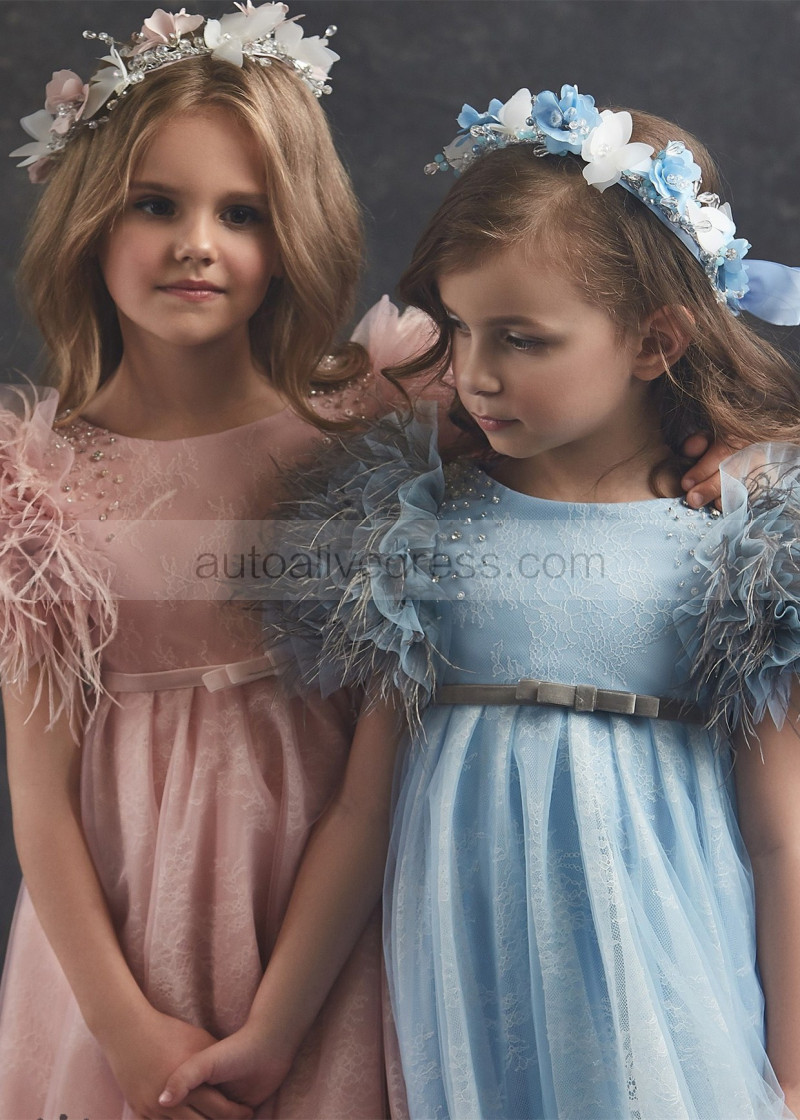 Feather Sleeves Beaded Lace Tulle Flower Girl Dress