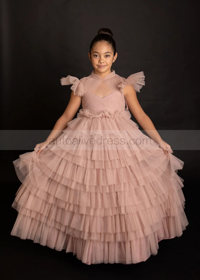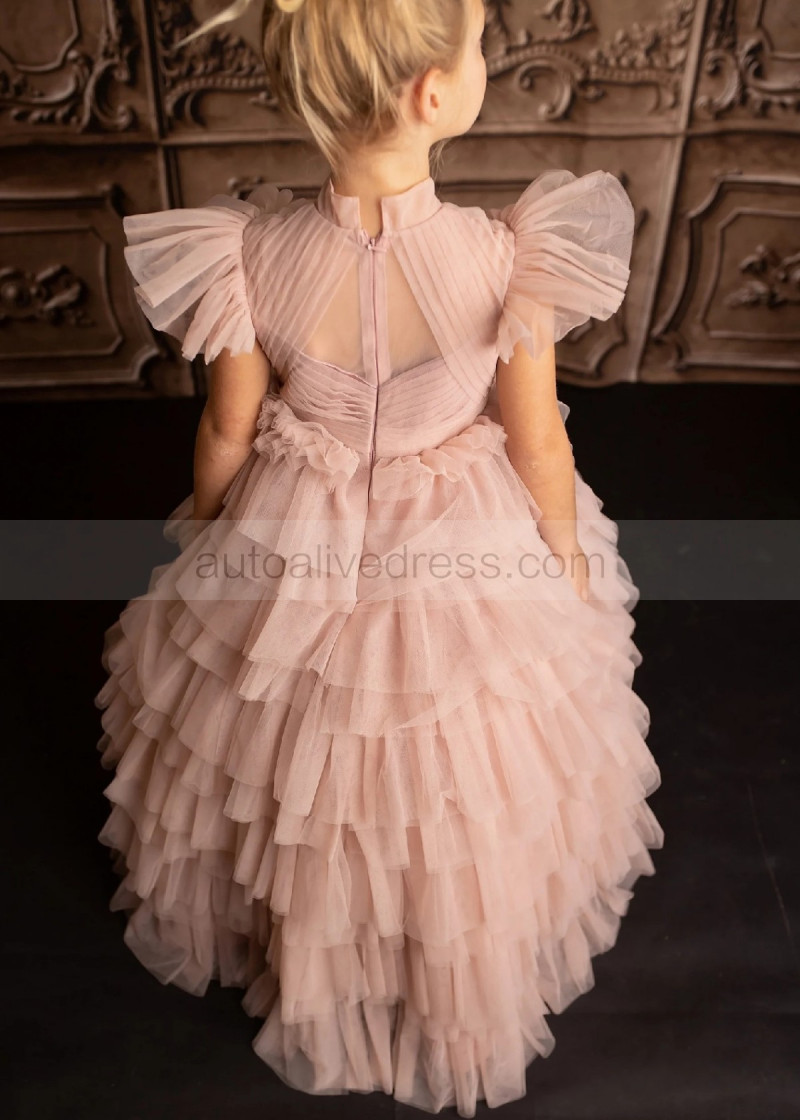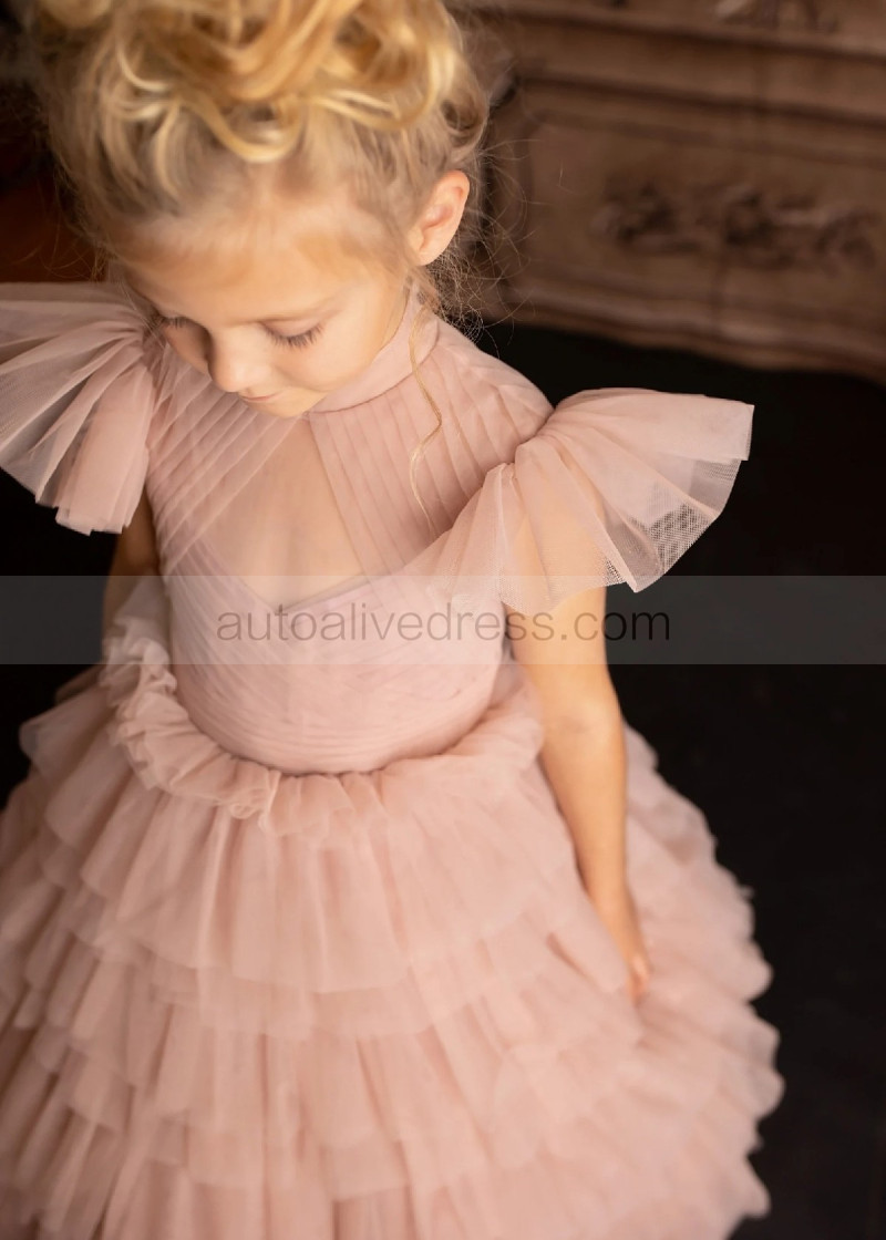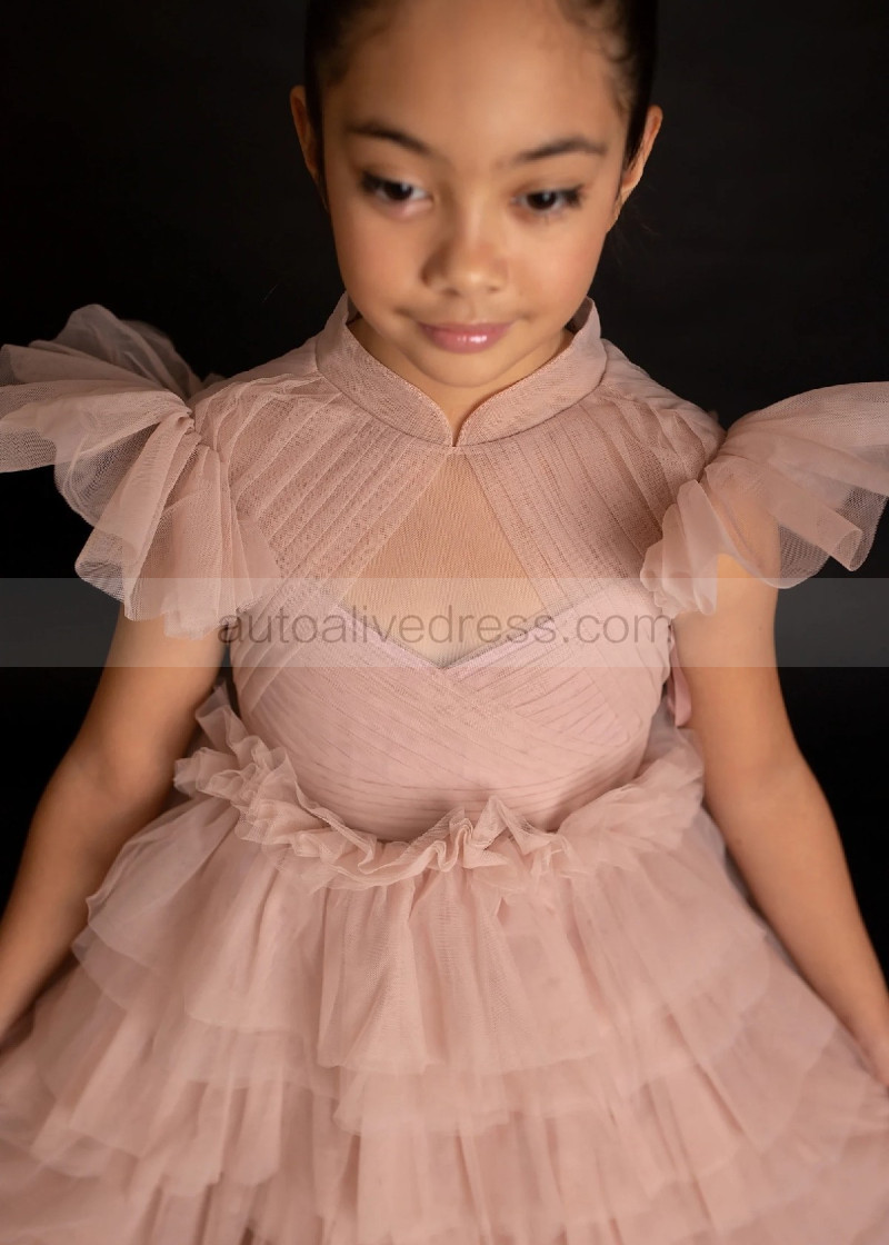 Feifei Sleeves Mauve Pink Pleated Tulle Ruffled Flower Girl Dress