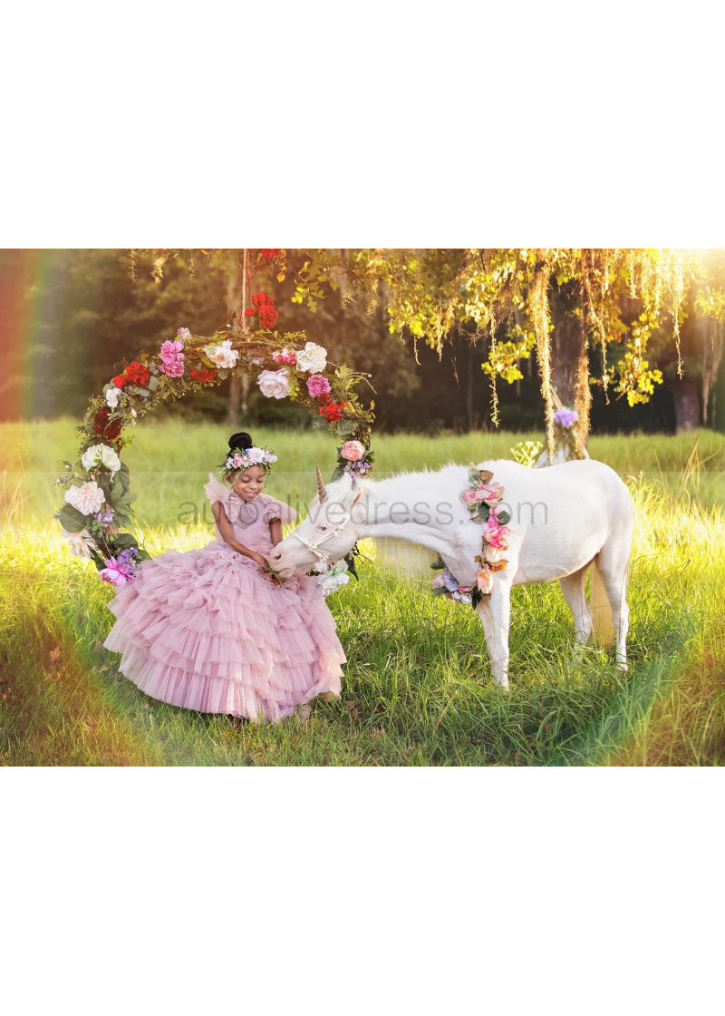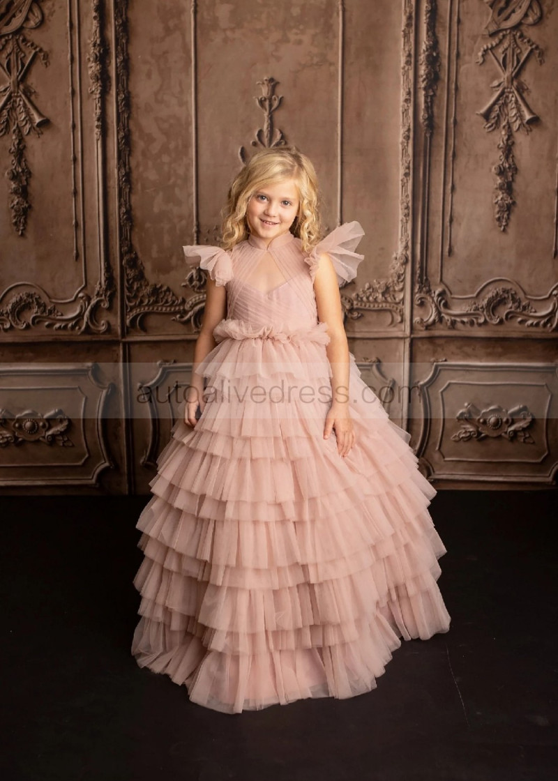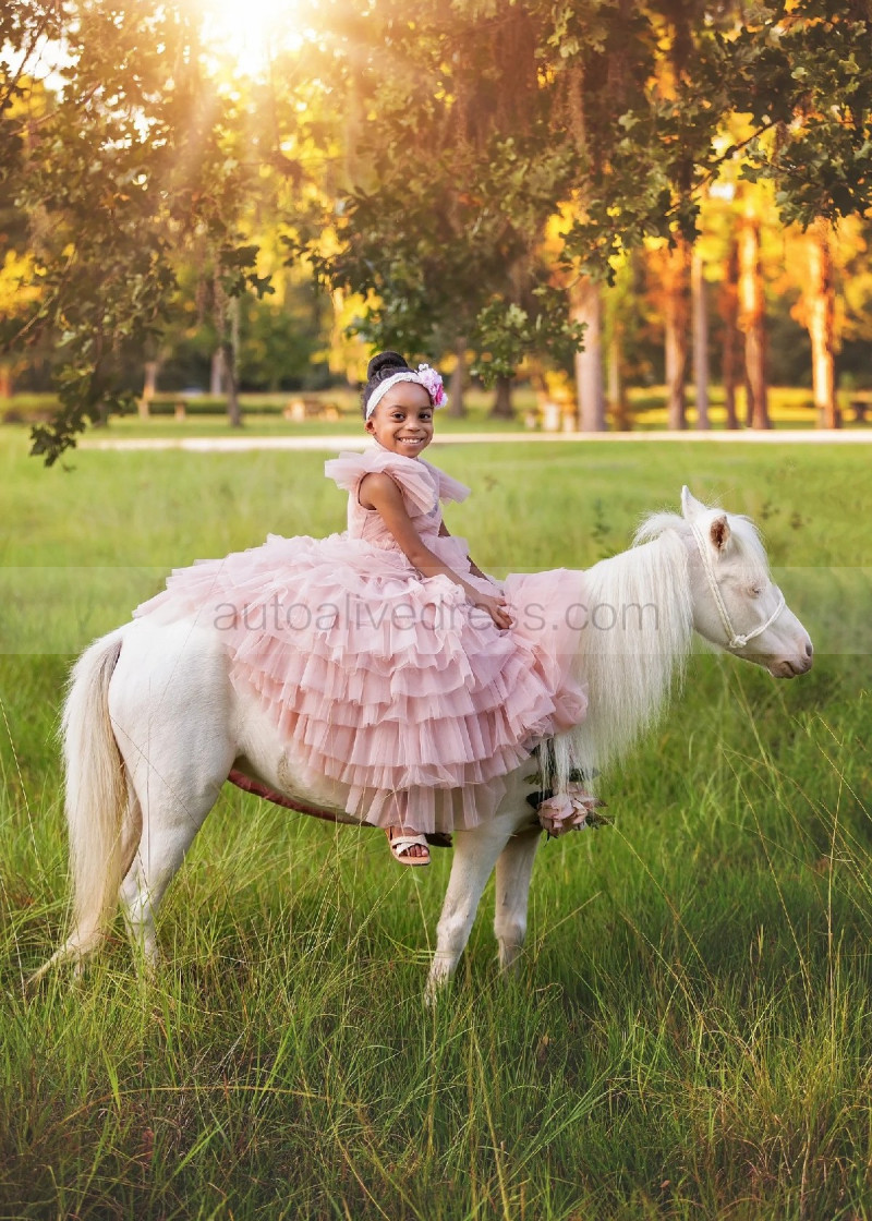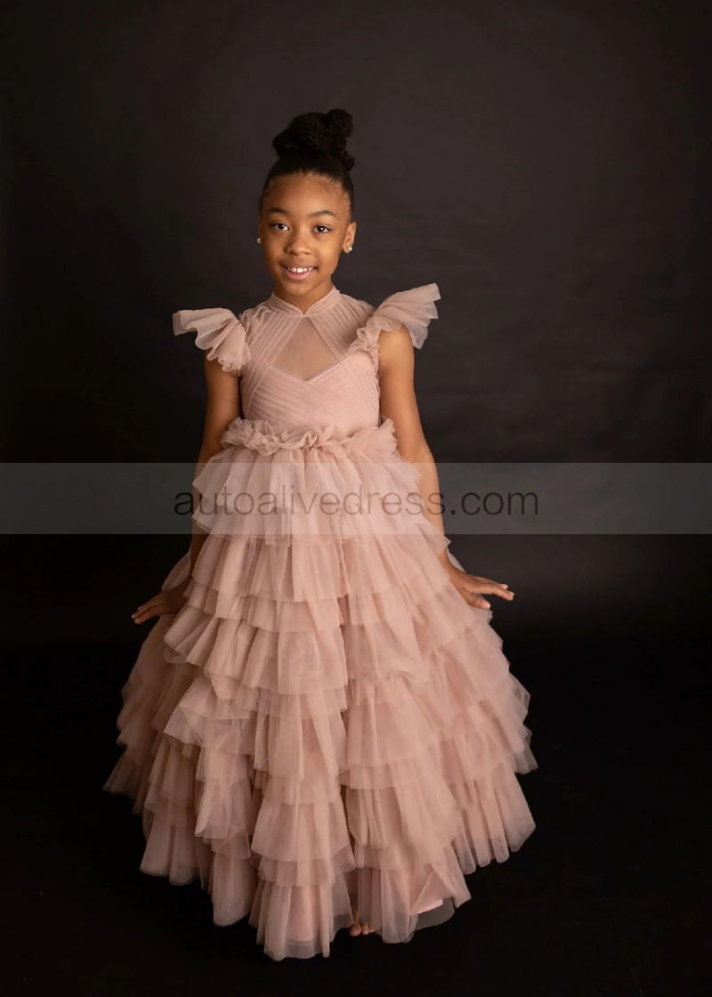 Feifei Sleeves Mauve Pink Pleated Tulle Ruffled Flower Girl Dress