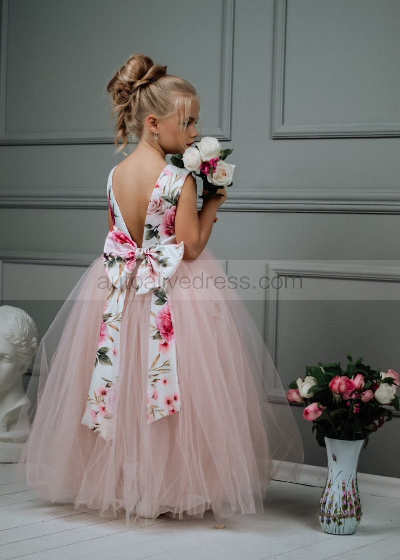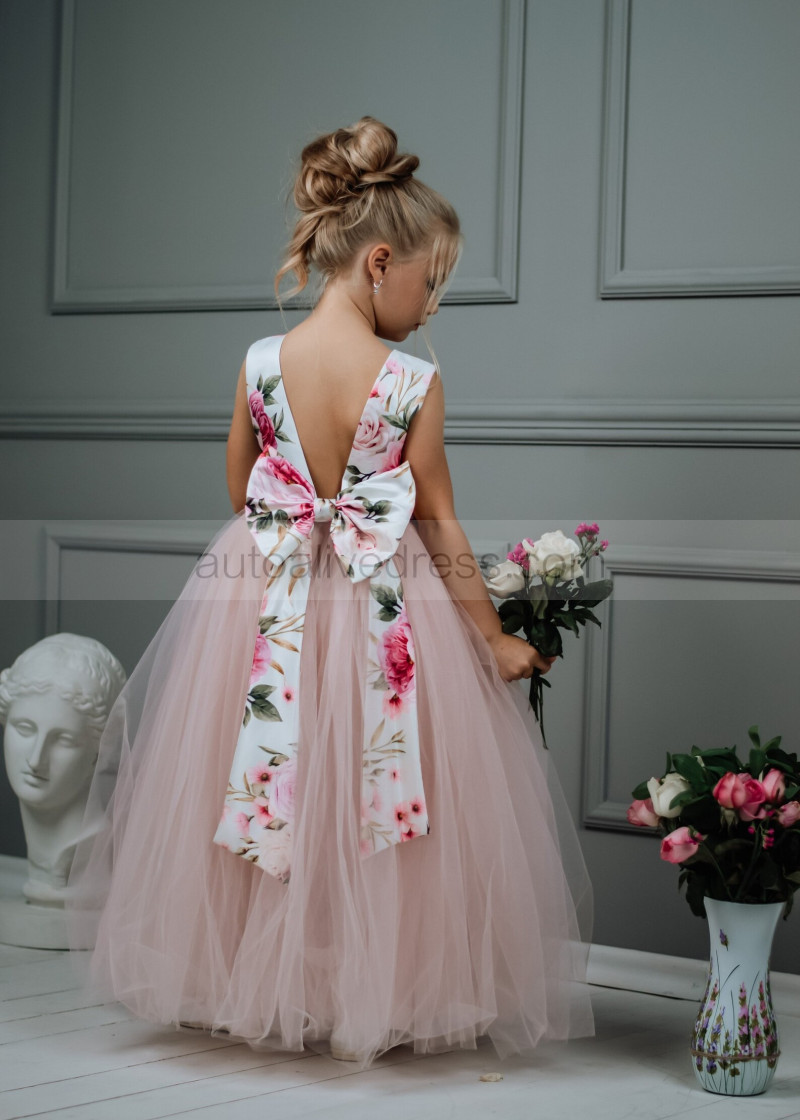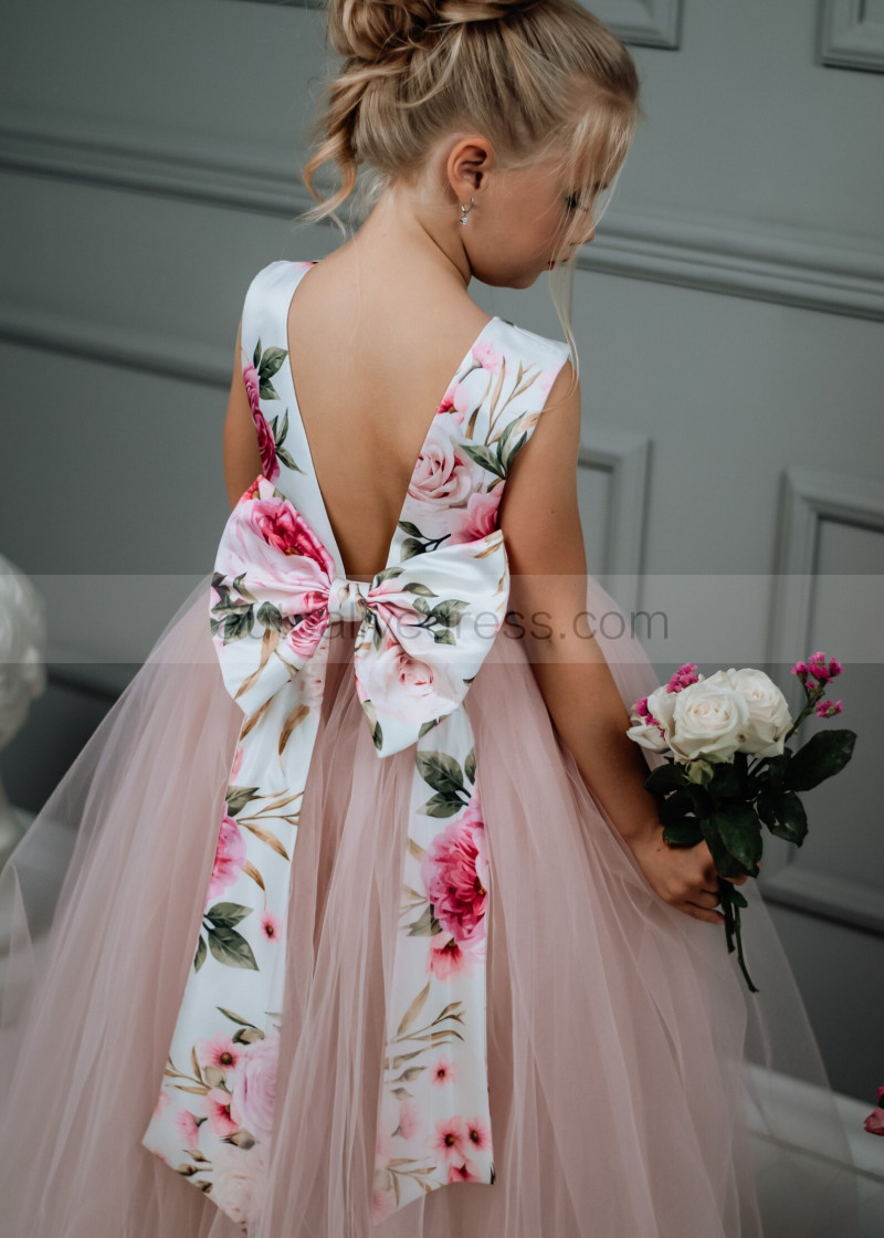 Floral Printed Satin Tulle V Back Flower Girl Dress