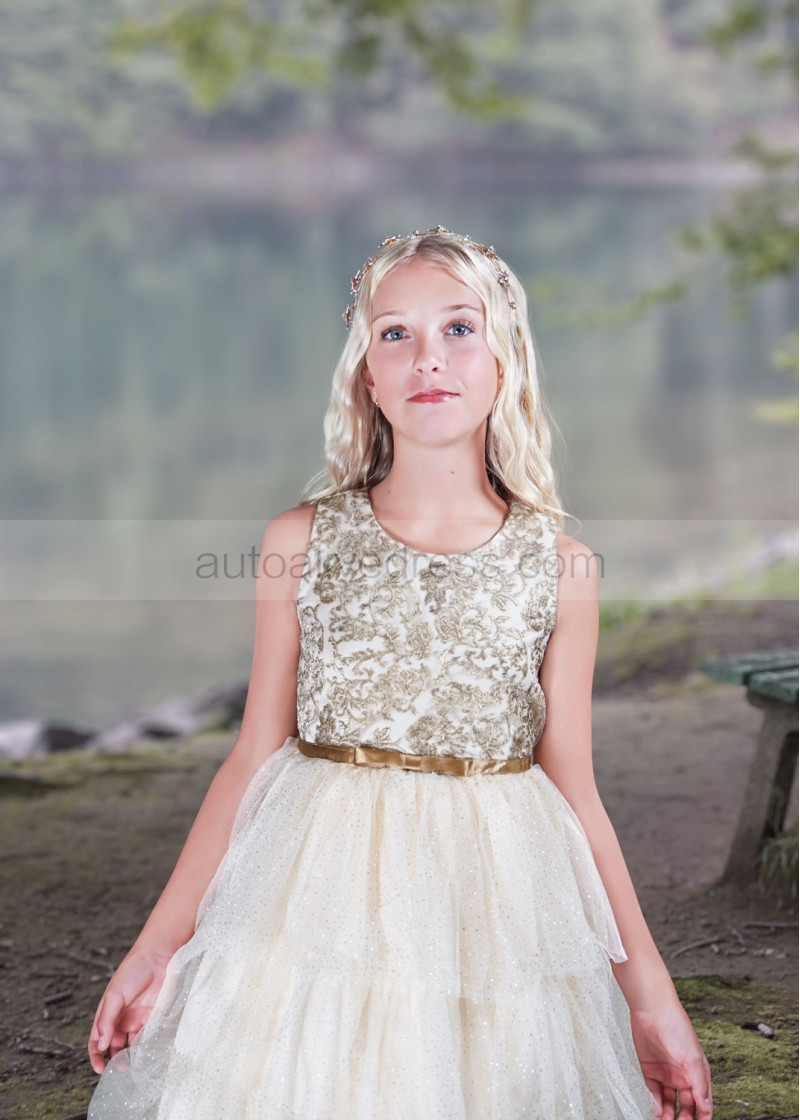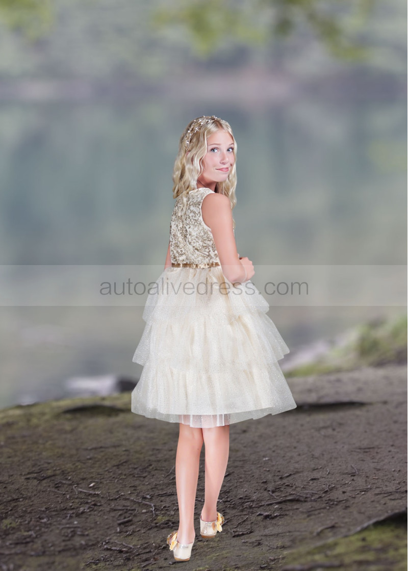 Gold Lace Champagne Glitter Tulle Tiered Flower Girl Dress