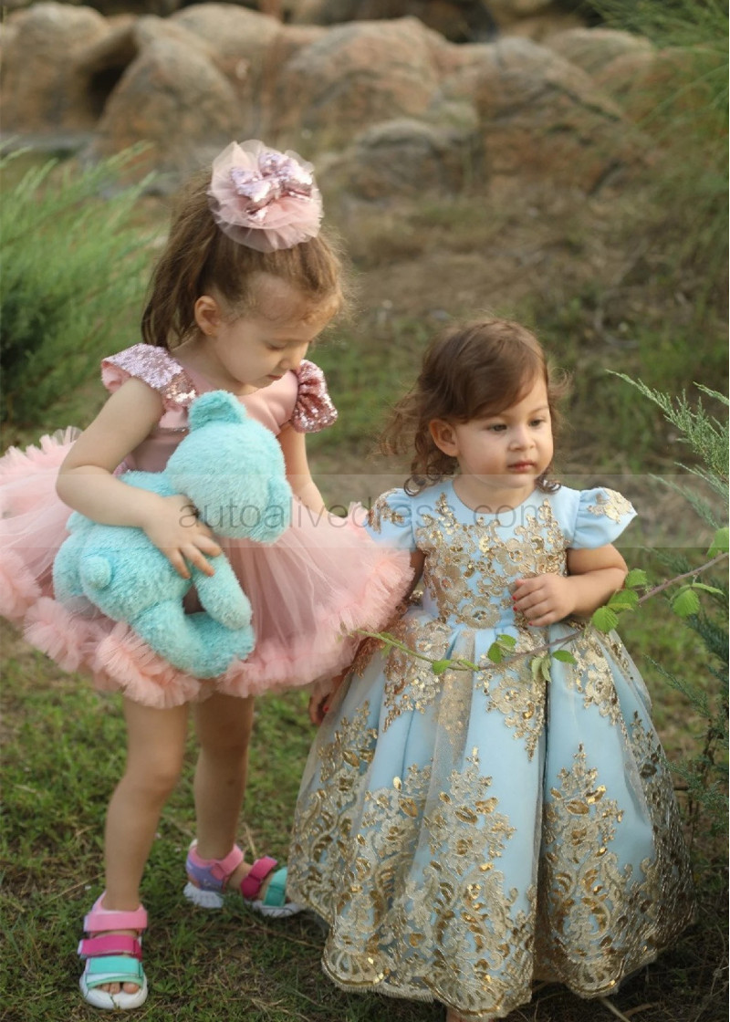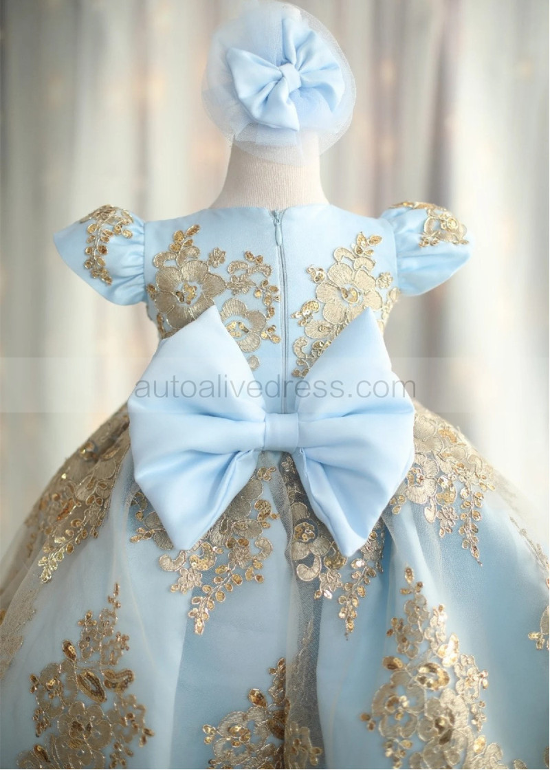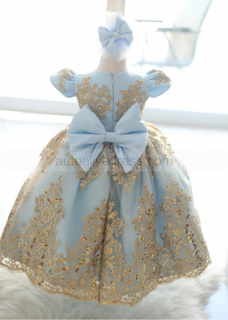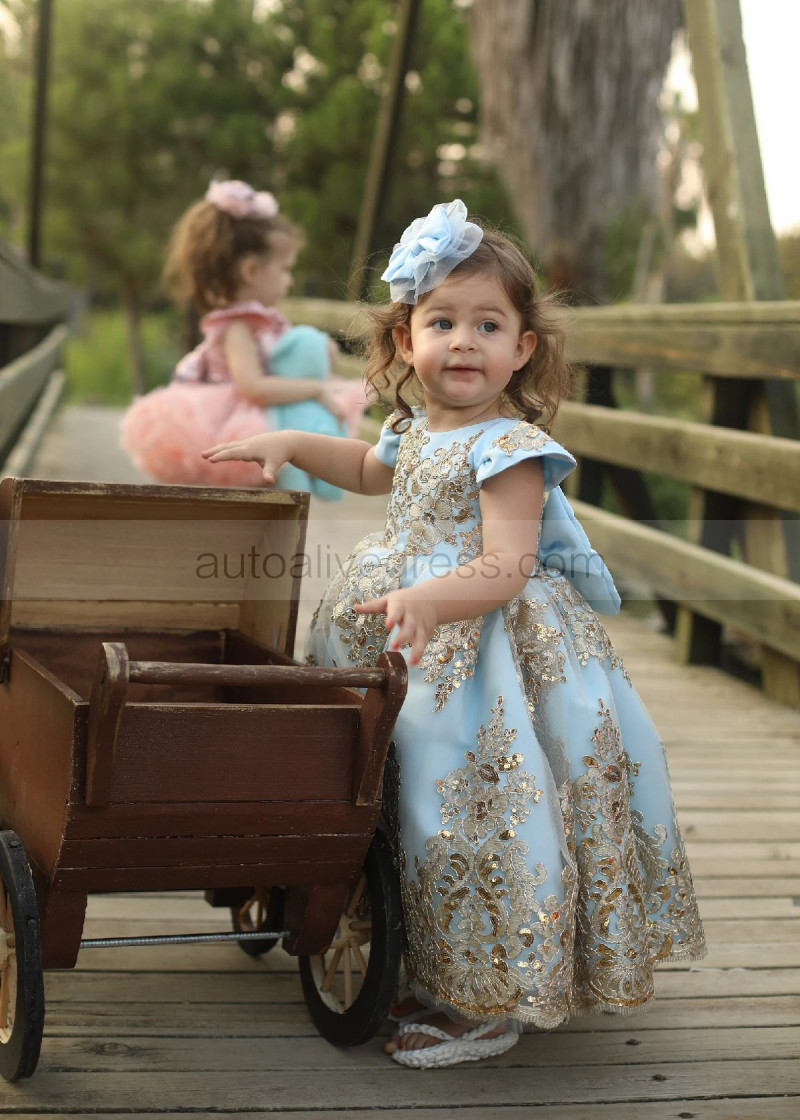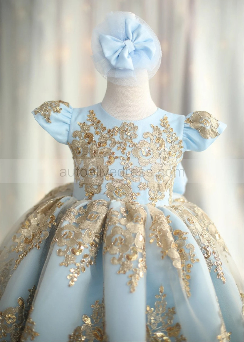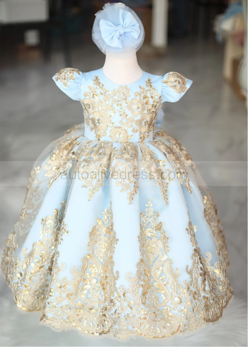 Gold Lace Sky Blue Tulle Fancy Flower Girl Dress