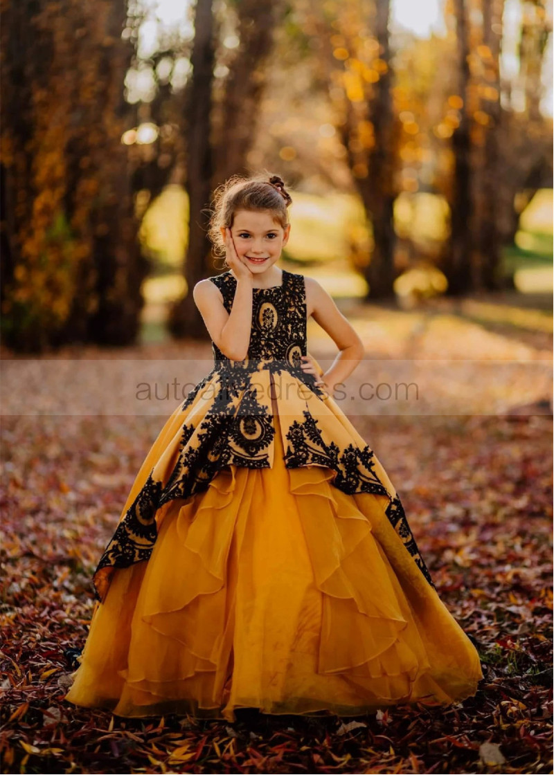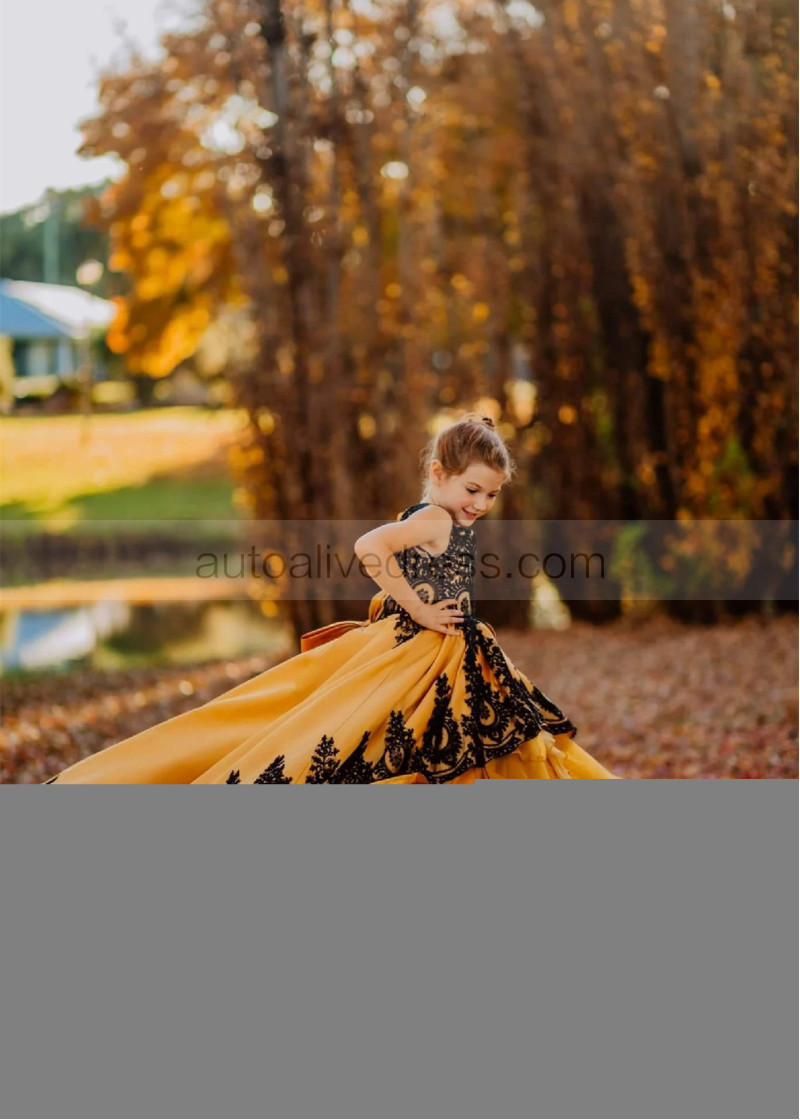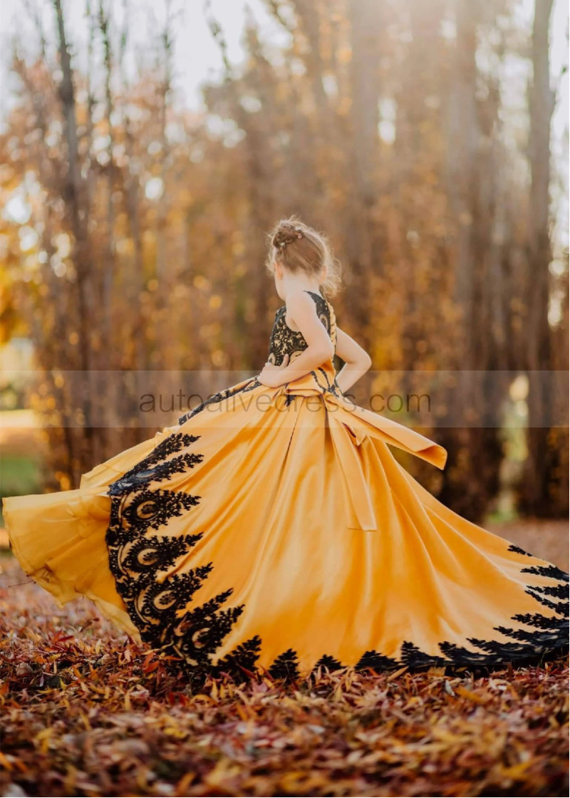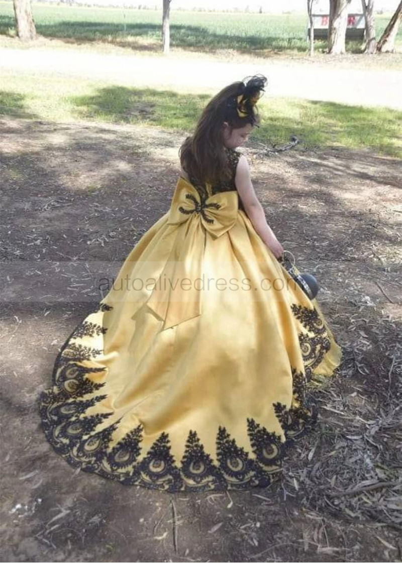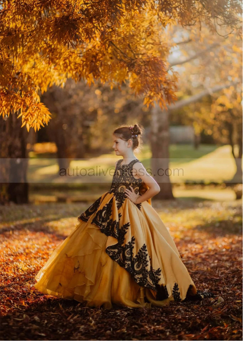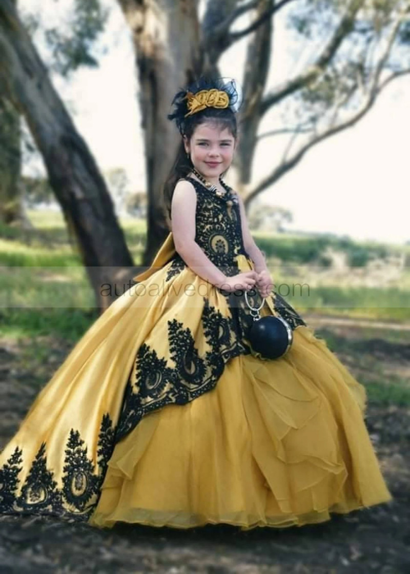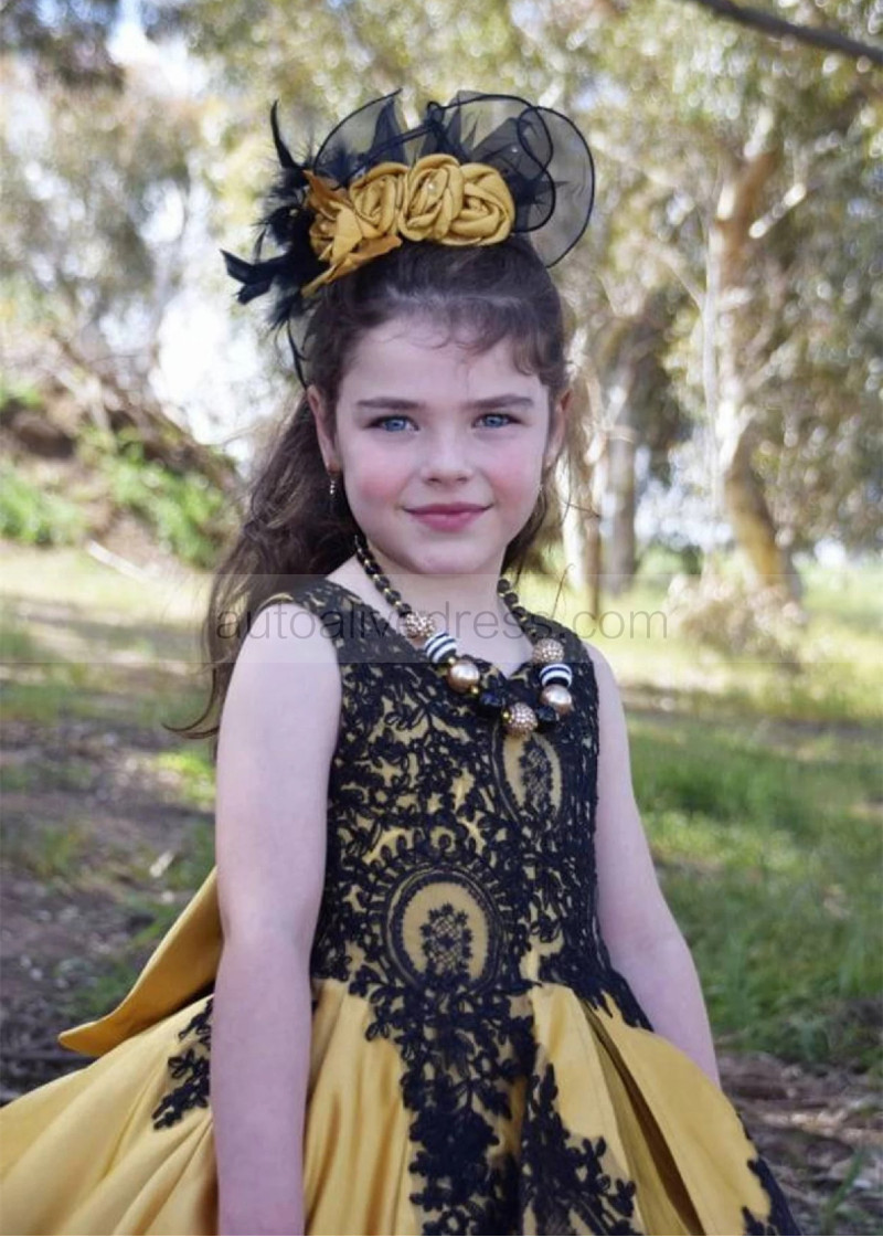 Gold Satin Black Lace Stunning Flower Girl Dress