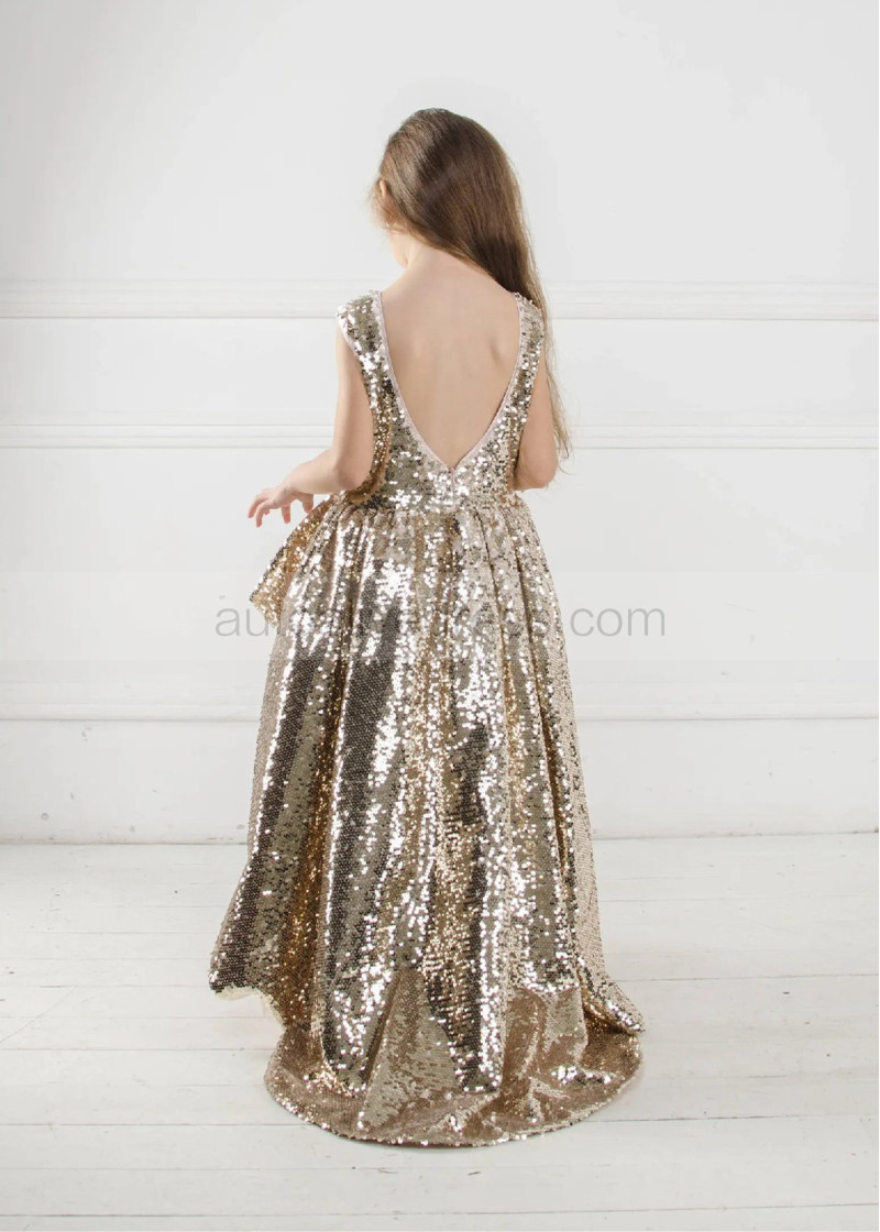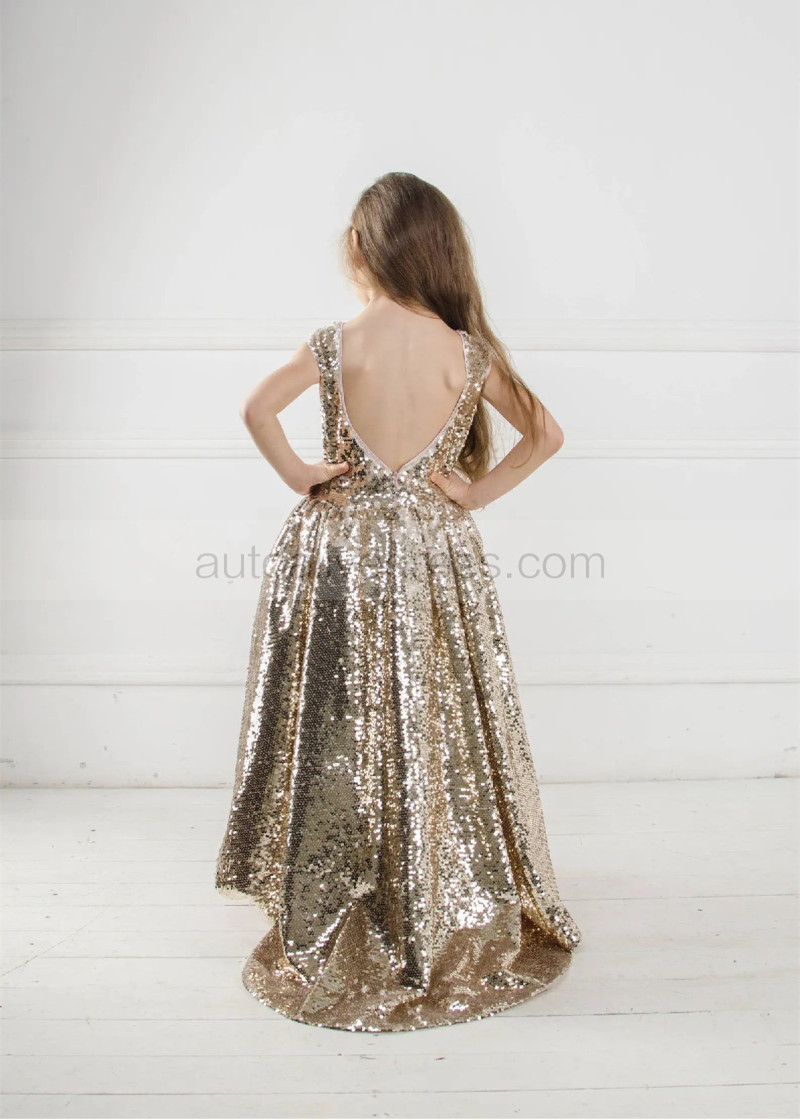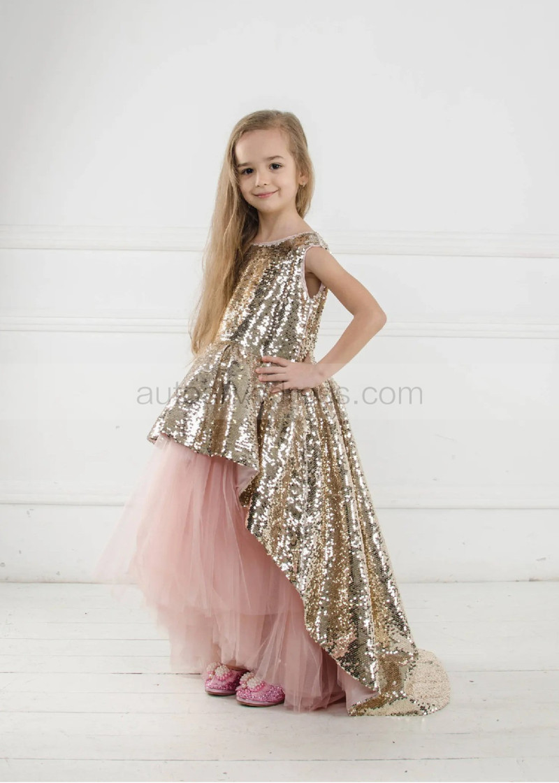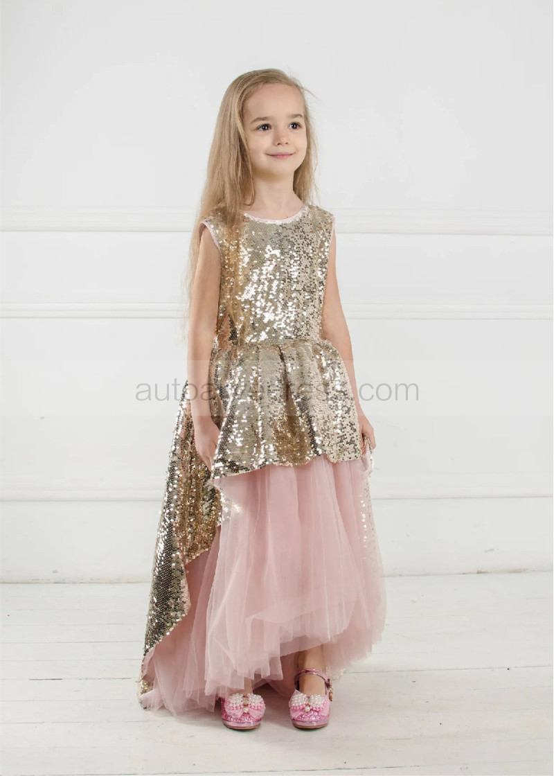 Gold Sequins Blush Pink Tulle High Low Flower Girl Dress