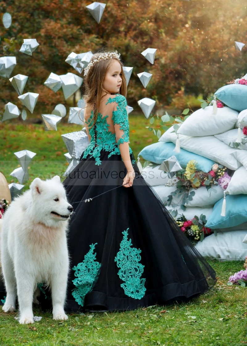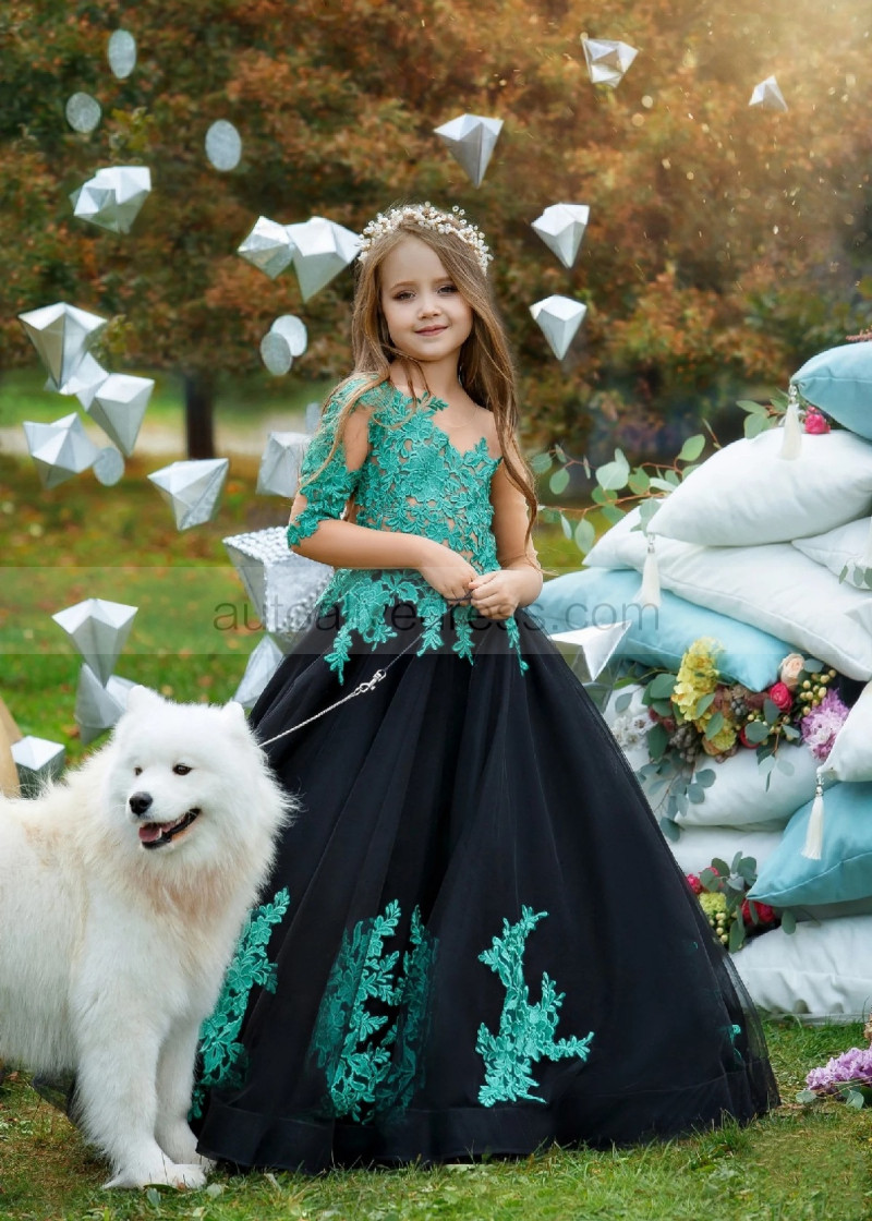 Green Lace Black Tulle Buttons Back Latest Flower Girl Dress