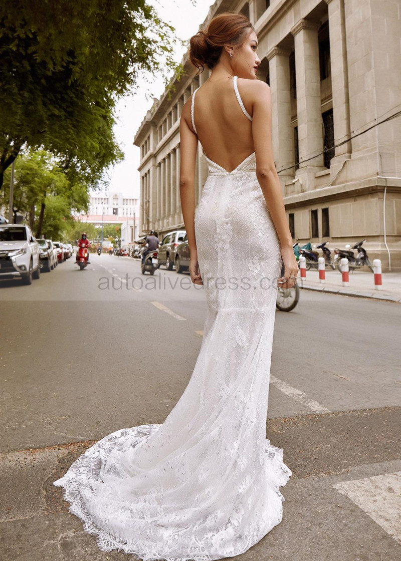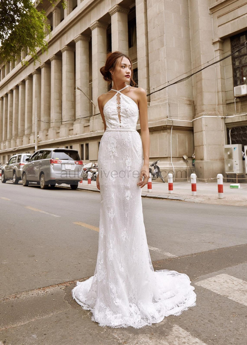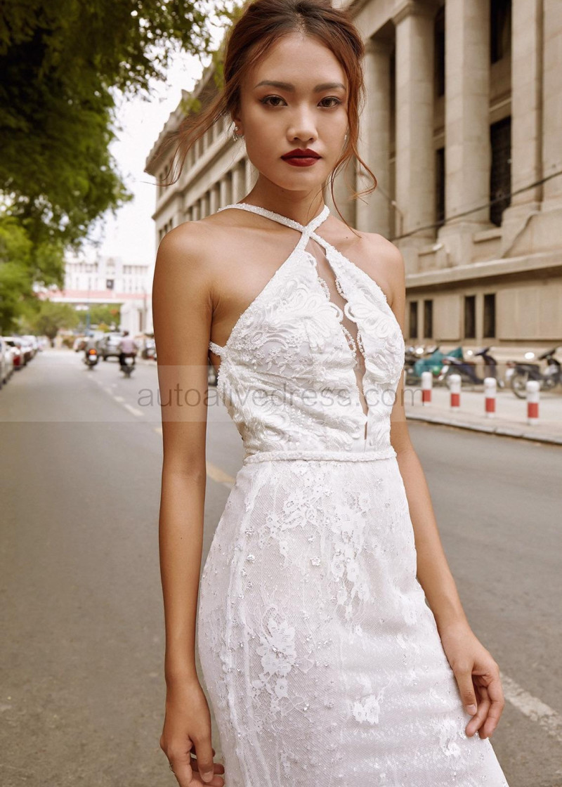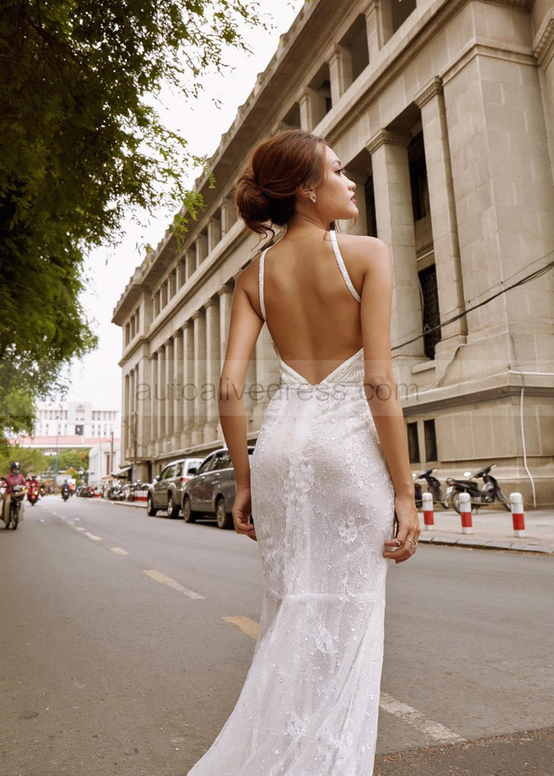 Halter Beaded Ivory Eyelash Lace Backless Wedding Dress
