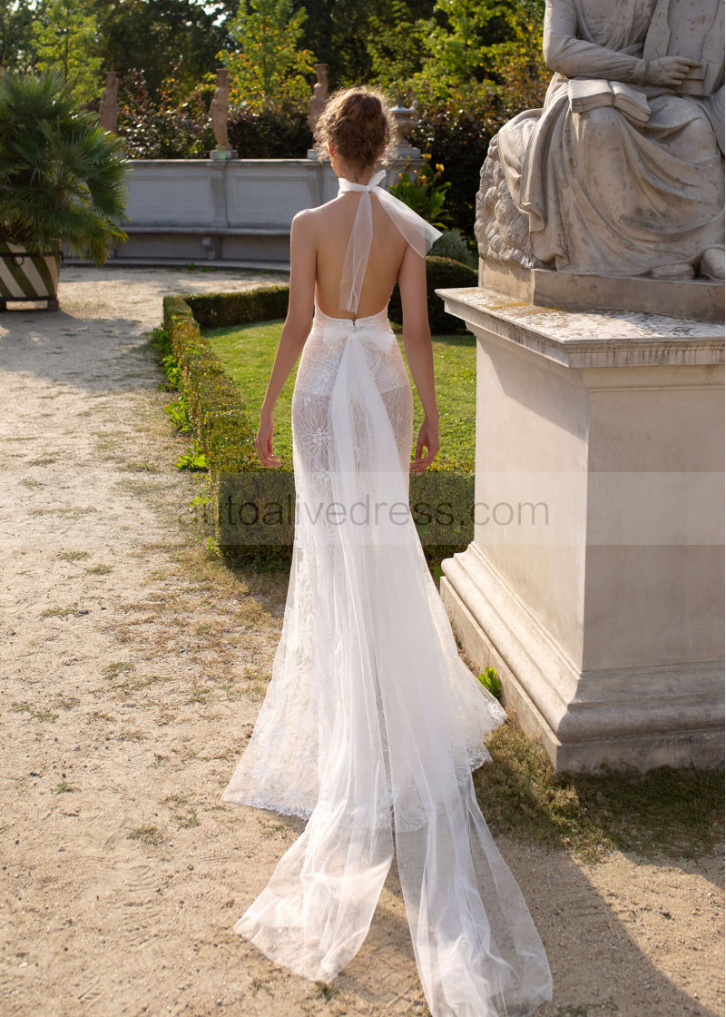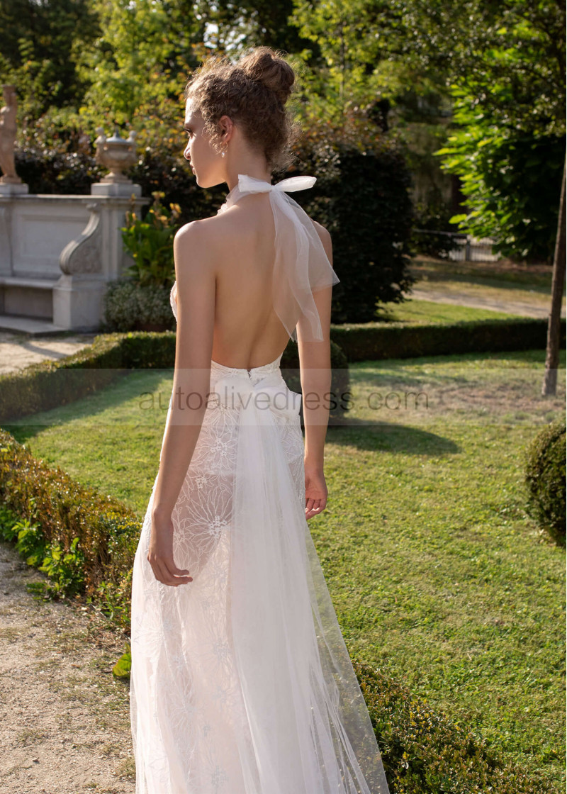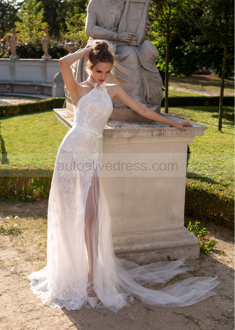 Halter Beaded Ivory Lace Tulle Slit Wedding Dress