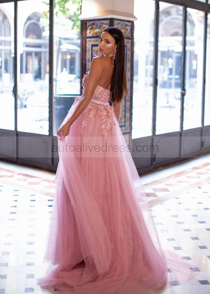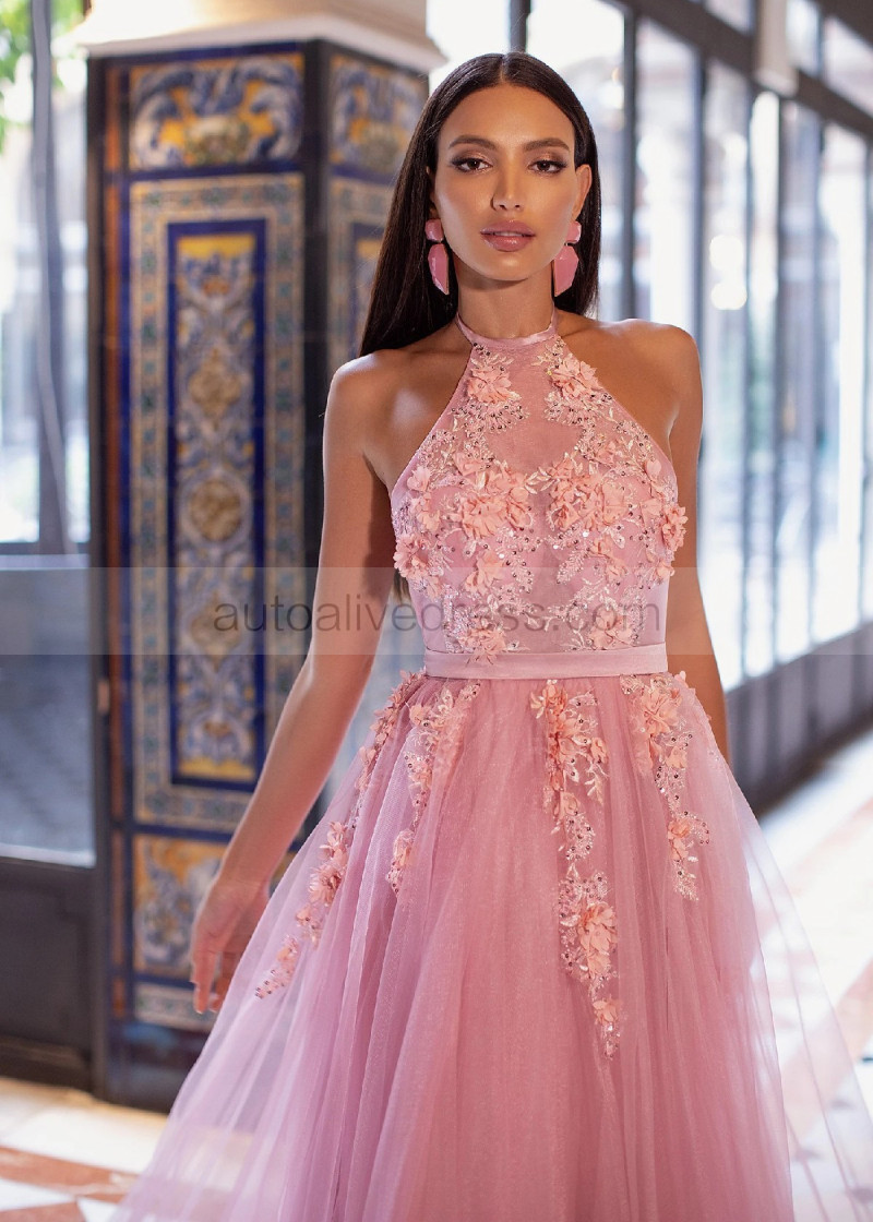 Halter Neck Beaded Pink Lace Tulle Floral Evening Dress