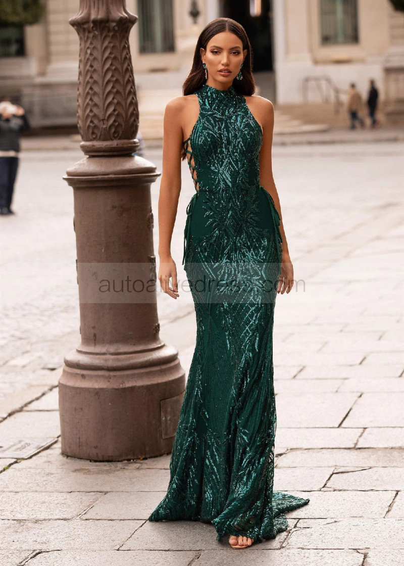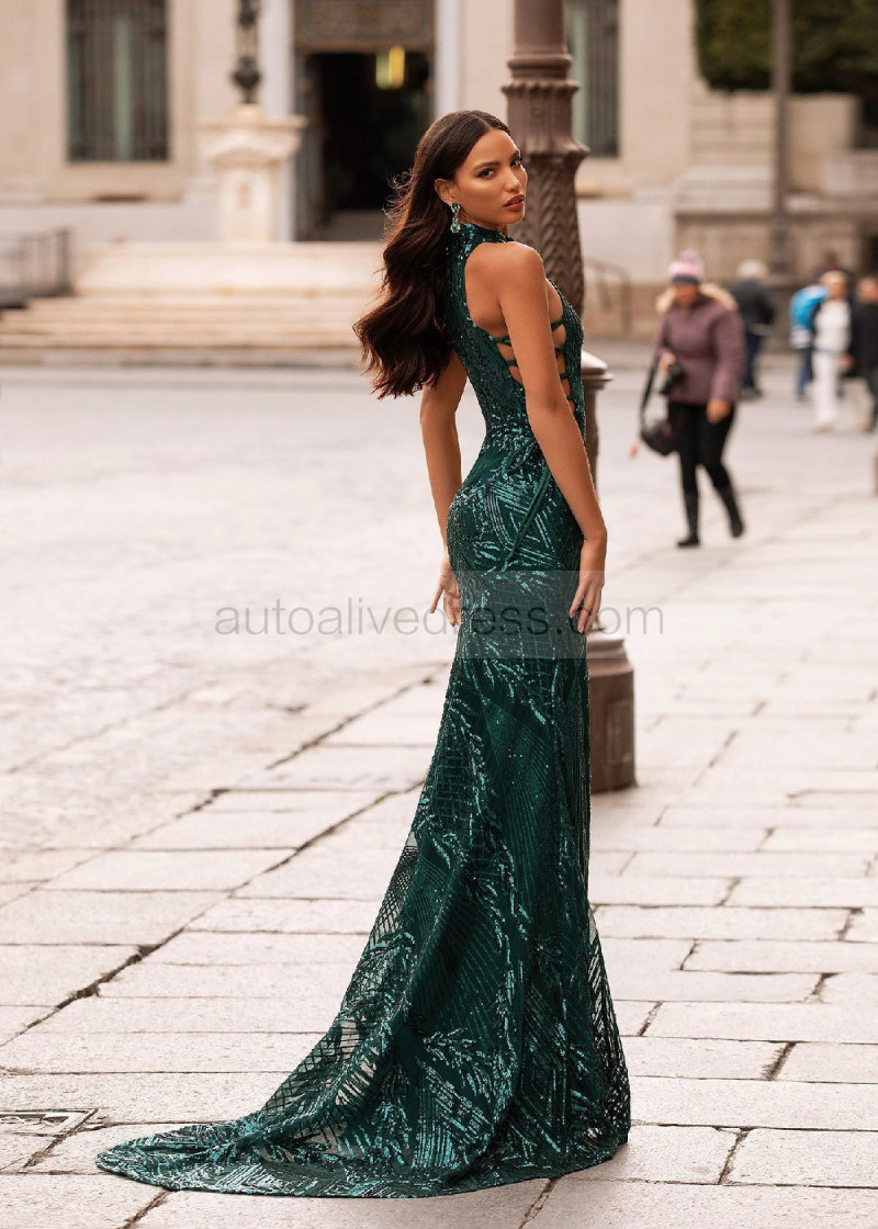 High Choker Neck Emerald Green Sequin Fashion Evening Dress