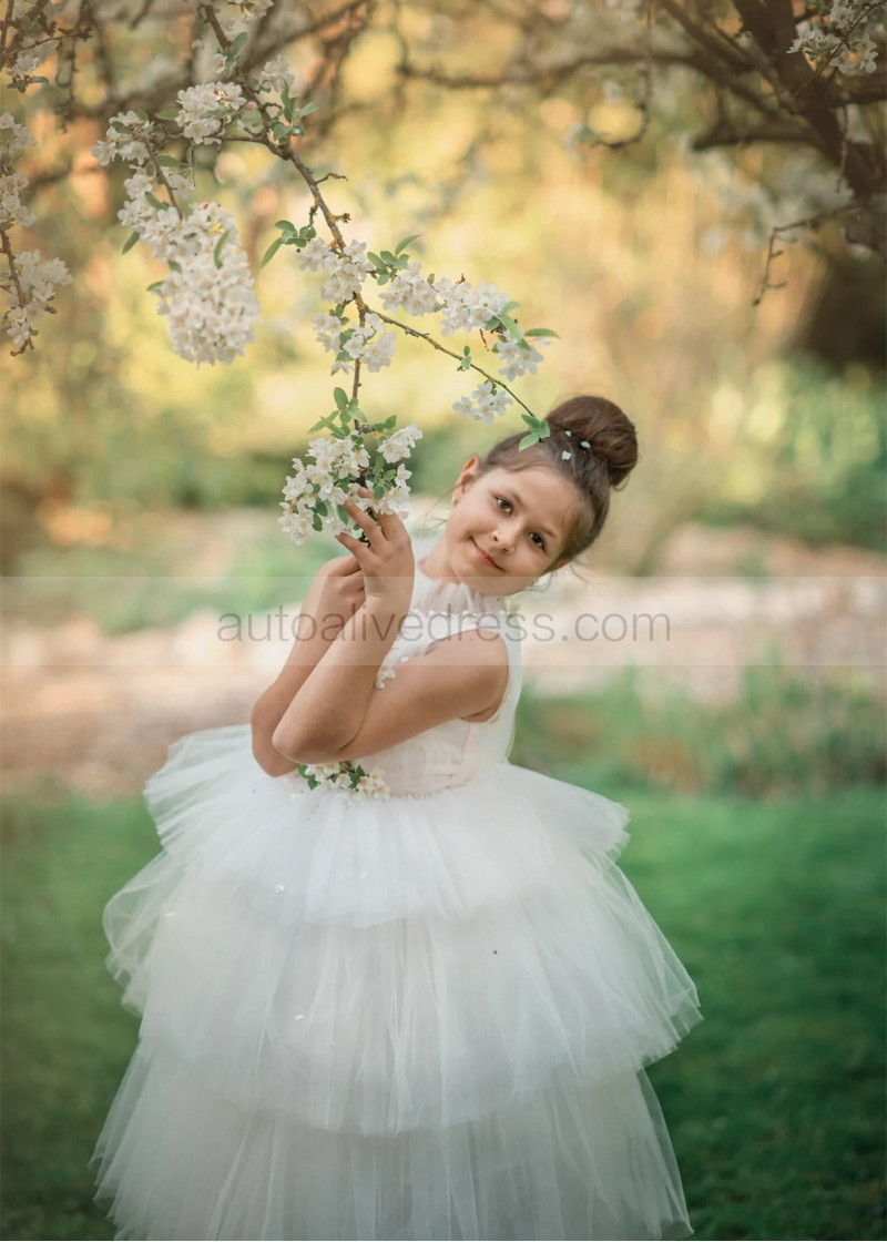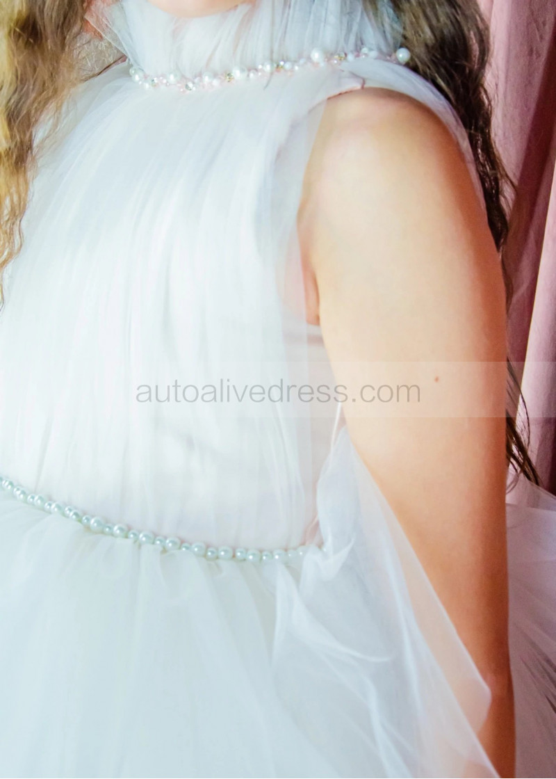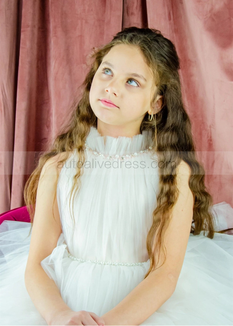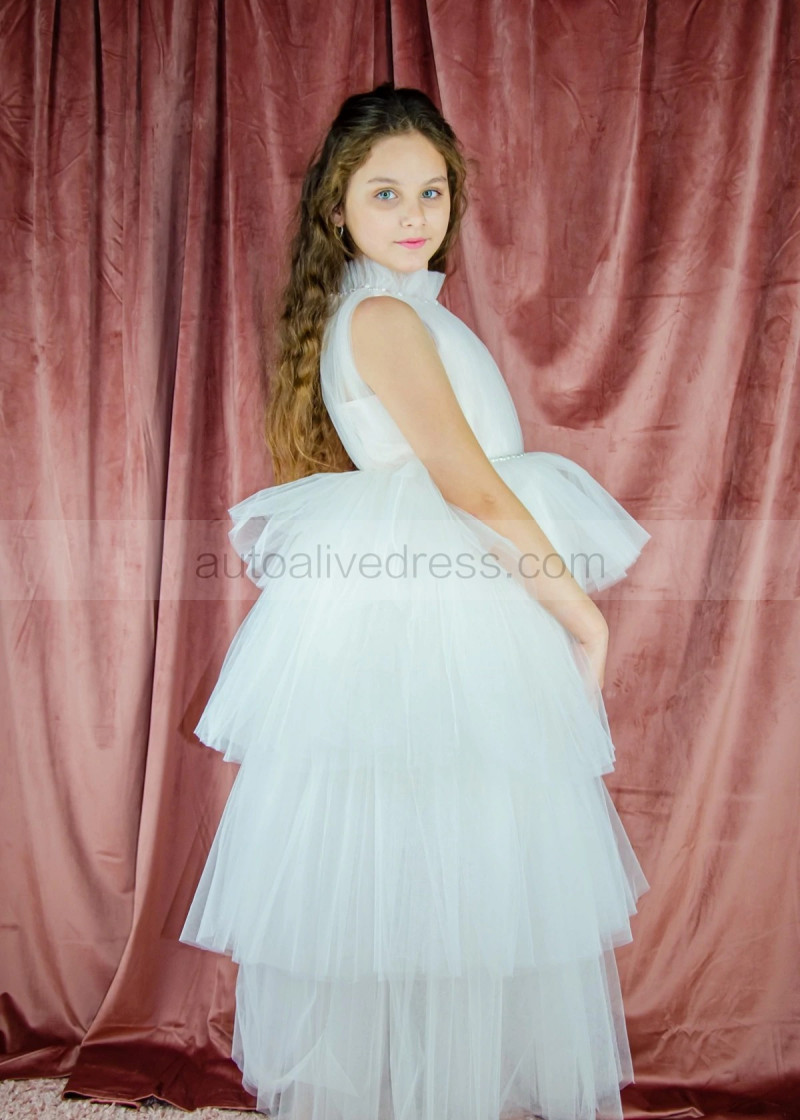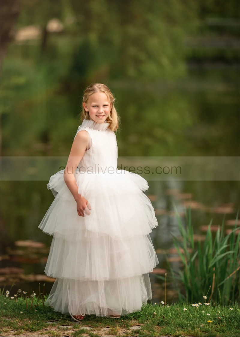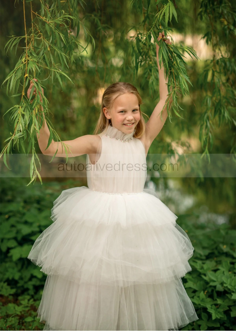High Collar Ivory Tulle Layered Pearl Embellished Flower Girl Dress