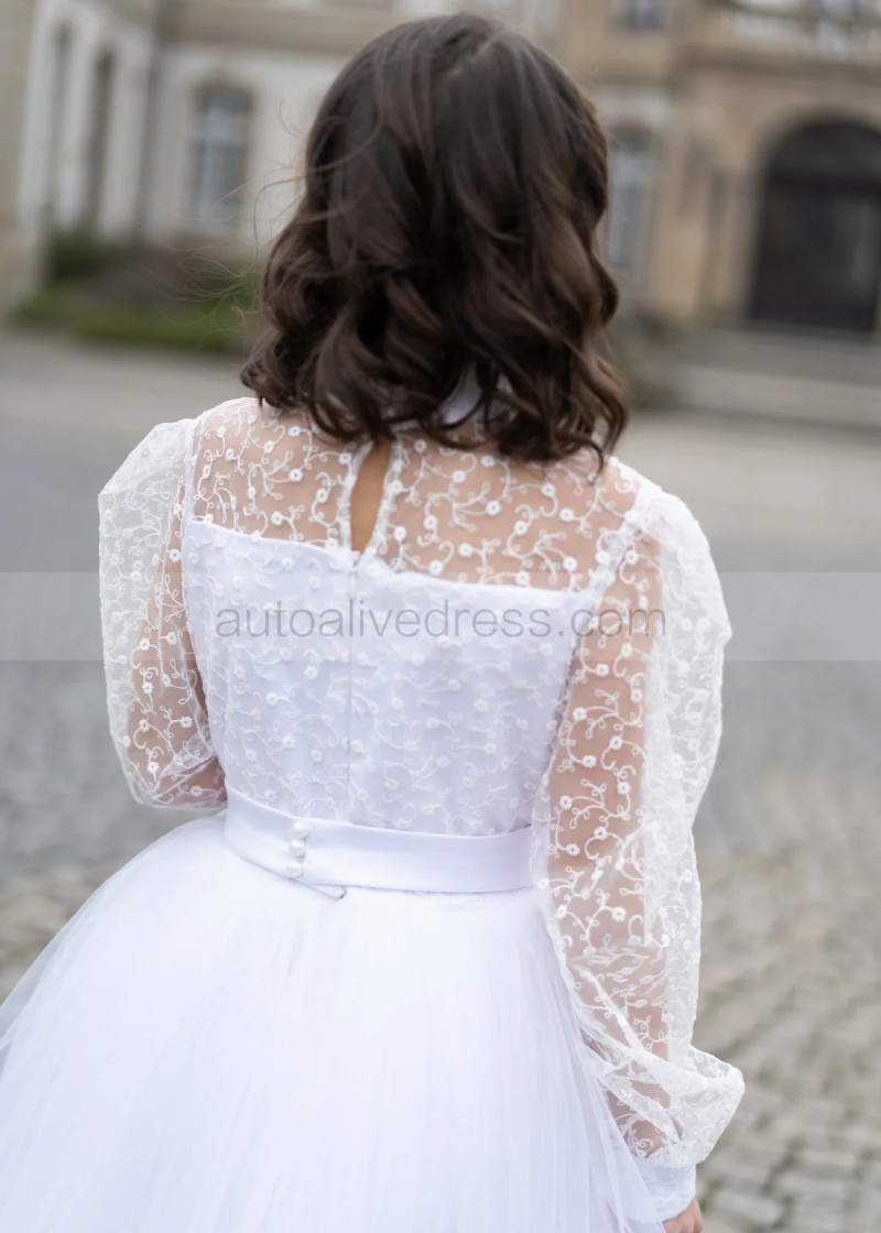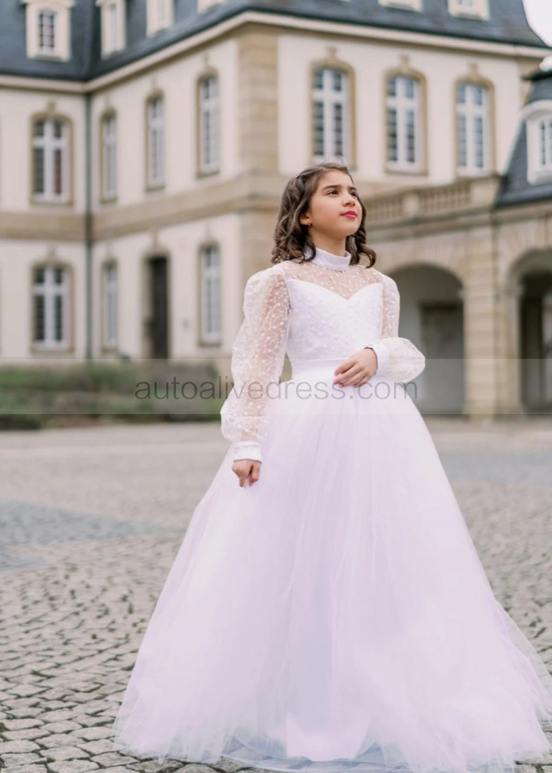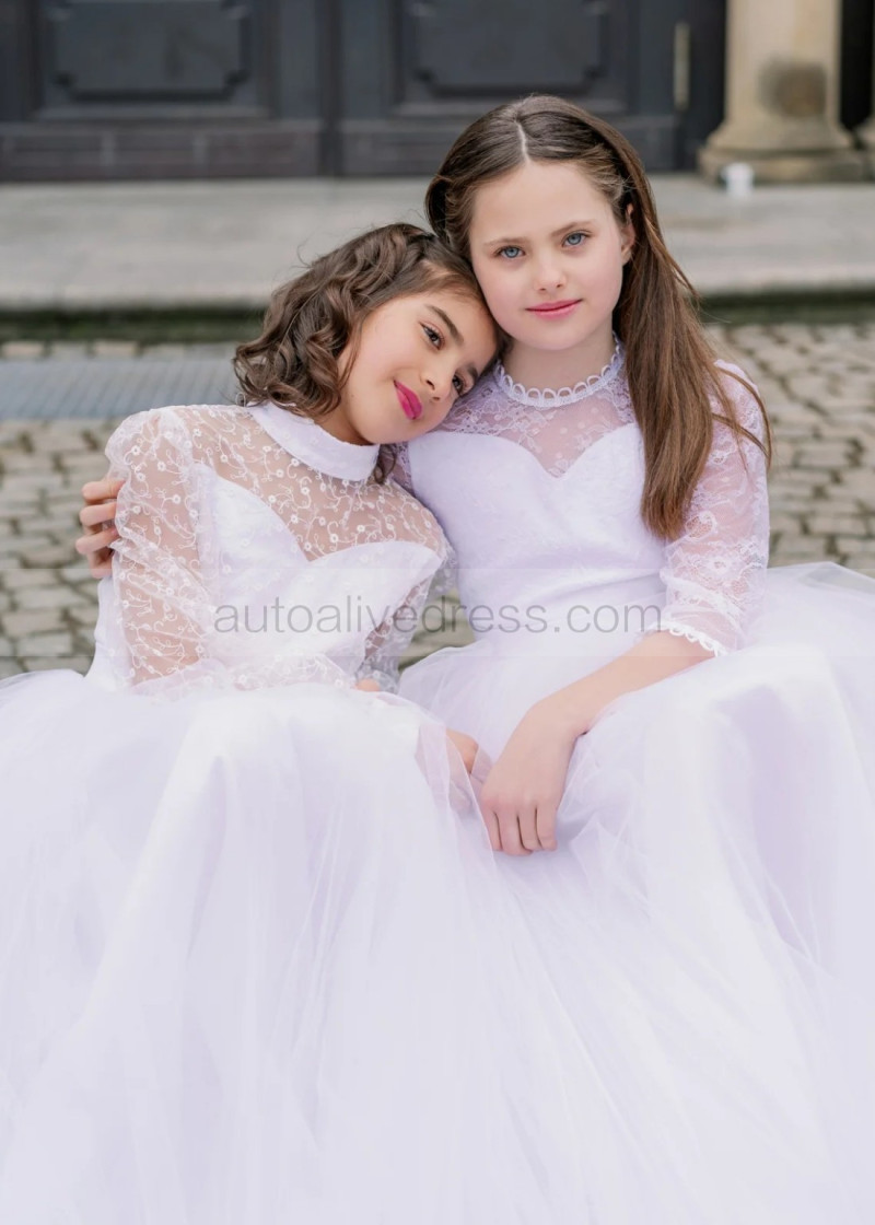 High Collar White Lace Tulle Slit Back Flower Girl Dress