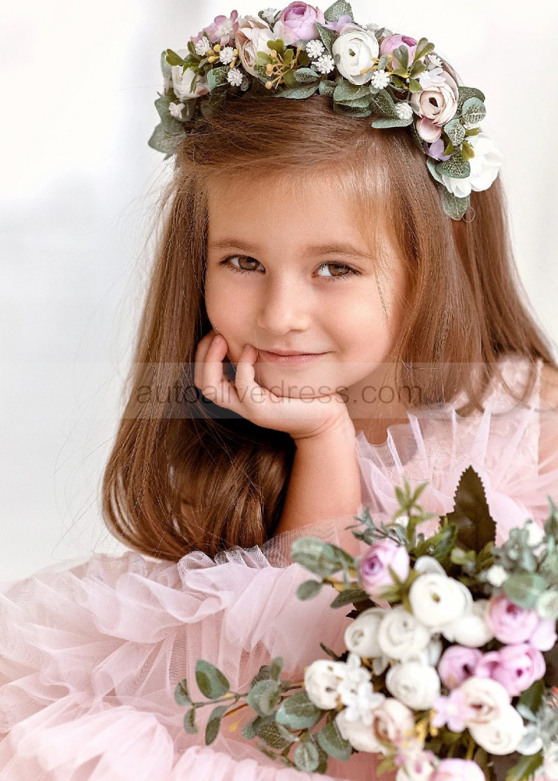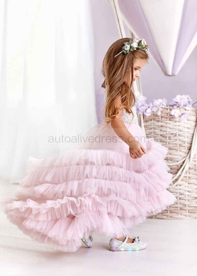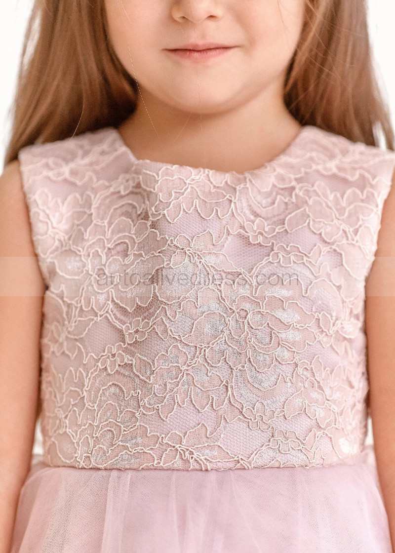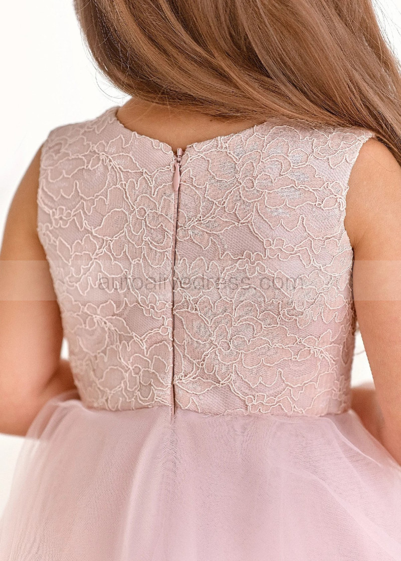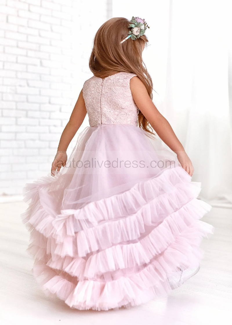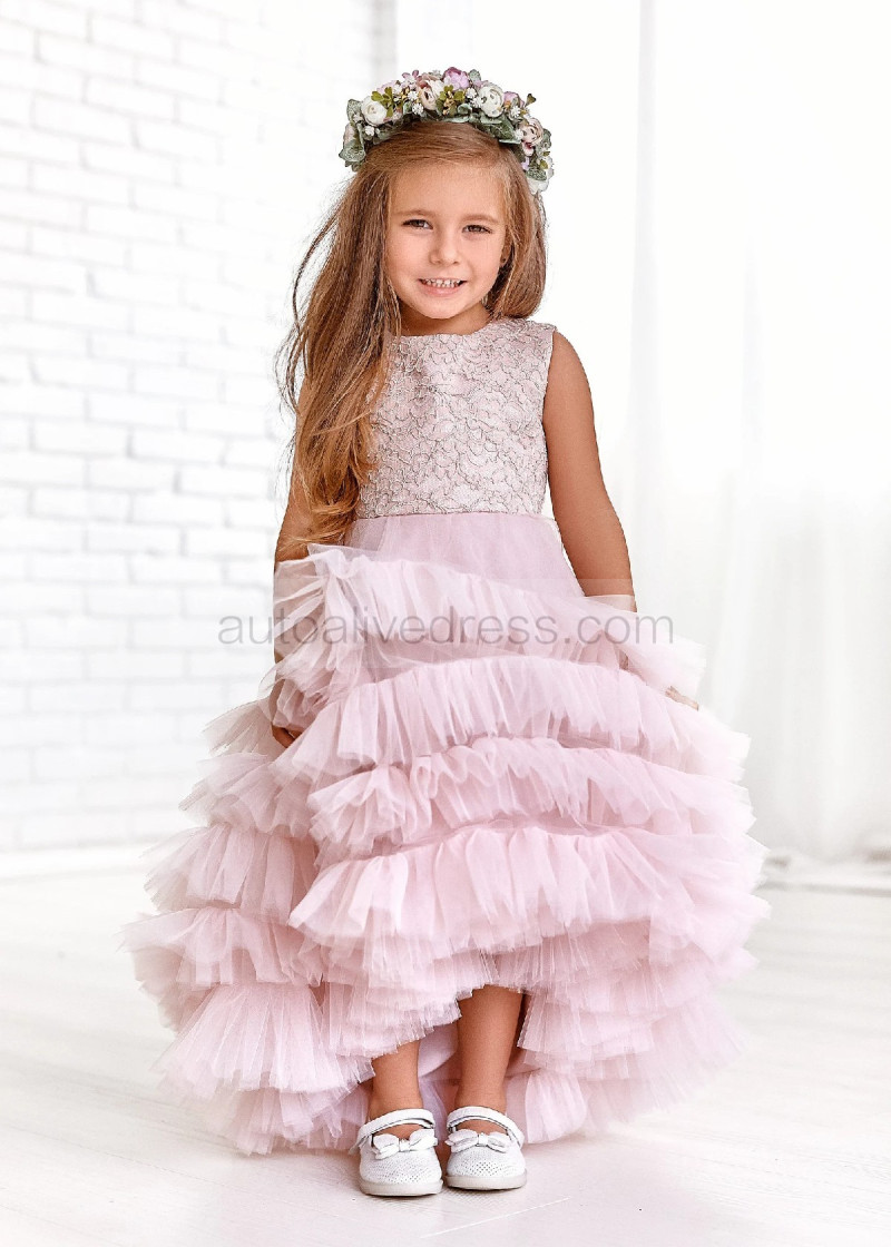 High Low Mauve Pink Lace Tulle Layered Flower Girl Dress